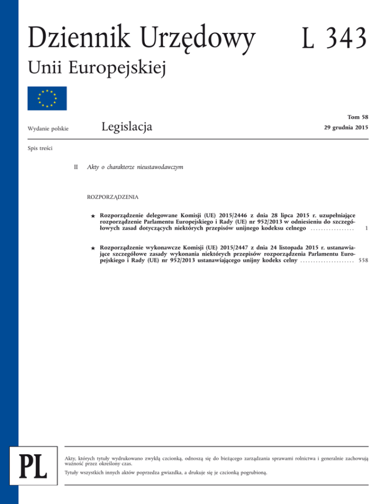 Dziennik Urzędowy Unii Europejskiej Legislacja Wydanie polskie L 343 Tom 58 29 grudnia 2015 Spis treści II Akty o charakterze nieustawodawczym ROZPORZĄDZENIA ★ ★ PL Rozporządzenie delegowane Komisji (UE) 2015/2446 z dnia 28 lipca 2015 r. uzupełniające rozporządzenie Parlamentu Europejskiego i Rady (UE) nr 952/2013 w odniesieniu do szczegó łowych zasad dotyczących niektórych przepisów unijnego kodeksu celnego . . . . . . . . . . . . . . . . . 1 Rozporządzenie wykonawcze Komisji (UE) 2015/2447 z dnia 24 listopada 2015 r. ustanawia jące szczegółowe zasady wykonania niektórych przepisów rozporządzenia Parlamentu Euro pejskiego i Rady (UE) nr 952/2013 ustanawiającego unijny kodeks celny . . . . . . . . . . . . . . . . . . . . . 558 Akty, których tytuły wydrukowano zwykłą czcionką, odnoszą się do bieżącego zarządzania sprawami rolnictwa i generalnie zachowują ważność przez określony czas. Tytuły wszystkich innych aktów poprzedza gwiazdka, a drukuje się je czcionką pogrubioną. 29.12.2015 PL Dziennik Urzędowy Unii Europejskiej L 343/1 II (Akty o charakterze nieustawodawczym) ROZPORZĄDZENIA ROZPORZĄDZENIE DELEGOWANE KOMISJI (UE) 2015/2446 z dnia 28 lipca 2015 r. uzupełniające rozporządzenie Parlamentu Europejskiego i Rady (UE) nr 952/2013 w odniesieniu do szczegółowych zasad dotyczących niektórych przepisów unijnego kodeksu celnego KOMISJA EUROPEJSKA, uwzględniając Traktat o funkcjonowaniu Unii Europejskiej, w szczególności jego art. 290, uwzględniając rozporządzenie Parlamentu Europejskiego i Rady (UE) nr 952/2013 z dnia 9 października 2013 r. ustanawiające unijny kodeks celny (1), w szczególności jego art. 2, 7, 10, 24, 31, 36, 40, 62, 65, 75, 88, 99, 106, 115, 122, 126, 131, 142, 151, 156, 160, 164, 168, 175, 180, 183, 186, 196, 206, 212, 216, 221, 224, 231, 235, 253, 265, a także mając na uwadze, co następuje: (1) Rozporządzenie (UE) nr 952/2013 („kodeks”) przyznaje Komisji, zgodnie z Traktatem o funkcjonowaniu Unii Europejskiej („TFUE”), uprawnienia do uzupełnienia innych niż istotne elementów kodeksu, zgodnie z art. 290 TFUE. Wzywa się zatem Komisję do wykonania nowych uprawnień w kontekście zmian wprowadzonych Trak tatem z Lizbony, aby doprecyzować przepisy kodeksu i zapewnić ich właściwe stosowanie. (2) Podczas prac przygotowawczych Komisja przeprowadziła stosowne konsultacje, w tym na poziomie ekspertów oraz z zainteresowanymi stronami, które aktywnie przyczyniły się do przygotowania niniejszego rozporządzenia. (3) W kodeksie promuje się wykorzystanie technologii informacyjno-komunikacyjnych, zgodnie z decyzją Parlamentu Europejskiego i Rady nr 70/2008/WE (2), które mają istotne znaczenie dla ułatwienia wymiany handlowej i równo cześnie umożliwiają zapewnienie skuteczności kontroli celnych, przyczyniając się w ten sposób do zmniejszenia kosztów przedsiębiorstw oraz poziomu ryzyka dla społeczeństwa. W związku z tym każda wymiana informacji między organami celnymi oraz między przedsiębiorcami i organami celnymi, a także przechowywanie takich informacji przy użyciu technik elektronicznego przetwarzania danych, wymagają specyfikacji dotyczących systemów informacyjnych służących do przechowywania i przetwarzania informacji celnych oraz określenia zakresu i celu systemów teleinformatycznych, które mają zostać wprowadzone w porozumieniu między Komisją a państwami członkowskimi. Należy również dostarczyć bardziej szczegółowych informacji odnośnie do szcze gólnych systemów związanych z formalnościami i procedurami celnymi lub – w przypadku systemów, w których zharmonizowany interfejs UE jest zdefiniowany jako element systemu oferującego bezpośredni i zharmonizowany na poziomie UE dostęp do danych handlowych – istniejących w formie usługi zintegrowanej z elektronicznym systemem celnym. (4) Procedury oparte na systemach teleinformatycznych ustanowionych w rozporządzeniu Komisji (EWG) nr 2454/93 (3) i stosowane już w dziedzinie przywozu, wywozu i tranzytu okazały się skuteczne. W związku z tym należy zapewnić dalsze stosowanie tych przepisów. (1) Dz.U. L 269 z 10.10.2013, s. 1. (2) Decyzja Parlamentu Europejskiego i Rady nr 70/2008/WE z dnia 15 stycznia 2008 r. w sprawie eliminowania papierowej formy dokumentów w sektorach ceł i handlu (Dz.U. L 23 z 26.1.2008, s. 21). (3) Rozporządzenie Komisji (EWG) nr 2454/93 z dnia 2 lipca 1993 r. ustanawiające przepisy w celu wykonania rozporządzenia Rady (EWG) nr 2913/92 ustanawiającego Wspólnotowy Kodeks Celny (Dz.U. L 253 z 11.10.1993, s. 1). L 343/2 PL Dziennik Urzędowy Unii Europejskiej 29.12.2015 (5) Aby ułatwić oraz zharmonizować korzystanie z technik elektronicznego przetwarzania danych, należy ustanowić wspólne wymogi dotyczące danych dla każdego obszaru, w którym stosowane będą te techniki przetwarzania danych. Wspólne wymogi dotyczące danych powinny być zgodne z obowiązującymi unijnymi i krajowymi przepisami dotyczącymi ochrony danych. (6) Aby zapewnić równe warunki działania operatorom pocztowym i pozostałym operatorom, należy przyjąć jedno lite ramy dla odprawy celnej przesyłek z korespondencją i przesyłek pocztowych, tak aby możliwe było korzys tanie z systemów teleinformatycznych. W celu zapewnienia ułatwień w handlu przy jednoczesnym zapobieganiu nadużyciom i ochronie praw konsumentów należy ustanowić odpowiednie i wykonalne przepisy dotyczące zgło szeń celnych dotyczących przesyłek pocztowych, w których zostanie odpowiednio uwzględnione zobowiązanie operatorów pocztowych do świadczenia powszechnych usług pocztowych zgodnie z aktami Światowego Związku Pocztowego. (7) Aby osiągnąć dodatkową elastyczność dla przedsiębiorców i organów celnych, powinno być możliwe dopusz czenie do korzystania środków innych niż techniki elektronicznego przetwarzania danych, w sytuacjach, w których ograniczone jest ryzyko nadużyć fina