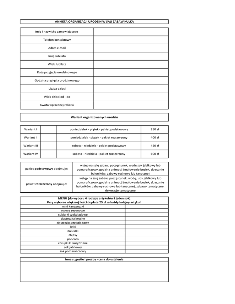 ANKIETA ORGANIZACJI URODZIN W SALI ZABAW KULKA Imię i nazwisko zamawiającego Telefon kontaktowy Adres e-mail Imię Jubilata Wiek Jubilata Data przyjęcia urodzinowego Godzina przyjęcia urodzinowego Liczba dzieci Wiek dzieci od - do Kwota wpłaconej zaliczki Wariant organizowanych urodzin Wariant I poniedziałek - piątek - pakiet podstawowy 250 zł Wariant II poniedziałek - piątek - pakiet rozszerzony 400 zł Wariant III sobota - niedziela - pakiet podstawowy 450 zł Wariant IV sobota - niedziela - pakiet rozszerzony 600 zł pakiet podstawowy obejmuje: wstęp na salę zabaw, poczęstunek, wodę,sok jabłkowy lub pomarańczowy, godzina animacji (malowanie buziek, skręcanie baloników, zabawy ruchowe lub taneczne) pakiet rozszerzony obejmuje: wstęp na salę zabaw, poczęstunek, wodę, sok jabłkowy lub pomarańczowy, godzina animacji (malowanie buziek, skręcanie baloników, zabawy ruchowe lub taneczne), zabawy tematyczne, dekoracje tematyczne MENU (do wyboru 4 rodzaje artykułów i jeden sok). Przy wyborze większej ilości dopłata 25 zł za każdy kolejny artykuł. mini kanapeczki owoce sezonowe cukierki czekoladowe ciasteczka kruche ciasteczka czekoladowe żelki paluszki chipsy popcorn chrupki kukurydziane sok jabłkowy sok pomarańczowy Inne sugestie i prośby - cena do ustalenia