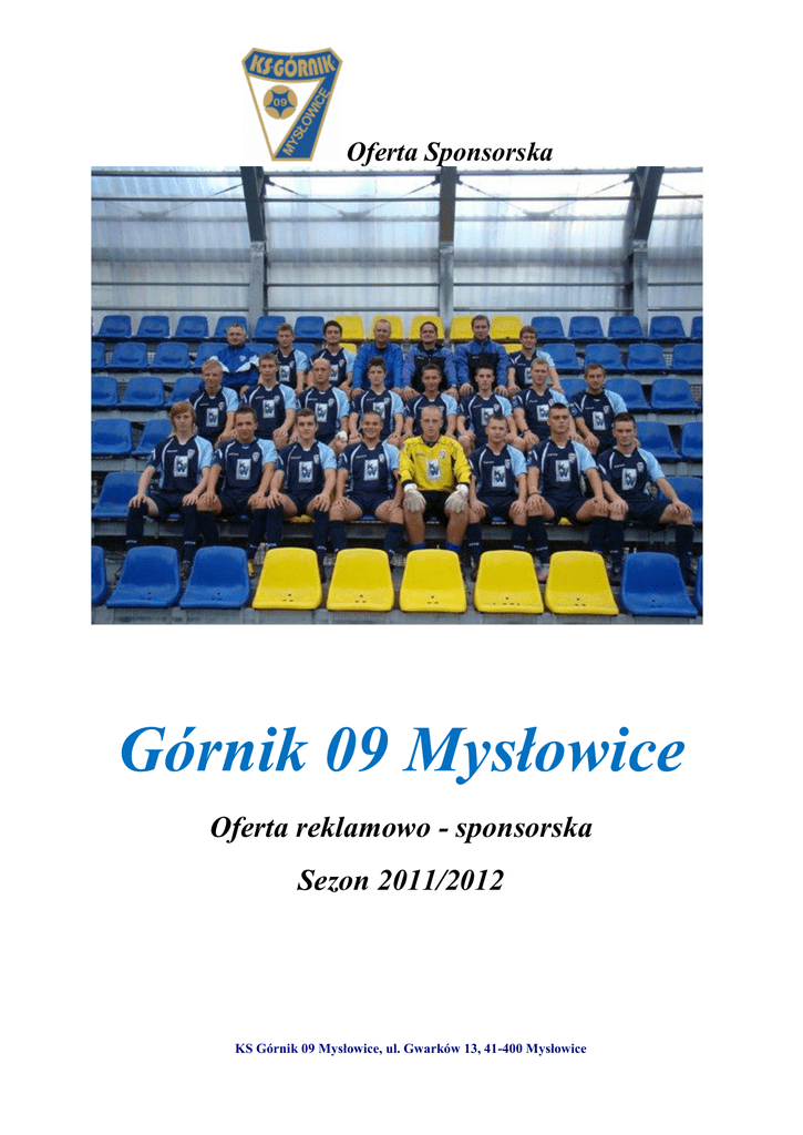 Oferta Sponsorska Górnik 09 Mysłowice Oferta reklamowo - sponsorska Sezon 2011/2012 KS Górnik 09 Mysłowice, ul. Gwarków 13, 41-400 Mysłowice Oferta Sponsorska Szanowni Państwo! Piłka nożna od wielu lat jest najpopularniejszą dyscypliną sportową w wielu krajach i ma najbardziej rozbudowane rozgrywki w skali świata. Na całym świecie bierze w nich udział 265 milionów zawodników i zawodniczek należących do 207 lokalnych związków zrzeszonych w FIFA. W Polsce piłka nożna jest najpopularniejszym sportem od kilkudziesięciu lat. Obecnie, ponad 400 tys. Polek i Polaków grywa w nią regularnie. Miasto Mysłowice jest współtwórcą tych imponujących statystyk. W jego obrębie działa Klub Piłkarski Górnik 09 Mysłowice, który został założony w roku 1909. Od początku swojego istnienia był związany z Kopalnią Węgla Kamiennego w Mysłowicach . Sport ma istotne znaczenie dla życia człowieka. Jednak w społeczeństwie, które podlega nieustannym zmianom, oblicze sportu także się zmienia. W czasach, gdy wzrost gospodarczy jest zagadnieniem kluczowym, oddziaływanie gospodarki na sport także zyskuje na znaczeniu. W ostatnich kilkunastu latach, po wielu kryzysach, związanych przede wszystkim z trudnością w pozyskiwaniu środków finansowych, rozwój sportu kwalifikowanego w Mysłowicach dotyczy kilku dyscyplin sportowych. Obecnie szczególnie dobrze rozwijają się dyscypliny uprawiane pod dachem. Chcąc stworzyć dogodne warunki do uprawiania sportu wyczynowego zawodnikom utalentowanym w młodym i dojrzałym wieku, musimy liczyć na wsparcie finansowe fundatorów, darczyńców, sponsorów czy filantropów. Pozwólmy zawodnikom na osiąganie najwyższych wyników w klubach mysłowickich, bez konieczności migracji do innych ośrodków sportowych. Poprawmy wydolność i sprawność fizyczną dzieci, ograniczymy tendencję do siedzącego trybu życia, zmniejszmy liczbę zjawisk patologicznych oraz agresji w szczególności wśród młodzieży. Wierzymy, że dalsza część niniejszej oferty zachęci Państwa do podjęcia wspólnego wysiłku na rzecz rozwoju sportu oraz na rzecz poprawy kondycji fizycznej i zdrowotnej naszego społeczeństwa. KS Górnik 09 Mysłowice, ul. Gwarków 13, 41-400 Mysłowice Oferta Sponsorska Z historii klubu … Pierwotnie nazwany Klub Sportowy Mysłowice 1909, skupiał początkowo głównie górników Kopalni Mysłowice oraz ich rodziny. Klub był wtedy jednosekcyjny i jego działalność ograniczała się do rozgrywania spotkań piłkarskich. Na początku mecze odbywały się na łąkach położonych nieopodal Huty Zofia. Po roku wytyczono jednak teren w tzw. Ogrodzie Zamkowym, czyli dzisiejszym mysłowickim parku. Wcześniej znajdowały się tam stawy i osady mułu. Zawodnicy i kibice klubu sami jednak skierowali odpływ wody do Czarnej Przemszy i osuszyli teren pod dzisiejsze boisko Górnika 09. Pierwszy sukces drużyny, która występowała w niższych klasach rozgrywkowych, to zwycięstwo w 1919 roku w Pucharze Maksa Weichmanna, który odbywał się w okresie dwudziestolecia międzywojennego. Maks Weichmann był jednym z najbardziej wpływowych ludzi na Śląsku. Olbrzymią fortunę zbił na werbowaniu ludzi na rzecz wielkich towarzystw okrętowych, a także na "handlu dziewczętami", które wysyłał do Buenos Aires - pisze w monografii poświęconej mysłowickiemu klubowi Alfred Sulik. Szybka odbudowa drużyny zaczęła się po II wojnie światowej. Początki były trudne, kłopoty rozwiązywano w najróżniejszy sposób. Buty piłkarskie wykonywano z obuwia roboczego, zrywając obcas i wbijając w jego miejsce prymitywne kołki. Z pozostałych po wojnie flag faszystowskich szyto stroje dla zespołu. Z czasem coraz większą opiekę nad klubem przejmowała kopalnia. Miało to dobre, ale i złe strony. Po przegranym meczu piłkarze ze strachem przychodzili w poniedziałek do pracy. Musieli tłumaczyć się z niepowodzeń, bądź po prostu przydzielano im cięższą robotę. Klub był związany z kopalnią Mysłowice przez cały okres swojej działalności. Dopiero koniec lat 80. i zmiany polityczne w kraju przyniosły pogorszenie sytuacji Górnika - opowiada Piotr Mrozik, działacz klubu. W Górniku 09 rozpoczynało karierę kilku piłkarzy, którzy po latach - ale już w innych barwach - stali się znani w całym kraju. Henryk Bożek to pierwszy wychowanek klubu, który wystąpił w reprezentacji. Po przejściu do Garbarni Kraków ten środkowy napastnik rozegrał w 1950 roku dwa mecze w drużynie narodowej. W reprezentacji występował także inny wychowanek 09 Jerzy Wijas, potem zawodnik m.in. GKS Katowice i Widzewa KS Górnik 09 Mysłowice, ul. Gwarków 13, 41-400 Mysłowice Oferta Sponsorska Łódź. Kolejni znani piłkarze, którzy bronili kiedyś barw Górnika, to: Franciszek Sput (legendarny bramkarz GKS Katowice), Jerzy Kapias (Katowice), Grzegorz Waliczek (Ruch Chorzów, Zagłębie Sosnowiec) czy Wojciech Grzyb, z powodzeniem grający obecnie w Ruchu Chorzów. Największym sukcesem piłkarzy Górnika 09 Mysłowice są występy w trzeciej lidze. Po raz pierwszy tak wysoko mysłowiczanie awansowali w sezonie 1979/80. Klub może również pochwalić się m.in. sekcją hokeja na lodzie, która w okresie dwudziestolecia międzywojennego nawiązywała równorzędną walkę z najsilniejszymi klubami w Polsce. W sezonie 1937/38 do Mysłowic przyjechał m. in. czołowy w Europie klub BBC Budapeszt. Mimo że w barwach KS 09 zagrał gościnnie Kanadyjczyk Frank Ney z Dębu Katowice, goście wygrali aż 6:1. Obecnie klub po kłopotach finansowych i reorganizacji stał się jednosekcyjnym klubem piłkarskim. Nowy klub podtrzymuje tradycje mysłowickiej piłki nożnej. Jest największym klubem piłkarskim w gminie Mysłowice. Czym jest Klub Piłkarski Górnik 09 Mysłowice? Odpowiedź na to pytanie jest inna w zależności od adresata. Dla kibiców jest częścią życia, dla zawodników, którzy w nim trenują - domem, a dla spons