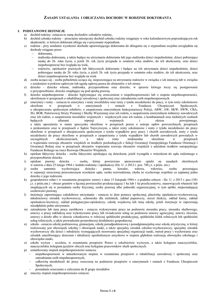 ZASADY USTALANIA I OBLICZANIA DOCHODU W RODZINIE DOKTORANTA I. PODSTAWOWE DEFINICJE a) dochód rodziny- oznacza to sumę dochodów członków rodziny, b) dochód członka rodziny – przeciętny miesięczny dochód członka rodziny osiągnięty w roku kalendarzowym poprzedzającym rok akademicki, w którym doktorant ubiega się o przyznanie stypendium. c) rodzina - przy ustalaniu wysokości dochodu uprawniającego doktoranta do ubiegania się o stypendium socjalne uwzględnia się dochody osiągane przez: doktoranta, małżonka doktoranta, a także będące na utrzymaniu doktoranta lub jego małżonka dzieci niepełnoletnie, dzieci pobierające naukę do 26. roku życia, a jeżeli 26. rok życia przypada w ostatnim roku studiów, do ich ukończenia, oraz dzieci niepełnosprawne bez względu na wiek, rodziców, opiekunów prawnych lub faktycznych doktoranta i będące na ich utrzymaniu dzieci niepełnoletnie, dzieci pobierające naukę do 26. roku życia, a jeżeli 26. rok życia przypada w ostatnim roku studiów, do ich ukończenia, oraz dzieci niepełnosprawne bez względu na wiek. d) osoba ucząca się - osoba pełnoletnia ucząca się, niepozostająca na utrzymaniu rodziców w związku z ich śmiercią lub w związku z ustaleniem wyrokiem sądowym lub ugodą sądową prawa do alimentów z ich strony. e) dziecko - dziecko własne, małżonka, przysposobione oraz dziecko, w sprawie którego toczy się postępowanie o przysposobienie, dziecko znajdujące się pod opieką prawną. f) dziecko niepełnosprawne - dziecko legitymujące się orzeczeniem o niepełnosprawności lub o stopniu niepełnosprawności, określonym w przepisach o rehabilitacji zawodowej i społecznej oraz zatrudnieniu osób niepełnosprawnych. g) emerytury i renty – oznacza to emerytury i renty inwalidzkie oraz renty z tytułu niezdolności do pracy, w tym renty szkoleniowe określone w przepisach o emeryturach i rentach z Funduszu Ubezpieczeń Społecznych, o ubezpieczeniu społecznym rolników, o zaopatrzeniu emerytalnym funkcjonariuszy Policji, ABW, AW, SKW, SWW, CBA, SG, BOR, Państwowej Straży Pożarnej i Służby Więziennej oraz ich rodzin, o zaopatrzeniu emerytalnym żołnierzy zawodowych oraz ich rodzin, o zaopatrzeniu inwalidów wojennych i wojskowych oraz ich rodzin, o kombatantach oraz niektórych osobach będących ofiarami represji wojennych i okresu powojennego, a także uposażenia w stanie spoczynku określone w przepisach prawa o ustroju sądów powszechnych, przepisach o prokuraturze oraz w przepisach o Sądzie Najwyższym, a także renty szkoleniowe i renty z tytułu niezdolności do pracy określone w przepisach o ubezpieczeniu społecznym z tytułu wypadków przy pracy i chorób zawodowych, renty z tytułu niezdolności do pracy określone w przepisach o zaopatrzeniu z tytułu wypadków lub chorób zawodowych powstałych w szczególnych okolicznościach, a także renty strukturalne określone w przepisach o wspieraniu rozwoju obszarów wiejskich ze środków pochodzących z Sekcji Gwarancji Europejskiego Funduszu Orientacji i Gwarancji Rolnej oraz w przepisach obszarów wspieraniu rozwoju obszarów wiejskich z udziałem środków europejskiego Funduszu Rolnego na rzecz Rozwoju Obszarów Wiejskich. h) opiekun faktyczny dziecka - osoba faktycznie opiekująca się dzieckiem, jeżeli wystąpiła z wnioskiem do sądu rodzinnego o przysposobienie dziecka. i) opiekun prawny dziecka – osoba, której powierzono sprawowanie opieki na zasadach określonych w ustawie z dnia 25 lutego 1964 r. kodeks rodzinny i opiekuńczy (Dz. U. z 2012 r. poz. 788 j.t. z późn. zm.) j) osoba samotnie wychowująca dziecko panna, kawaler, wdowa, wdowiec, osoba pozostająca w separacji orzeczonej prawomocnym wyrokiem sądu, osoba rozwiedziona, chyba że wychowuje wspólnie co najmniej jedno dziecko z jego rodzicem. k) gospodarstwo rolne ( w rozumieniu przepisów ustawy z dnia 15 listopada 1984 r. o podatku rolnym - Dz. U. z 2013 r. poz.1381 j.t. z późn.zm.) - obszar gruntów o łącznej powierzchni przekraczającej 1 ha lub 1 ha przeliczeniowy, stanowiących własność lub znajdujących się w posiadaniu osoby fizycznej, osoby prawnej albo jednostki organizacyjnej, w tym spółki, nieposiadającej osobowości prawnej. l) instytucja zapewniająca całodobowe utrzymanie - oznacza to dom pomocy społecznej, placówkę opiekuńczo-wychowawczą, młodzieżowy ośrodek wychowawczy, schronisko dla nieletnich, zakład poprawczy, areszt śledczy, zakład karny, zakład opiekuńczo-leczniczy, zakład pielęgnacyjno-opiekuńczy, szkołę wojskową lub inną szkołę, jeżeli instytucje te zapewniają nieodpłatnie pełne utrzymanie. m) zatrudnienie lub inna praca zarobkowa - oznacza wykonywanie pracy na podstawie stosunku pracy, stosunku służbowego, umowy o pracę nakładczą oraz wykonywanie pracy lub świadczenie usług na podstawie umowy agencyjnej, umowy zlecenia, umowy o dzieło albo w okresie członkostwa w rolniczej spółdzielni produkcyjnej, spółdzielni kółek rolniczych lub spółdzielni usług rolniczych, a także prowadzenie pozarolniczej działalności gospodarczej. n) szkoła - oznacza szkołę podstawową, gimnazjum, szkołę ponadpodstawową i ponadgimnazjalną oraz szkołę artystyczną, w której realizowany jest obowiązek szkolny i obowiązek nauki, a także specjalny ośrodek szkolno-wychowawczy, specjalny ośrodek wychowawczy dla dzieci i młodzieży wymagających stosowania specjalnej organizacji nauki, metod pracy i wychowania oraz ośrodek umożliwiający dzieciom i młodzieży upośledzonym umysłowo w stopniu głębokim realizację obowiązku szkolnego i obowiązku nauki, o) szkoła wyższa - uczelnia, w rozumieniu przepisów Prawo o szkolnictwie wyższym, a także kolegium nauczycielskie, nauczycielskie kolegium języków obcych oraz kolegium pracowników służb społecznych. p) umiarkowany stopień niepełnosprawności oznacza: niepełnosprawność w umiarkowanym stopniu w rozumieniu przepisów o