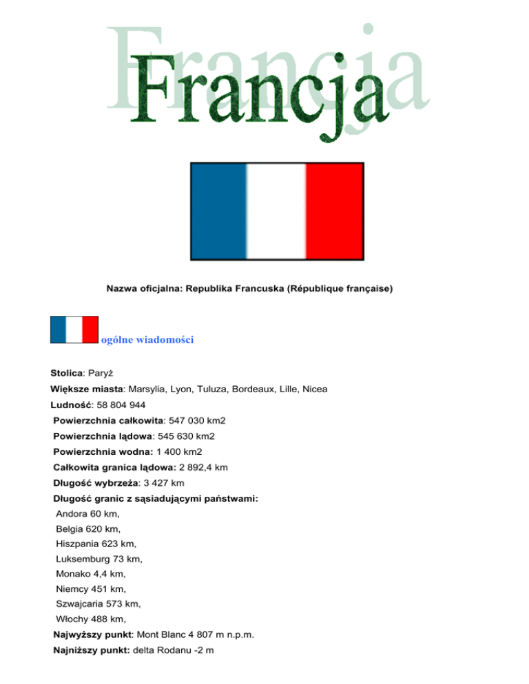 Nazwa oficjalna: Republika Francuska (République française) ogólne wiadomości Stolica: Paryż Większe miasta: Marsylia, Lyon, Tuluza, Bordeaux, Lille, Nicea Ludność: 58 804 944 Powierzchnia całkowita: 547 030 km2 Powierzchnia lądowa: 545 630 km2 Powierzchnia wodna: 1 400 km2 Całkowita granica lądowa: 2 892,4 km Długość wybrzeża: 3 427 km Długość granic z sąsiadującymi państwami: Andora 60 km, Belgia 620 km, Hiszpania 623 km, Luksemburg 73 km, Monako 4,4 km, Niemcy 451 km, Szwajcaria 573 km, Włochy 488 km, Najwyższy punkt: Mont Blanc 4 807 m n.p.m. Najniższy punkt: delta Rodanu -2 m Język urzędowy: francuski, Inne języki w użyciu: bretoński, prowansalski, baskijski, korsykański Kod ISO 3166: FR Kod samochodowy: F Waluta: 1 euro = 100 centów Podział administracyjny: 22 regiony i 96 departamentów. Położenie i cechy geograficzne Francji Francja jest największym i najbardziej zróżnicowanym krajem Europy Zachodniej. Ciągnie się od pofałdowanych równin północy po nieregularne grzbiety Pirenejów, od poszarpanego wybrzeża Bretanii ku czystym, lazurowym jeziorom i lodowcom Alp. Jest tym samym jedynym krajem Europy należącym geograficznie zarówno do północy, jak i do południa – posiadając jednocześnie wybrzeże atlantyckie i śródziemnomorskie. Istnieje tu znaczna różnorodność ziem oraz krajobrazu, klimatu i roślinności. Francja zajmuje obszar 551 000 km2 i jest trzecim co do wielkości krajem Europy po Rosji i Ukrainie. Przypomina sześciokąt niemal z każdej strony otoczony morzem, bądź łańcuchami górskimi. Wyjątek stanowi granica północno-wschodnia, która jest prawie równinnym pasem na styku z Niemcami, Luksemburgiem i Belgią. Linia brzegowa Francji liczy ok. 3200 km i jest bardzo zróżnicowana, począwszy od kredowych, białych klifów Normandii i charakterystycznych dla Bretanii przylądków, a skończywszy na łagodnych, piaszczystych plażach Atlantyku. Plaże śródziemnomorskie są przeważnie kamieniste, a nawet skaliste, z wyjątkiem Langwedocji i niektórych plaż Roussillon. Główne rzeki Francji to Sekwana, Loara, Rodan i Ren. Znaczną część kraju zajmują obszary górzyste, zaliczane do najpiękniejszych w Europie. Alpy Francuskie, na terenie których wznosi się najwyższy szczyt Europy, Mont Blanc (4807m), ciągną się wzdłuż wschodniej granicy Francji , od Jeziora Genewskiego w kierunku Lazurowego Wybrzeża. Powyżej 2800 m zaczyna się strefa wiecznych śniegów. Jura – łagodny łańcuch gór wapiennych na północ od Alp, którego szczyty osiągają wysokość ponad 1700 m, biegnie wzdłuż granicy szwajcarskiej na północ od Jeziora Genewskiego. Pireneje ciągną się wzdłuż całej 450kilometrowej granicy z Hiszpanią. Pomimo, że najwyższy szczyt Pirenejów ma zaledwie 3404 m ich stoki są często równie niedostępne jak w Alpach. Alpy, Pireneje i Jura to dosyć młode góry w porównaniu z bardzo starymi masywami, które ukształtowały się ok. 225 – 345 mln lat temu. Największy z nich to Masyw Centralny – rozległy region środkowej Francji, znany z licznych wygasłych wulkanów. Do innych starych masywów francuskich należą Wogezy, Ardeny oraz Masyw Armorykański. Pokryte lasem iglastym Ardeny ciągną się w północno-wschodniej części kraju, między Alzacją a Lotaryngią. Ardeny leżą głównie na terenie Belgii i Niemiec, a część francuska na północnych obrzeżach Szampanii. Masyw Amorykański wznosi się na zachód od Normandii i oddziela ją od Bretanii. Klimat Ogólnie rzecz biorąc we Francji panuje klimat umiarkowany z łagodnymi zimami (za wyjątkiem terenów górzystych i Alzacji). Atlantyk wywiera ogromny wpływ na północno-zachodnią część kraju, zwłaszcza na Bretanię, której klimat charakteryzuje się dużą wilgotnością powietrz i znaczną ilością opadów (200 dni deszczowych). Na tym obszarze występują też długotrwałe, niekiedy porywiste wiatry zachodnie. W północno-wschodniej Francji, zwłaszcza w Alzacji, panuje klimat kontynentalny z ciepłym latem, a zimą na tyle chłodną, że śnieg zalega tutaj czasem całymi tygodniami. Najbardziej wilgotny okres z częstymi burzami przypada w Alzacji na czerwiec i lipiec. Między Bretanią a Alzacją rozciąga się równinny Basen Paryski, na który wpływ wywierają klimaty obydwu tych regionów. Chociaż charakteryzuje się najniższą roczną sumą opadów (ok. 575 mm), pory deszczowe są tutaj zmienne, tak więc zmoknąć można zarówno zimą jak i latem. Średnia roczna temperatura dla Paryża wynosi 12oC, ale w styczniu słupek rtęci może spadać poniżej zera, zaś w lipcu i sierpniu wskazywać ponad 30oC. Południowe, nadbrzeżne tereny wystawione są na działanie klimatu śródziemnomorskiego, który swym zasięgiem obejmuje również południowe Alpy, Masyw Centralny i wschodnie Pireneje. Na południu przymrozki należą do rzadkości. Występują tu za to wiosenne i jesienne ulewy – gwałtowne i krótkie, latem zazwyczaj nie pada. Natomiast w dolinie Rodanu przez 100 dni w roku wieją chłodne mistrale, które najbardziej dokuczliwe stają się wiosną. Ludność Francja liczy 58,3 mln (1998 r.) mieszkańców, z czego ponad 20% zamieszkuje region paryski. Począwszy od lat 50-tych regularnie zmniejsza się liczba osób żyjących na terenach górskich i wiejskich. Przez ostatnie 2 stulecia Francja odnotowała znacznie niższy przyrost naturalny niż jej sąsiedzi. Jednocześnie kraj ten przyjął więcej imigrantów jakiekolwiek niż inne państwo w Europie. Mapka Gospodarka Gospodarka francuska osiąga mniej więcej średni poziom Unii Europejskiej. Problemem ostatnich lat jest duże, nawet 12% bezrobocie. Francja to jeden z najbardziej uprzemysłowionych krajów świata. 40% siły roboczej zatrudnia sektor przemysłowy, z którego pochodzi ok. 50% dochodu narodowego. W przeciwieństwie do innych krajów wysoko uprzemysłowionych Francji brakuje wielkich korporacji – źr