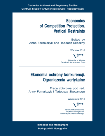 Centre for Antitrust and Regulatory Studies Centrum Studiów Antymonopolowych i Regulacyjnych Economics of Competition Protection. Vertical Restraints Edited by Anna Fornalczyk and Tadeusz Skoczny Warsaw 2016 University of Warsaw Faculty of Management Press Ekonomia ochrony konkurencji. Ograniczenia wertykalne Praca zbiorowa pod red. Anny Fornalczyk i Tadeusza Skocznego Warszawa 2016 Textbooks and Monographs PodrÚczniki i Monograğe Economics of Competition Protection. Vertical Restraints Ekonomia ochrony konkurencji. Ograniczenia wertykalne Recenzent: Prof. UE dr hab. Bożena Borkowska Katedra Mikroekonomii Instytucjonalnej, Uniwersytet Ekonomiczny we Wrocławiu Korekta i redakcja: Hanna Januszewska Projekt okładki: Dariusz Kondefer © Copyright by Wydawnictwo Naukowe Wydziału Zarządzania Uniwersytetu Warszawskiego and Authors, Warsaw 2016 ISBN: 978-83-65402-22-6 ISBN: 978-83-65402-23-3 (e-book) DOI: 10.7172/978-83-65402-23-3.2016.wwz.6 WYDAWCA: Wydawnictwo Naukowe Wydziału Zarządzania Uniwersytetu Warszawskiego 02-678 Warszawa, ul. Szturmowa 1/3 Tel. (+48-22) 55-34-164 E-mail: [email protected] www.wz.uw.edu.pl SKŁAD I ŁAMANIE: Dom Wydawniczy ELIPSA, 00-189 Warszawa, ul. Inflancka 15/198 Tel./faks (+48-22) 635-03-01; (+48-22) 635-17-85 E-mail: [email protected]; www.elipsa.pl DYSTRYBUCJA Księgarnia Ekonomiczna 02-094 Warszawa, ul. Grójecka 67 Tel. (+48-22) 822-90-42; faks (+48-22) 823-64-67 E-mail: [email protected] Księgarnia Wydziałowa Tomasz Biel Pl – 02-678 Warszawa, ul. Szturmowa 3 Tel. (+48-22) 55 34 146; kom.: (48) 501 367 976 E-mail: [email protected] Economics of Competition Protection. Vertical Restraints Edited by Anna Fornalczyk and Tadeusz Skoczny Warsaw 2016 University of Warsaw Faculty of Management Press Centre for Antitrust and Regulatory Studies University of Warsaw, Faculty of Management Sixty eighth Publication of the Publishing Programme Series: Textbooks and Monographs (22) Series editor: Prof. Dr. Tadeusz Skoczny CENTRE FOR ANTITRUST AND REGULATORY STUDIES (CARS) www.cars.wz.uw.edu.pl The Centre for Antitrust and Regulatory Studies, CARS (in Polish: Centrum Studiów Antymonopolowych i Regulacyjnych), of the University of Warsaw Faculty of Management, established in 2007, became starting from 1 October 2014 an independent organizational unit of the Faculty of Management to engage in teaching and research activities in the field of economics and law of antitrust and sector-specific regulations. CARS conducts cross and interdisciplinary academic research and development projects, provides consulting services as well as publishes books and periodicals, including the English language Yearbook of Antitrust and Regulatory Studies, YARS (www.yars.wz.uw.edu.pl) and the Polish language Antitrust and Regulation e-Quarterly, iKAR (in Polish: internetowy Kwartalnik Antymonopolowy i Regulacyjny, www.ikar.wz.uw. edu.pl). Moreover, CARS organizes scientific conferences and workshops, offers Post-graduate studies (www.aris.wz.uw.edu.pl) and an Open PhD Seminar. CARS co-operates with scientific institutions in Poland and abroad as well as with the Polish competition authority and national regulators in the energy, telecommunications and railways sectors. From the Editors This book presents the contributions to an international conference co-organised by the Polish Competition Authority (in Polish: Urzad Ochrony Konkurencji i Konsumentw, UOKiK) and the Centre for Antitrust and Regulatory Studies (CARS) of the University of Warsaw, Faculty of Management. The conference took place on the 13th and 14th October 2015 in Warsaw and gathered competition law practitioners from the US, the European Commission and a number of national competition authorities from several EU Member States. Many representatives of the academia from both Poland and abroad were also present. The participants of the conference took an active part in panel discussions, presented scientific papers and benefited from the possibility to attend many interesting exchanges of professional opinions and practical experiences. Indeed, what characterized this conference most of all, a fact also reflected in this publication, is that it represented both the theoretical as well as the practical approach to the application of economics in competition law enforcement. It is, at the same time, the first time that Poland sees a publication that offers both Polish and foreign economic and legal contributions that look for the optimal solution to the use of economic analyses and tools in the administrative decision-making process by competition authorities as well as in the judicial review process following such decisions. The possibility and indeed necessity of administrative and judicial intervention into economic activities and relations is a result of competition law. It is important for such intervention to consider economic assessments both when establishing the factual circumstances of each case as well as when designing the content of competition law decisions and following judgments. The need to economize competition law was not questioned in the conference papers, or the discussions that followed. Economists spoke here of the possibilities offered by the use of economic instruments; lawyers noted the effects of the discrepancies between 6 From the Editors the due-date for certain actions in competition law proceedings (set by applicable procedural rules) and the time-consuming nature of economic assessments. The economization of competition law requires a well-made database both on the side of competition authorities and on the side of the accused undertakings, or in fact those notifying a concentration subject to pre-emptive merger control. The first part of the conference took the form of an international seminar gathering both academics and practitioners, including high ranking officials from different competition authorities. They focused on competition restrains resulting from vertical cooperation in tr