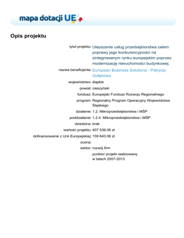 Opis projektu tytuł projektu: Ulepszenie usług przedsiębiorstwa celem poprawy jego konkurencyjności na zintegrowanym rynku europejskim poprzez modernizację nieruchomości budynkowej. nazwa beneficjenta: European Business Solutions - Patrycja Gołębicka województwo: śląskie powiat: cieszyński fundusz: Europejski Fundusz Rozwoju Regionalnego program: Regionalny Program Operacyjny Województwa Śląskiego działanie: 1.2. Mikroprzedsiębiorstwa i MŚP poddziałanie: 1.2.4. Mikroprzedsiębiorstwa i MŚP dziedzina: brak wartość projektu: 407 539.56 zł dofinansowanie z Unii Europejskiej: 159 643.06 zł ocena: sektor: rozwój firm punktor projekt realizowany w latach 2007-2013