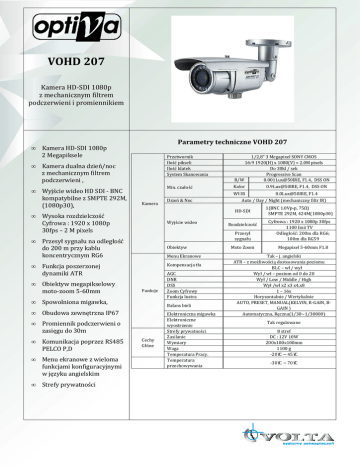 VOHD 207 Kamera HD-SDI 1080p z mechanicznym filtrem podczerwieni i promiennikiem • Parametry techniczne VOHD 207 Kamera HD-SDI 1080p 2 Megapiksele • Kamera dualna dzień/noc z mechanicznym filtrem podczerwieni , • Wyjście wideo HD SDI - BNC kompatybilne z SMPTE 292M, (1080p30), • • • • Przetwornik Ilość pikseli Ilość klatek System Skanowania Kamera Min. czułość 1/2,8" 3 Megapixel SONY CMOS 16:9 1920(H) x 1080(V) = 2.0M pixels Do 30kl / sek Progressive Scan B/W 0.001Lux@50IRE, F1.4, DSS ON Kolor 0.9Lux@50IRE, F1.4, DSS ON Dzień & Noc Wł IR 0.0Lux@50IRE, F1.4 Auto / Day / Night (mechaniczny filtr IR) HD-SDI Wysoka rozdzielczość Cyfrowa : 1920 x 1080p 30fps – 2 M pixels Wyjście wideo Przesył sygnału na odległość do 200 m przy kablu koncentrycznym RG6 Obiektyw Przesył sygnału Menu Ekranowe Kompensacja tła Funkcja poszerzonej dynamiki ATR Obiektyw megapikselowy moto-zoom 5-60mm • Spowolniona migawka, • Obudowa zewnętrzna IP67 • Promiennik podczerwieni o zasięgu do 30m • Komunikacja poprzez RS485 PELCO P,D • Menu ekranowe z wieloma funkcjami konfiguracyjnymi w języku angielskim • Strefy prywatności Rozdzielczość Funkcje AGC DNR DSS Zoom Cyfrowy Funkcja lustra Balans bieli Cechy Głóne Elektroniczna migawka Elektroniczne wyostrzenie Strefy prywatności Zasilanie Wymiary Waga Temperatura Pracy. Temperatura przechowywania Moto Zoom 1(BNC 1.0Vp-p, 75Ω) SMPTE 292M, 424M(1080p30) Cyfrowa : 1920 x 1080p 30fps 1100 linii TV Odległość: 200m dla RG6; 100m dla RG59 Megapixel 5-60mm F1.8 Tak – j. angielski ATR – z możliwością dostosowania poziomu BLC – wł / wył Wył / wł – poziom od 0 do 20 Wył / Low / Middle / High Wył /wł x2 x3 x4,x8 1 – 16x Horyzontalnie / Wertykalnie AUTO, PRESET, MANUAL(KELVIN, R-GAIN, BGAIN ) Automatyczna, Ręczna(1/30~1/30000) Tak regulowane 8 stref DC : 12V 10W 200x100x100mm 1100 g -20°C ~ 45°C -30°C ~ 70°C