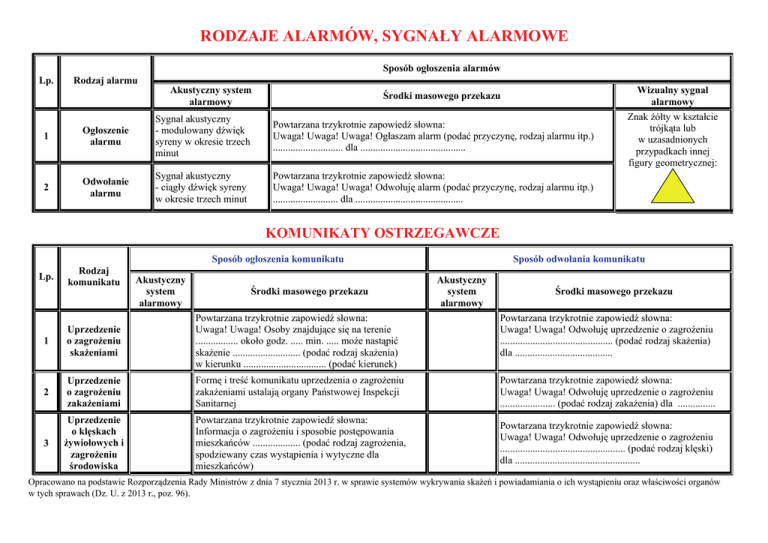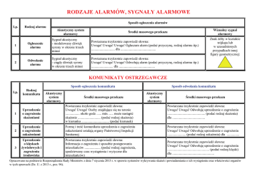 RODZAJE ALARMÓW, SYGNAŁY ALARMOWE Sposób ogłoszenia alarmów Lp. Rodzaj alarmu Akustyczny system alarmowy Środki masowego przekazu 1 Ogłoszenie alarmu Sygnał akustyczny - modulowany dźwięk syreny w okresie trzech minut Powtarzana trzykrotnie zapowiedź słowna: Uwaga! Uwaga! Uwaga! Ogłaszam alarm (podać przyczynę, rodzaj alarmu itp.) ............................ dla .......................................... 2 Odwołanie alarmu Sygnał akustyczny - ciągły dźwięk syreny w okresie trzech minut Powtarzana trzykrotnie zapowiedź słowna: Uwaga! Uwaga! Uwaga! Odwołuję alarm (podać przyczynę, rodzaj alarmu itp.) .......................... dla ........................................... Wizualny sygnał alarmowy Znak żółty w kształcie trójkąta lub w uzasadnionych przypadkach innej figury geometrycznej: KOMUNIKATY OSTRZEGAWCZE Sposób ogłoszenia komunikatu Lp. Rodzaj komunikatu Akustyczny system alarmowy Środki masowego przekazu Sposób odwołania komunikatu Akustyczny system alarmowy Środki masowego przekazu 1 Uprzedzenie o zagrożeniu skażeniami Powtarzana trzykrotnie zapowiedź słowna: Uwaga! Uwaga! Osoby znajdujące się na terenie ................. około godz. ..... min. ..... może nastąpić skażenie ........................... (podać rodzaj skażenia) w kierunku ................................. (podać kierunek) Powtarzana trzykrotnie zapowiedź słowna: Uwaga! Uwaga! Odwołuję uprzedzenie o zagrożeniu ............................................. (podać rodzaj skażenia) dla ....................................... 2 Uprzedzenie o zagrożeniu zakażeniami Formę i treść komunikatu uprzedzenia o zagrożeniu zakażeniami ustalają organy Państwowej Inspekcji Sanitarnej Powtarzana trzykrotnie zapowiedź słowna: Uwaga! Uwaga! Odwołuję uprzedzenie o zagrożeniu ...................... (podać rodzaj zakażenia) dla ............... 3 Uprzedzenie o klęskach żywiołowych i zagrożeniu środowiska Powtarzana trzykrotnie zapowiedź słowna: Informacja o zagrożeniu i sposobie postępowania mieszkańców ................... (podać rodzaj zagrożenia, spodziewany czas wystąpienia i wytyczne dla mieszkańców) Powtarzana trzykrotnie zapowiedź słowna: Uwaga! Uwaga! Odwołuję uprzedzenie o zagrożeniu .................................................. (podać rodzaj klęski) dla .................................................. Opracowano na podstawie Rozporządzenia Rady Ministrów z dnia 7 stycznia 2013 r. w sprawie systemów wykrywania skażeń i powiadamiania o ich wystąpieniu oraz właściwości organów w tych sprawach (Dz. U. z 2013 r., poz. 96). POSTĘPOWANIE PO USŁYSZENIU SYGNAŁÓW ALARMOWYCH I KOMUNIKATÓW Jednym z przedsięwzięć Obrony Cywilnej jest tworzenie systemów alarmowania, które mają ostrzegać ludność przed grożącym niebezpieczeństwem w celu umożliwienia jej ukrycie się w przygotowanych budowlach lub pomieszczeniach ochronnych a także opuszczenia strefy niebezpiecznej. Do ogłaszania (odwoływania) alarmów i komunikatów wykorzystuje się następujące urządzenia: 1) systemy alarmowe miast, 2) centralną oraz regionalne rozgłośnie Polskiego Radia i ośrodki Telewizji Polskiej, 3) radiowęzły radiofonii przewodowej, 4) syreny nie włączone do miejskich systemów alarmowych (syreny zakładów pracy, straży pożarnej itd.). Sygnały alarmowe oraz sposób ich ogłaszania i odwoływania przedstawia załączona tabela. PAMIĘTAJ! PO USŁYSZENIU SYGNAŁU ALARMOWEGO LUB KOMUNIKATU NALEŻY DZIAŁAĆ SZYBKO, ALE ROZWAŻNIE I BEZ PANIKI ZASADY ZACHOWANIA SIĘ: 1. PO OGŁOSZENIU ALARMU: 1) włącz radioodbiornik na częstotliwości radiostacji lokalnych, 2) postępuj zgodnie z zaleceniami podanymi w komunikatach, 3) wykonuj polecenia służb ratowniczych, władz i organów Obrony Cywilnej, 4) przygotuj maskę przeciwgazową lub środek zastępczy, 5) przygotuj wilgotne tampony na usta i nos do oddychania (najlepiej nawilżyć je roztworem wodnym sody oczyszczonej), 6) wyłącz urządzenia gazowe i elektryczne, wygaś paleniska, 7) uszczelnij okna pomieszczenia w którym się znajdujesz mokrym papierem lub szmatami, 8) zabierz ze sobą dokumenty osobiste, odzież, zapasy żywności, wodę, indywidualne środki ochrony dróg oddechowych, 9) zamknij okna i mieszkanie, 10) udaj się w miejsce lub w kierunku wskazanym w komunikatach radiowych lub przez służby ratownicze, władze i organa Obrony Cywilnej, 11) udaj się do najbliższego schronu lub ukrycia. Jeśli znajdujesz się w miejscu publicznym: wykonuj polecenia służb ratowniczych, władz i organów Obrony Cywilnej. 2. KOMUNIKAT - UPRZEDZENIE O ZAGROŻENIU SKAŻENIAMI: 1) włącz radioodbiornik na częstotliwości radiostacji lokalnych, 2) postępuj zgodnie z zaleceniami podanymi w komunikatach, 3) wykonuj polecenia służb ratowniczych, władz i organów Obrony Cywilnej, 4) wyłącz urządzenia gazowe i elektryczne, wygaś paleniska, 5) zamknij okna i mieszkanie, 6) udaj się w miejsce lub w kierunku wskazanym w komunikatach radiowych lub przez służby ratownicze, władze i organa Obrony Cywilnej. Jeśli nie zdążyłeś opuścić mieszkania: 1) uszczelnij okna pomieszczenia, w którym się znajdujesz mokrym papierem lub szmatami, 2) przygotuj wilgotne tampony na usta i nos do oddychania (najlepiej nawilżyć je roztworem wodnym sody oczyszczonej). Jeśli znajdziesz się w miejscu publicznym: wykonuj polecenia służb ratowniczych, władz i organów Obrony Cywilnej. 3. KOMUNIKAT - UPRZEDZENIE O ZAGROŻENIU ZAKAŻENIAMI: 1) postępuj zgodnie z zaleceniami podanymi w środkach masowego przekazu przez organy Państwowej Inspekcji Sanitarnej. 4. KOMUNIKAT - UPRZEDZENIE O KLĘSKACH ŻYWIOŁOWYCH I ZAGROŻENIU ŚRODOWISKA: 1) włącz radioodbiornik na częstotliwości radiostacji lokalnych, 2) postępuj zgodnie z zaleceniami podanymi w komunikatach, 3) zamknij okna i mieszkanie. W wypadku awarii obiektu z toksycznym środkiem przemysłowym: 1) wyłącz urządzenia gazowe 