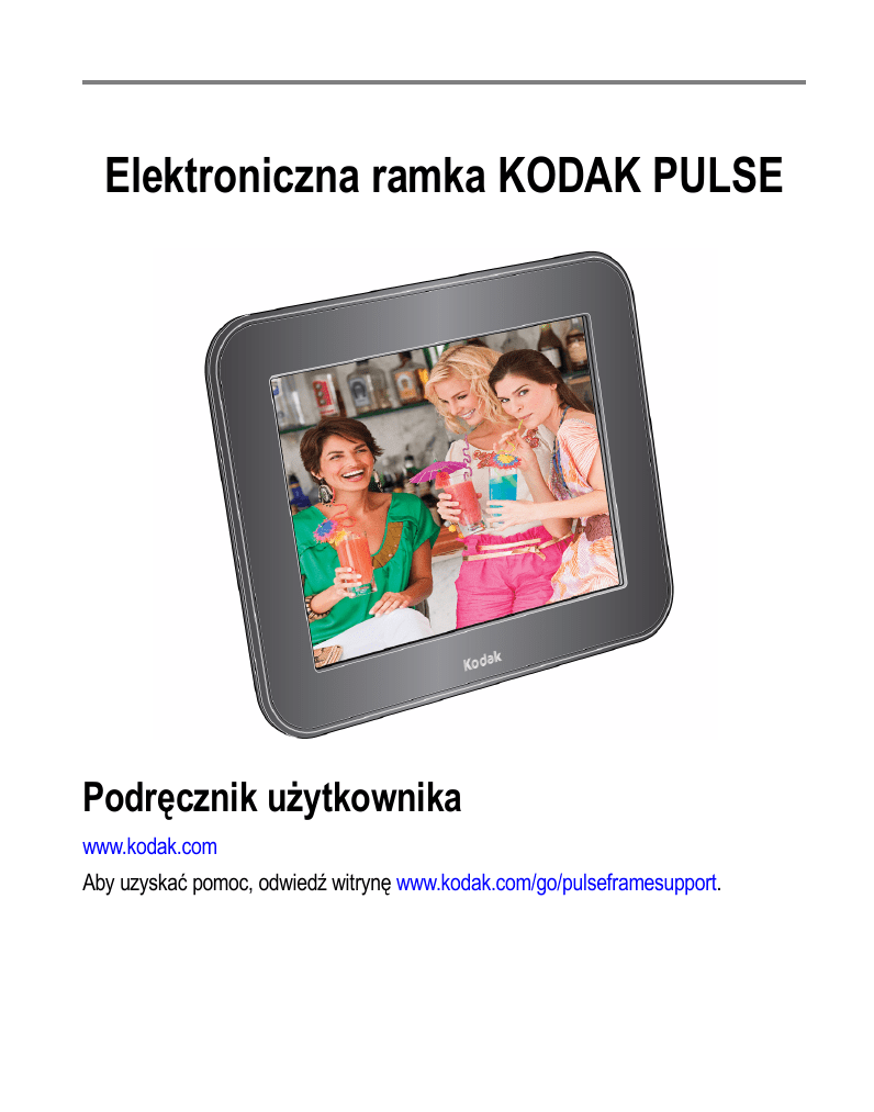 Elektroniczna ramka KODAK PULSE Podręcznik użytkownika www.kodak.com Aby uzyskać pomoc, odwiedź witrynę www.kodak.com/go/pulseframesupport. Eastman Kodak Company Rochester, New York 14650, USA © Eastman Kodak Company, 2010 Wszystkie umieszczone w podręczniku obrazy ekranów zostały zasymulowane. Kodak i Pulse są znakami towarowymi firmy Eastman Kodak Company. P/N 4H6784_pl Elementy produktu Przyciski i złącza z tyłu ramki Złącze USB2 Przycisk zasilania Gniazda kart pamięci2 Przycisk sprawdzania stanu Wejście zasilania1 1 Patrz Podłączanie kabla zasilającego, strona 1. 2 Patrz Wyświetlanie zdjęć z karty pamięci lub urządzenia USB, strona 12. www.kodak.com/go/support PL i Elementy produktu Ikony i przyciski na ekranie dotykowym 1 2 3 4 5 6 7 8 8 9 1 Odtwórz — rozpoczęcie pokazu slajdów. 2 Kolaż — rozpoczęcie „obracającego się” pięciozdjęciowego pokazu slajdów. 3 Informacje — wyświetlenie informacji dotyczących zdjęcia. 4 Usuń — usunięcie zdjęć z ramki. 5 Kopiuj — skopiowanie zdjęć z karty pamięci lub urządzenia USB do pamięci wewnętrznej ramki (opcja pojawia się dopiero po włożeniu karty pamięci lub urządzenia USB). 6 Czas przejścia — zmiana czasu wyświetlania każdego zdjęcia na ekranie oraz efektu przejścia między zdjęciami. 7 Znajomi — wyświetlanie zdjęć pogrupowanych według znajomych, którzy je przesłali (można także wyświetlać zdjęcia na włożonej karcie pamięci lub urządzeniu USB). 8 Poprzednie/następne — wyświetlenie poprzedniego/następnego zdjęcia na ramce. 9 Sprawdzanie stanu — umożliwia sprawdzenie lub naprawienie problemu z połączeniem sieciowym (opcja pojawia się po wystąpieniu problemu z połączeniem sieciowym). ii PL www.kodak.com/go/support 1 Spis treści 1 Czynności wstępne ........................................................................................ 1 Podłączanie kabla zasilającego............................................................................ 1 Włączanie i wyłączanie ramki............................................................................... 2 Ustawianie języka................................................................................................. 3 Łączenie się z siecią bezprzewodową.................................................................. 3 Aktywacja ramki.................................................................................................... 9 Dodawanie zdjęć do ramki ................................................................................. 10 2 Wyświetlanie zdjęć ...................................................................................... 11 Wyświetlanie zdjęć z pamięci wewnętrznej ........................................................ 11 Wyświetlanie zdjęć z karty pamięci lub urządzenia USB.................................... 12 Przechodzenie między zdjęciami ....................................................................... 14 Zmiana szybkości odtwarzania i efektu przejścia............................................... 15 Wyświetlanie zdjęć w postaci kolażu.................................................................. 16 3 Zaawansowana obsługa ramki .................................................................... 17 Korzystanie z konta internetowego..................................................................... 17 Odbieranie i wyświetlanie zdjęć od znajomych .................................................. 18 Usuwanie zdjęć .................................................................................................. 20 Kopiowanie zdjęć do pamięci wewnętrznej ........................................................ 21 Konserwacja ramki ............................................................................................. 22 4 Rozwiązywanie problemów i pomoc techniczna .......................................... 24 Uzyskiwanie pomocy dotyczącej ramki elektronicznej ....................................... 24 Problemy z ramką do zdjęć ................................................................................ 25 Poznaj lepiej swoją ramkę .................................................................................. 26 www.kodak.com/go/support PL iii Spis treści 5 Dodatek ....................................................................................................... 27 Dane techniczne ramki elektronicznej ................................................................ 27 Ważne informacje dotyczące bezpieczeństwa ................................................... 28 Dodatkowa obsługa i konserwacja ..................................................................... 29 Ograniczona gwarancja...................................................................................... 30 Informacje dotyczące zgodności z przepisami oraz porady ............................... 32 iv PL www.kodak.com/go/support 1 Czynności wstępne Podłączanie kabla zasilającego Jeśli dołączono więcej niż jedną wtyczkę, użyj wtyczki właściwej dla określonego gniazdka sieci elektrycznej. Kabel zasilający może wyglądać inaczej niż ten, który przedstawiono na ilustracji. UWAGA: Ramka włącza się automatycznie po pierwszym podłączeniu kabla zasilającego. OSTROŻNIE: Tego kabla zasilającego nie należy używać z innymi urządzeniami, w tym z aparatami cyfrowymi. www.kodak.com/go/support PL 1 Czynności wstępne Włączanie i wyłączanie ramki UWAGA: Ramka włącza się automatycznie po pierwszym podłączeniu kabla zasilającego. Naciśnij przycisk zasilania, aby włączyć lub wyłączyć ramkę. Przycisk zasilania UWAGA: Ramka została skonfigurowana tak, aby umożliwić oszczędzanie energii poprzez automatyczne wyłączanie w nocy i włączanie rano. Można zmienić godzinę włączenia i wyłączenia lub wyłączyć tę funkcję: po utworzeniu bezpłatnego konta internetowego i