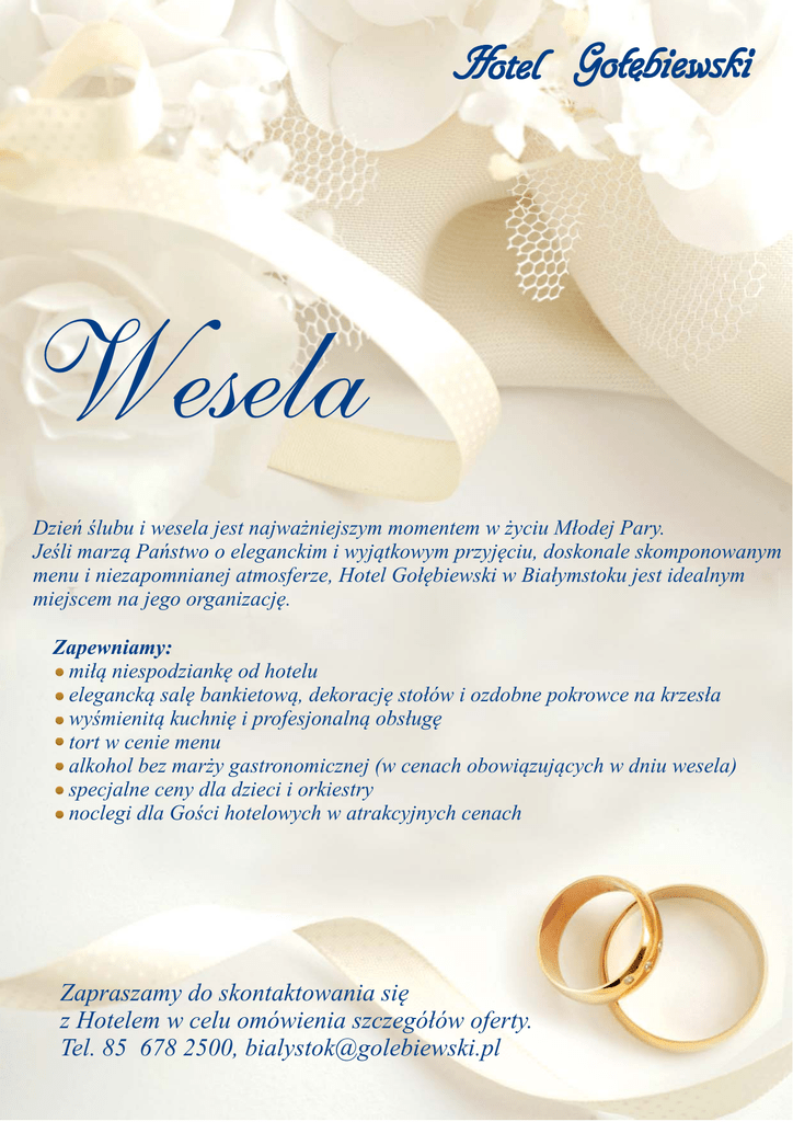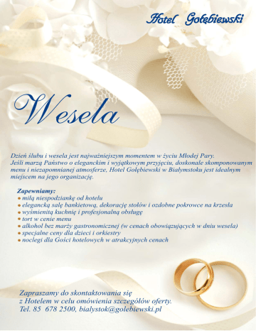 Wesela Dzień ślubu i wesela jest najważniejszym momentem w życiu Młodej Pary. Jeśli marzą Państwo o eleganckim i wyjątkowym przyjęciu, doskonale skomponowanym menu i niezapomnianej atmosferze, Hotel Gołębiewski w Białymstoku jest idealnym miejscem na jego organizację. Zapewniamy: miłą niespodziankę od hotelu elegancką salę bankietową, dekorację stołów i ozdobne pokrowce na krzesła wyśmienitą kuchnię i profesjonalną obsługę tort w cenie menu alkohol bez marży gastronomicznej (w cenach obowiązujących w dniu wesela) specjalne ceny dla dzieci i orkiestry noclegi dla Gości hotelowych w atrakcyjnych cenach Zapraszamy do skontaktowania się z Hotelem w celu omówienia szczegółów oferty. Tel. 85 678 2500, [email protected] Wesela Wino musujące na powitanie Przekąska podana porcjowo: Pasztet drobiowy otulony boczkiem propozycje menu Menu I 175,00 zł/osoba Dania gorące serwowane przez kelnerów: Kołduny w bulionie Schab grillowany zapieczony z cukinią i pomidorem z sosem kurkowym, podany z ziemniakami z koperkiem i bukietem warzyw Faszerowane udko z kurczaka podane z ziemniakami pieczonymi i surówką z białej kapusty Danie podane po północy: Flaczki Przekąski zimne w formie półmisków na stole: Półmisek mięs pieczonych (karkówka pieczona w ziołach, rolada drobiowa, szynka pieczona w panierce z suszonymi pomidorami) / wędliny wiejskie Pieczony schab w galarecie z pieczarkami Szczupak faszerowany pistacjami podany z sosem tatarskim Sałatka grecka z fetą Półmisek warzyw, pikle Śledź po cygańsku Befsztyk tatarski Sałatka „Szefa Kuchni” Roladki z szynki z pastą twarogowo - koperkową Tort weselny – po północy Bufet deserowy: Owoce w całości i filetowane Musy i galaretki owocowe Szeroki wybór ciast pieczonych Napoje – bez ograniczeń: Kawa/ herbata Soki owocowe Napoje gazowane Woda z cytryną Wesela Wino musujące na powitanie Przekąska podana porcjowo: Sałatka z łososiem wędzonym propozycje menu Menu II 190,00 zł/osoba Dania gorące serwowane przez kelnerów: Kołduny w bulionie Filet z indyka zapieczony z cukinią i pomidorem na salsie pomidorowej, ziemniaki z koperkiem i bukiet warzyw Szynka pieczona w całości z sosem grzybowym, kopytka obsmażane, buraczkami na ciepło Danie podane wieloporcjowo na półmiskach: Faszerowane udko z kurczaka, szaszłyki podane z pieczonymi ziemniakami i surówką z białej kapusty Danie podane po północy: Żurek z jajkiem Przekąski zimne w formie półmisków na stole: Półmisek mięs pieczonych (karkówka pieczona w ziołach, rolada drobiowa, szynka pieczona w panierce z suszonymi pomidorami) / wędliny wiejskie Pieczony schab w galarecie z pieczarkami Szczupak faszerowany pistacjami podany z sosem tatarskim Sałatka grecka z fetą Półmisek warzyw, pikle Śledź po cygańsku Befsztyk tatarski z ogórkiem i z cebulą Mix sałat z grillowanym kurczakiem, pomidorkami koktajlowymi, kulkami mozzarelli z sosem winegret Roladki z szynki z pastą twarogowo – koperkową Półmisek serów regionalnych Tort weselny – po północy Bufet deserowy: Owoce filetowane Musy i galaretki owocowe Szeroki wybór ciast pieczonych Napoje – bez ograniczeń: Kawa/ herbata Soki owocowe Napoje gazowane Woda z cytryną Wesela Wino musujące na powitanie Przekąska podana porcjowo: Mus z perliczki w tiulu parmezanowym z konfiturą z żurawiny propozycje menu Menu III 190,00 zł/osoba Dania gorące serwowane przez kelnerów: Kołduny w bulionie Karkówka zapiekana z sosem musztardowym i kurkami, ziemniaki z wody z koperkiem, surówka z pomidorów i cukinii Danie podane wieloporcjowo na półmiskach: Żeberka pieczone, szaszłyk drobiowy, kotleciki schabowe w migdałach, krokiety ziemniaczane, buraczki zasmażane Danie podane po północy: Strogonow w chlebku Bufet przekąskowy: Półmisek mięs pieczonych (karkówka pieczona w ziołach, rolada drobiowa, szynka pieczona w panierce z suszonymi pomidorami) Wędliny wiejskie Pieczony schab w galarecie z pieczarkami Szczupak faszerowany w całości z sosem tatarskim Sałatka grecka z fetą Półmisek warzyw, pikle Śledź po cygańsku/ rolada śledziowa Befsztyk tatarski Sałatka „Szefa Kuchni” Roladki z szynki z pastą twarogowo – koperkową / mus drobiowy w parmezanie Półmisek serów regionalnych Tort weselny – po północy Bufet deserowy: Owoce filetowane Musy i galaretki owocowe Szeroki wybór ciast pieczonych Napoje – bez ograniczeń: Kawa/ herbata Soki owocowe Napoje gazowane Woda z cytryną Wesela Wino musujące na powitanie Przekąska podana porcjowo: Szynka kresowa z mozzarellą na sałacie dębolistnej propozycje menu Menu IV 200,00 zł/osoba Dania gorące serwowane przez kelnerów: Krem z białych warzyw z papryką i migdałami Eskalopki drobiowe zapiekane z serem i pomidorem na salsie, ziemniaki opiekane, mix sałat z sosem miodowo-musztardowym Szynka pieczona w całości z sosem grzybowym, kasza gryczana, buraczki zasmażane Polędwiczka wieprzowa faszerowana grzybami na sosie pieczeniowym z ryżem i sałatką colesław Danie podane po północy: Flaczki Przekąski zimne w formie półmisków na stole: Półmisek mięs pieczonych (karkówka pieczona w ziołach, rolada drobiowa, szynka pieczona w panierce z suszonymi pomidorami) / wędliny wiejskie Pieczony schab w galarecie z pieczarkami Szczupak faszerowany pistacjami podany z sosem tatarskim Sałatka grecka z fetą Półmisek warzyw, pikle Śledź po cygańsku Befsztyk tatarski Sałatka „Szefa Kuchni” Roladki z szynki z pastą twarogowo – koperkową Tort weselny – po północy Bufet deserowy: Owoce filetowane Musy i galaretki owocowe Szeroki wybór ciast pieczonych Napoje – bez ograniczeń: Kawa/ herbata Soki owocowe Napoje gazowane Woda z cytryną