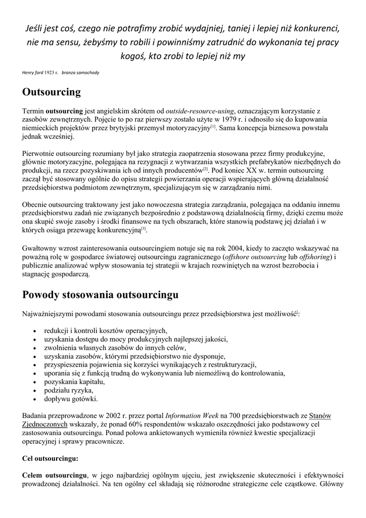 Jeśli jest coś, czego nie potrafimy zrobić wydajniej, taniej i lepiej niż konkurenci, nie ma sensu, żebyśmy to robili i powinniśmy zatrudnić do wykonania tej pracy kogoś, kto zrobi to lepiej niż my Henry ford 1923 r. branza samochody Outsourcing Termin outsourcing jest angielskim skrótem od outside-resource-using, oznaczającym korzystanie z zasobów zewnętrznych. Pojęcie to po raz pierwszy zostało użyte w 1979 r. i odnosiło się do kupowania niemieckich projektów przez brytyjski przemysł motoryzacyjny[1]. Sama koncepcja biznesowa powstała jednak wcześniej. Pierwotnie outsourcing rozumiany był jako strategia zaopatrzenia stosowana przez firmy produkcyjne, głównie motoryzacyjne, polegająca na rezygnacji z wytwarzania wszystkich prefabrykatów niezbędnych do produkcji, na rzecz pozyskiwania ich od innych producentów[2]. Pod koniec XX w. termin outsourcing zaczął być stosowany ogólnie do opisu strategii powierzania operacji wspierających główną działalność przedsiębiorstwa podmiotom zewnętrznym, specjalizującym się w zarządzaniu nimi. Obecnie outsourcing traktowany jest jako nowoczesna strategia zarządzania, polegająca na oddaniu innemu przedsiębiorstwu zadań nie związanych bezpośrednio z podstawową działalnością firmy, dzięki czemu może ona skupić swoje zasoby i środki finansowe na tych obszarach, które stanowią podstawę jej działań i w których osiąga przewagę konkurencyjną[3]. Gwałtowny wzrost zainteresowania outsourcingiem notuje się na rok 2004, kiedy to zaczęto wskazywać na poważną rolę w gospodarce światowej outsourcingu zagranicznego (offshore outsourcing lub offshoring) i publicznie analizować wpływ stosowania tej strategii w krajach rozwiniętych na wzrost bezrobocia i stagnację gospodarczą. Powody stosowania outsourcingu Najważniejszymi powodami stosowania outsourcingu przez przedsiębiorstwa jest możliwość[: • • • • • • • • • redukcji i kontroli kosztów operacyjnych, uzyskania dostępu do mocy produkcyjnych najlepszej jakości, zwolnienia własnych zasobów do innych celów, uzyskania zasobów, którymi przedsiębiorstwo nie dysponuje, przyspieszenia pojawienia się korzyści wynikających z restrukturyzacji, uporania się z funkcją trudną do wykonywania lub niemożliwą do kontrolowania, pozyskania kapitału, podziału ryzyka, dopływu gotówki. Badania przeprowadzone w 2002 r. przez portal Information Week na 700 przedsiębiorstwach ze Stanów Zjednoczonych wskazały, że ponad 60% respondentów wskazało oszczędności jako podstawowy cel zastosowania outsourcingu. Ponad połowa ankietowanych wymieniła również kwestie specjalizacji operacyjnej i sprawy pracownicze. Cel outsourcingu: Celem outsourcingu, w jego najbardziej ogólnym ujęciu, jest zwiększenie skuteczności i efektywności prowadzonej działalności. Na ten ogólny cel składają się różnorodne strategiczne cele cząstkowe. Główny cel strategiczny to skoncentrowanie się firmy na działalności kluczowej, decydującej o jego pozycji konkurencyjnej i perspektywach rozwojowych. Dzięki temu następuje zwiększenie swobody doboru partnerów i warunków współdziałania z nimi. Swobodny dobór partnerów pozwala uzyskać dostęp do know-how niemożliwego do osiągnięcia własnymi siłami. Redukcja problemów operatywnych, następująca w wyniku outsourcingu, umożliwia kierownictwu firmy koncentrację na problemach strategicznych. Spowoduje to lepszą realizację celów rynkowych, np. poprawę pozycji rynkowej, zwiększenie skali jego działalności, dywersyfikację lub koncentrację rynkowej działalności. Prowadzi to do lepszej realizacji celów ekonomicznych: zwiększenie przychodów, redukcje kosztów, a co za tym idzie poprawa wyników ekonomicznych i ograniczenie ryzyka ekonomicznego prowadzonej działalności. W wyniku outsourcingu następuje redukcja struktury organizacyjnej firmy, a w ślad za tym uproszczenie struktur i procedur organizacyjnych skutkujące automatycznie poprawą zarządzania. Przy pomocy outsourcingu osiągnięte mogą być także cele motywacyjne. Dzięki outsourcingowi następuje bowiem obiektywizacja wyników ekonomicznych, upowszechnienie myślenia i działania ekonomicznego oraz rozwój przedsiębiorczości. Przedstawiona powyżej różnorodność celów outsourcingu wskazuje, że cele te nie mogą być zredukowane wyłącznie do celów ekonomicznych, a zwłaszcza jak to się powszechnie uważa, do redukcji kosztów. Redukcja kosztów jest ważnym, lecz nie jedynym celem podejmowania przedsięwzięć outsourcingowych. Korzyści z outsourcingu: Redukcja kosztów – firmy outsourcingowe często potrafią obsłużyć danyproces biznesowy znacznie efektywniej, obniżając jego koszt dla przedsiębiorstwa zlecającego. Wynika to z faktu, że firmy te wykorzystując efekt skali, potrafią znacznie obniżyć jednostkowe koszty działalności. Uwolnienie zasobów przedsiębiorstwa - dzięki outsourcingowi, przedsiębiorstwo może skupić wszystkie swoje zasoby i całą uwagę na podstawowej działalności, z której generuje zyski. Menedżerowie nie muszą poświęcać swojego czasu na zajmowanie się administracyjnymi lub innymi zadaniami niezwiązanymi z działalnością strategiczną. Poprawa jakości - dzięki standaryzacji działalności, wyspecjalizowane firmy często gwarantują wysoki poziom wykonania usługi, który byłby niezwykle kosztowny jeśli wykonywany przez przedsiębiorstwo we własnym zakresie. Do zalet powierzenia części zadań firmie zewnętrznej można zaliczyć: • • • • • • • optymalizacja kosztów obsługi, podniesienie bezpieczeństwa organizacji, przyjmowanie bez ograniczeń dodatkowych zleceń, nieponoszenie ryzyka kosztów pozyskania pracowników oraz ich szkolenia, niskie koszty zarządzania kontraktem, dostęp do specjalistów z wielu dziedzin, wyższa elastyczność. Stwórz organizację przyszłości Ile zadań twoja firma mogłaby zl