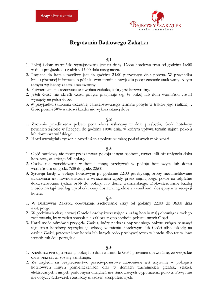 Regulamin Bajkowego Zakątka 1. 2. 3. 2. 3. §1 Pokój i dom warmiński wynajmowany jest na doby. Doba hotelowa trwa od godziny 16:00 w dniu przyjazdu do godziny 12:00 dnia następnego. Przyjazd do hotelu możliwy jest do godziny 24.00 pierwszego dnia pobytu. W przypadku braku pisemnej informacji o późniejszym terminie przyjazdu pobyt zostanie anulowany. A tym samym wpłacony zadatek bezzwrotny. Potwierdzeniem rezerwacji jest wpłata zadatku, który jest bezzwrotny. Jeżeli Gość nie określi czasu pobytu przyjmuje się, że pokój lub dom warmiński został wynajęty na jedną dobę. W przypadku skrócenia wcześniej zarezerwowanego terminu pobytu w trakcie jego realizacji , Gość ponosi 50% wartości każdej nie wykorzystanej doby. §2 1. Życzenie przedłużenia pobytu poza okres wskazany w dniu przybycia, Gość hotelowy powinien zgłosić w Recepcji do godziny 10:00 dnia, w którym upływa termin najmu pokoju lub domu warmińskiego. 2. Hotel uwzględnia życzenie przedłużenia pobytu w miarę posiadanych możliwości. §3 1. Gość hotelowy nie może przekazywać pokoju innym osobom, nawet jeśli nie upłynęła doba hotelowa, za którą uiścił opłatę. 2. Osoby nie zameldowane w hotelu mogą przebywać w pokoju hotelowym lub domu warmińskim od godz. 7:00 do godz. 22:00. 3. Sytuacja kiedy w pokoju hotelowym po godzinie 22:00 przebywają osoby niezameldowane traktowana jest równoznacznie z wyrażeniem zgody przez najmującego pokój na odpłatne dokwaterowanie tychże osób do pokoju lub domu warmińskiego. Dokwaterowanie każdej z osób nastąpi według wysokości ceny dostawki zgodnie z cennikiem dostępnym w recepcji hotelu. §4 1. W Bajkowym Zakątku obowiązuje zachowanie ciszy od godziny 22:00 do 06:00 dnia następnego. 2. W godzinach ciszy nocnej Goście i osoby korzystające z usług hotelu mają obowiązek takiego zachowania, by w żaden sposób nie zakłócało ono spokoju pobytu innych Gości. 3. Hotel może odmówić przyjęcia Gościa, który podczas poprzedniego pobytu rażąco naruszył regulamin hotelowy wyrządzając szkodę w mieniu hotelowym lub Gości albo szkodę na osobie Gości, pracowników hotelu lub innych osób przebywających w hotelu albo też w inny sposób zakłócił porządek. §5 1. Każdorazowo opuszczając pokój lub dom warmiński Gość powinien upewnić się, że wszystkie okna oraz drzwi zostały zamknięte. 2. Ze względu na bezpieczeństwo przeciwpożarowe zabronione jest używanie w pokojach hotelowych innych pomieszczeniach oraz w domach warmińskich grzałek, żelazek elektrycznych i innych podobnych urządzeń nie stanowiących wyposażenia pokoju. Powyższe nie dotyczy ładowarek i zasilaczy urządzeń komputerowych. §6 Gość hotelowy ponosi pełną odpowiedzialność materialną i prawną za wszelkiego rodzaju uszkodzenia lub zniszczenia przedmiotów wyposażenia i urządzeń technicznych obiektu powstałe z winy Jego lub odwiedzających Go osób. §7 Hotel nie ponosi odpowiedzialności z tytułu uszkodzenia lub utraty pieniędzy, papierów wartościowych, kosztowności i innych rzeczy i przedmiotów wartościowych albo przedmiotów mających wartość naukową i artystyczną, jeżeli przedmioty te nie zostaną oddane na przechowanie do depozytu w Recepcji. §8 W przypadku naruszenia postanowień niniejszego regulaminu Bajkowy Zakątek może odmówić dalszego świadczenia usług osobie, która je narusza. Osoba taka zobowiązana jest do niezwłocznego zastosowania się do żądań obiektu, w szczególności zapłaty za poczynione uszkodzenia i zniszczenia oraz opuszczenie terenu hotelu. §9 Przedmioty osobistego użytku pozostawione w pokoju przez wyjeżdżającego Gościa będą odesłane na Jego koszt na adres przez niego wskazany. W przypadku nie otrzymania takiej dyspozycji, przechowa te przedmioty przez 3 miesiące, a następnie przekaże na cele charytatywne. § 10 Hotel nie ponosi odpowiedzialności za uszkodzenia lub utratę samochodu lub innego pojazdu należącego do Gościa, jeżeli został pozostawiony w innym miejscu niż strzeżony parking hotelowy . § 11 1. Na terenie całego obiektu, w tym w pokojach pensjonatu Zapiecek oraz domach warmińskich obowiązuje całkowity zakaz palenia z wyłączeniem stref specjalnie do tego wyznaczonych. Naruszenie tego zakazu może spowodować odmówienie dalszego świadczenia usług ze skutkiem natychmiastowym oraz obciążenie Gościa opłatą dodatkową w wysokości 500 zł na pokrycie kosztów prania tkanin i odświeżania pokoju. 2. Na terenie obiektu obowiązuje zakaz palenia otwartego ognia bez zgody dyrekcji Bajkowego Zakątka § 12 Bajkowy Zakątek świadczy usługi zgodnie ze swoją kategorią i standardem. W przypadku zastrzeżeń dotyczących jakości usług Gość jest proszony o bezzwłoczne zgłoszenie ich w recepcji, co umożliwia hotelowi reakcję. Dyrekcja Bajkowego Zakątka