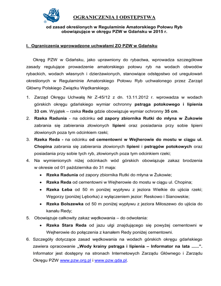 OGRANICZENIA I ODSTĘPSTWA od zasad określonych w Regulaminie Amatorskiego Połowu Ryb obowiązujące w okręgu PZW w Gdańsku w 2015 r. I. Ograniczenia wprowadzone uchwałami ZO PZW w Gdańsku Okręg PZW w Gdańsku, jako uprawniony do rybactwa, wprowadza szczegółowe zasady regulujące prowadzenie amatorskiego połowu ryb na wodach obwodów rybackich, wodach własnych i dzierżawionych, stanowiące odstępstwo od uregulowań określonych w Regulaminie Amatorskiego Połowu Ryb uchwalonego przez Zarząd Główny Polskiego Związku Wędkarskiego. 1. Zarząd Okręgu Uchwałą Nr Z-45/12 z dn. 13.11.2012 r. wprowadza w wodach górskich okręgu gdańskiego wymiar ochronny pstrąga potokowego i lipienia 33 cm. Wyjątek – rzeka Reda gdzie obowiązuje wymiar ochronny 35 cm. 2. Rzeka Radunia - na odcinku od zapory zbiornika Rutki do młyna w Żukowie zabrania się zabierania złowionych lipieni oraz posiadania przy sobie lipieni złowionych poza tym odcinkiem rzeki; 3. Rzeka Reda - na odcinku od cementowni w Wejherowie do mostu w ciągu ul. Chopina zabrania się zabierania złowionych lipieni i pstrągów potokowych oraz posiadania przy sobie tych ryb, złowionych poza tym odcinkiem rzeki; 4. Na wymienionych niżej odcinkach wód górskich obowiązuje zakaz brodzenia w okresie od 01 października do 31 maja: Rzeka Radunia od zapory zbiornika Rutki do młyna w Żukowie; Rzeka Reda od cementowni w Wejherowie do mostu w ciągu ul. Chopina; Rzeka Łeba od 50 m poniżej wypływu z jeziora Wielkie do ujścia rzeki; Węgorzy (poniżej Lęborka) z wyłączeniem jezior: Reskowo i Sianowskie; Rzeka Bolszewka od 50 m poniżej wypływu z jeziora Miłoszewo do ujścia do kanału Redy; 5. Obowiązuje całkowity zakaz wędkowania – do odwołania: Rzeka Stara Reda od jazu ulgi znajdującego się powyżej cementowni w Wejherowie do połączenia z kanałem Redy poniżej cementowni. 6. Szczegóły dotyczące zasad wędkowania na wodach górskich okręgu gdańskiego zawiera opracowanie „Wody krainy pstrąga i lipienia – Informator na lata ......”. Informator jest dostępny na stronach Internetowych Zarządu Głównego i Zarządu Okręgu PZW www.pzw.org.pl i www.pzw.gda.pl. 7. Na wymienionych niżej jeziorach i kanałach obowiązuje zakaż połowu ryb ze środków pływających: - Drzędno, - Gałęźne, - Kapliczce, - Mielonko, - Staw Gierwaza, - Rokitki, - Żygowice, - Zbiornik Borowiec, - Zbiornik Borowiec Mały, - Kanał Śledziowy, - Kanał Piaskowy, - Kanał Gołębi. 8. Ograniczenia w wędkowaniu w rzekach - Wisła i Martwa Wisła: Rzeka Wisła Nr 5, wprowadza się zakaz spinningowania od główki zrzutowej w Korzeniewie do główki następnej w dół rzeki; Rzeka Wisła Nr 6 w okolicy mostu w Kiezmarku od km 929,0 do 931,0 wprowadza się zakaz połowu ryb z lodu oraz zakaz spinningowania od 15 grudnia do końca lutego. Martwa Wisła, obowiązuje zakaz trollingowania w okresie od 01 stycznia do 31 maja każdego roku. Wprowadza się zakaz wędkowania ze sprzętu pływającego, w porze nocnej, na rzekach Wisła i Martwa Wisła. 9. W związku z ciągiem tarłowym troci i łososia, wprowadza się całkowity zakaz połowu ryb w wodach obwodu rzeki Raduni Nr 5, na odcinku od jazów i śluz elektrowni Pruszcz II przy ul. Zastawnej do mostu przy ul. Przemysłowej w Pruszczu Gdańskim na okres od 01 października – do 31 grudnia (Uchwała ZO PZW nr Z-56/13 z dn. 24.09.2013 r. w Gdańsku). 10. W wodach nizinnych okręgu gdańskiego obowiązuje: - wymiar ochronny okonia 18 cm i okres ochronny od 01 marca do 30 kwietnia; (Ograniczenie wymiaru ochronnego okonia, nie obowiązuje w zorganizowanych dla dzieci do lat 16 zawodach wędkarskich). - wymiar ochronny płoci 15 cm. 11. Połowy ryb kuszą dozwolone są wyłącznie na jeziorze Salino po wniesieniu składki okręgowej i otrzymaniu odpowiedniego zezwolenia na jedno jezioro – „R-1Jezioro” . 12. Zarząd Okręgu, uchwałą Nr Z-38/14 z dnia 28.10.2014 r., wprowadza: - zakaz wędkowania ze sprzętu pływającego na obwodzie jeziora Czarne (Czarne Północne, Czarne Południowe i Tobołek), od 01 stycznia do 31 maja 2015 r. - zakaz zabierania karpi i amurów, złowionych w jeziorze Czatkowy. - zakaz trollingowania na obwodzie jezior Rokickich (Rokickie Duże i Małe). II. Ograniczenia wynikające z uchwał samorządów i ogłoszone w Dzienniku Urzędowym Wojewody Pomorskiego Strefy Ciszy na wodach Okręgu PZW w Gdańsku Lp. 1. Powiat Chojnicki 2. 3. 4. Kartuski Kościerski Starogardzki 5. Tczewski Gmina Brusy Czersk Kaliska Lubichowo Osiek Skórcz Skarszewy Starogard Gdański Zblewo Gniew Tczew 6. Wejherowski Nazwa Wody Rzeki: Brda , Niechwaszcz, Rzeki: Brda, Niechwaszcz, Jeziora: Wieckie, Jeziora: Bukowskie, Kamionka, Jeziora: Długie Wielkie, Strupino, Cheb, Słupino Jeziora: Kazubskie, Smolnik, Jeziora: Bagienko II, Jelonek, Jeziora: Czarne Północne i Południowe, Tobołek Jeziora: Czarnoleskie, Jeziora: Borówno Małe, Krawusińskie, Rokitki, Jeziora: Rywałd, Jabłowo, Sumińskie, Szpęgawskie, Płaczewo, Staroleskie, Zduńskie, Żygowice Rzeki: Wda, Wietcisa, Wierzyca Rzeki: Wda, Wierzyca, Wietcisa, Jeziora: Pieniążkowo, Półwieś, Rakowieckie, Tymawskie, Jeziora: Rokickie Duże i Małe, Waćmierek, Zduńskie Jeziora: Bieszkowice, Wyspowo, Zawiad, Teren Trójmiejskiego Parku Krajobrazowego i Kaszubskiego Parku Krajobrazowego III. Zasady uzyskania ZEZWOLENIA na wędkowanie w wodach okręgu gdańskiego przez wędkarzy z innych okręgów 1. Okręgi mogą przysyłać ogólne zapotrzebowanie na Zezwolenia, hologramy i znaki – oddzielnie na wody nizinne za 72 zł i wszystkie wody – 111 zł. (Zezwolenia uprawniają do wędkowania ze środków pływających oraz spod lodu). 2. Indywidualnie, członkowie PZW mogą uzyskać Zezwolenie zgłaszając się do jednego z kół wędkarskich okręgu gdańskiego (wykaz na stronie www.pzw.gda.pl). 3. Wędkarze z innych okręgów zwolnieni są z wypełniania Rejestru Połowu Ryb, podobnie jak wszyscy, którzy wy
