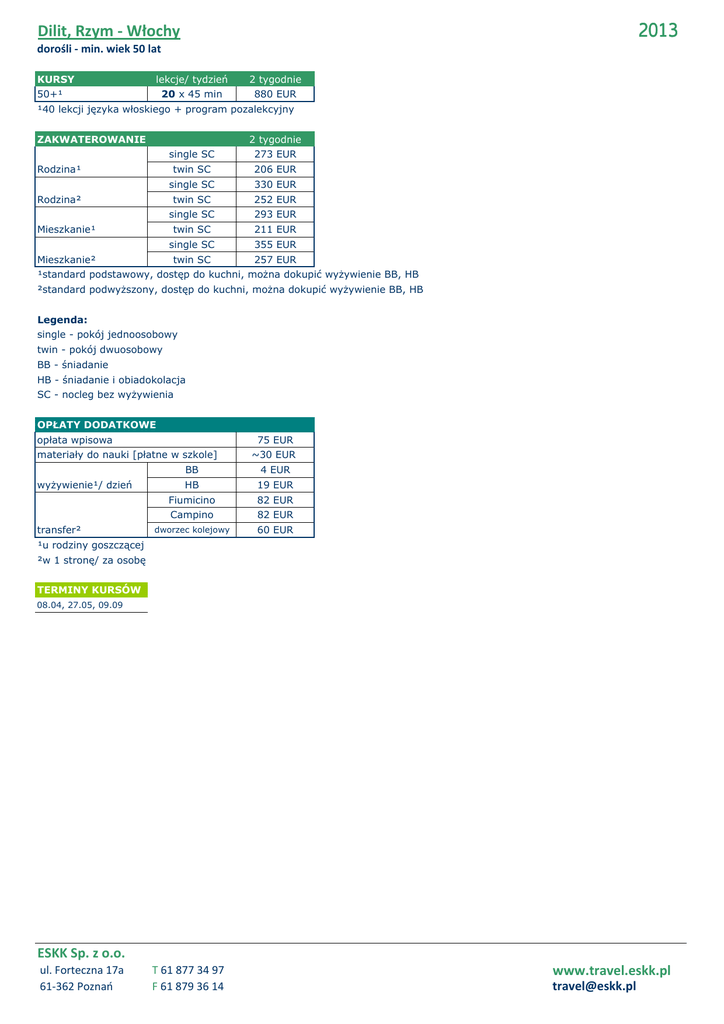 2013 Dilit, Rzym - Włochy dorośli - min. wiek 50 lat KURSY lekcje/ tydzień 2 tygodnie 20 x 45 min 880 EUR 50+¹ ¹40 lekcji języka włoskiego + program pozalekcyjny 2 tygodnie ZAKWATEROWANIE Rodzina¹ Rodzina² Mieszkanie¹ Mieszkanie² single SC 273 EUR twin SC 206 EUR single SC 330 EUR twin SC 252 EUR single SC 293 EUR twin SC 211 EUR single SC 355 EUR twin SC 257 EUR ¹standard podstawowy, dostęp do kuchni, moŜna dokupić wyŜywienie BB, HB ²standard podwyŜszony, dostęp do kuchni, moŜna dokupić wyŜywienie BB, HB Legenda: single - pokój jednoosobowy twin - pokój dwuosobowy BB - śniadanie HB - śniadanie i obiadokolacja SC - nocleg bez wyŜywienia OPŁATY DODATKOWE opłata wpisowa 75 EUR materiały do nauki [płatne w szkole] wyŜywienie¹/ dzień transfer² ~30 EUR BB 4 EUR HB 19 EUR Fiumicino 82 EUR Campino 82 EUR dworzec kolejowy 60 EUR ¹u rodziny goszczącej ²w 1 stronę/ za osobę TERMINY KURSÓW 08.04, 27.05, 09.09 ESKK Sp. z o.o. ul. Forteczna 17a 61-362 Poznań T 61 877 34 97 F 61 879 36 14 www.travel.eskk.pl [email protected]