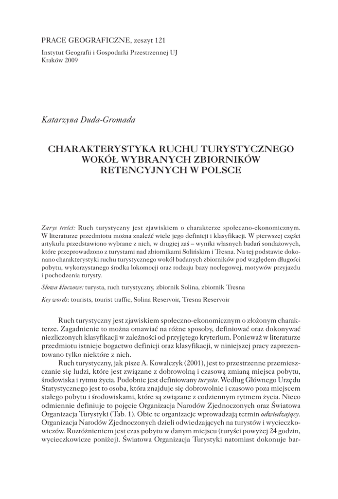 PRACE GEOGRAFICZNE, zeszyt 121 Instytut Geografii i Gospodarki Przestrzennej UJ Kraków 2009 Katarzyna Duda-Gromada CHARAKTERYSTYKA RUCHU TURYSTYCZNEGO WOKÓŁ WYBRANYCH ZBIORNIKÓW RETENCYJNYCH W POLSCE Zarys treści: Ruch turystyczny jest zjawiskiem o charakterze społeczno-ekonomicznym. W literaturze przedmiotu można znaleźć wiele jego definicji i klasyfikacji. W pierwszej części artykułu przedstawiono wybrane z nich, w drugiej zaś – wyniki własnych badań sondażowych, które przeprowadzono z turystami nad zbiornikami Solińskim i Tresna. Na tej podstawie dokonano charakterystyki ruchu turystycznego wokół badanych zbiorników pod względem długości pobytu, wykorzystanego środka lokomocji oraz rodzaju bazy noclegowej, motywów przyjazdu i pochodzenia turysty. Słowa kluczowe: turysta, ruch turystyczny, zbiornik Solina, zbiornik Tresna Key words: tourists, tourist traffic, Solina Reservoir, Tresna Reservoir Ruch turystyczny jest zjawiskiem społeczno-ekonomicznym o złożonym charakterze. Zagadnienie to można omawiać na różne sposoby, definiować oraz dokonywać niezliczonych klasyfikacji w zależności od przyjętego kryterium. Ponieważ w literaturze przedmiotu istnieje bogactwo definicji oraz klasyfikacji, w niniejszej pracy zaprezentowano tylko niektóre z nich. Ruch turystyczny, jak pisze A. Kowalczyk (2001), jest to przestrzenne przemieszczanie się ludzi, które jest związane z dobrowolną i czasową zmianą miejsca pobytu, środowiska i rytmu życia. Podobnie jest definiowany turysta. Według Głównego Urzędu Statystycznego jest to osoba, która znajduje się dobrowolnie i czasowo poza miejscem stałego pobytu i środowiskami, które są związane z codziennym rytmem życia. Nieco odmiennie definiuje to pojęcie Organizacja Narodów Zjednoczonych oraz Światowa Organizacja Turystyki (Tab. 1). Obie te organizacje wprowadzają termin odwiedzający. Organizacja Narodów Zjednoczonych dzieli odwiedzających na turystów i wycieczkowiczów. Rozróżnieniem jest czas pobytu w danym miejscu (turyści powyżej 24 godzin, wycieczkowicze poniżej). Światowa Organizacja Turystyki natomiast dokonuje bar- 88 PRACE GEOGRAFICZNE, ZESZYT 121 Tab. 1. Pojęcie „turysta” wg wybranych organizacji Table 1. The concept of “tourist” as used by selected organisations Źródło: opracowanie własne na podstawie Gołembski 2002 Source: own study based on Gołembski 2002 dziej szczegółowego podziału, włączając pochodzenie odwiedzających, i dzieli ich na międzynarodowych i krajowych. Kryterium rozróżniającym turystów i odwiedzających jednodniowych jest liczba wykorzystanych noclegów: do grupy turystów zalicza się osoby, które korzystają z co najmniej jednego noclegu w wybranej miejscowości, a do odwiedzających jednodniowych zalicza się osoby niekorzystające z noclegów. Ponadto Organizacja wyróżnia, obok odwiedzających, innych podróżnych. Kryteria odróżniające odwiedzających od innych podróżnych to: ich podróż powinna się odbywać do miejscowości znajdującej się poza codziennym otoczeniem danej osoby, długość pobytu danej osoby w odwiedzanej miejscowości nie powinna przekraczać 12 kolejnych miesięcy, a główny cel wizyty powinien być inny niż zarobkowanie w odwiedzanym miejscu. W literaturze przedmiotu jest wiele klasyfikacji ruchu turystycznego. Najczęstsze kryteria podziału według różnych autorów przedstawia tabela 2. Czas pobytu, wykorzystywany środek lokomocji czy rodzaj zakwaterowania to kryteria powtarzające się u wszystkich wymienionych autorów. Bardzo ważnym zagadnieniem w zrozumieniu zachowania turystów są motywy wyjazdu. Biorąc pod uwagę cel wyjazdu, W. W. Gaworecki (2007) dzieli turystykę na: wypoczynkową, kulturalną, sportową, towarzyską, związaną z gospodarką, związaną z polityką. A. Kowalczyk (2001) natomiast ze względu na motywy wyjazdów turystycznych wyróżnia turystykę: wypoczynkową, poznawczą (krajoznawstwo), uzdrowiskową, miejską, ekologiczną (ekoturystykę), handlową, kongresową i religijną. Należy podkreślić, że podziały te nie są rozłączne i zarówno motywacje, jak i pewne formy zachowań mogą pojawiać się w różnych typach turystyki. Celem artykułu jest charakterystyka ruchu turystycznego wokół wybranych karpackich zbiorników retencyjnych. Wybrano dwa zbiorniki – Solina i Tresna. Obydwa zbiorniki zostały oddane do użytku pod koniec lat 60. XX w. biornik Solina, w województwie podkarpackim, powstał na rzece San, a jego powierzchnia wynosi ok. 21 km2, zbiornik Tresna natomiast znajduje się w województwie śląskim, został zbudowany na rzece Soła, a jego powierzchnia wynosi 10 km2. Głównymi celami bu- CHARAKTERYSTYKA RUCHU TURYSTYCZNEGO WOKÓŁ WYBRANYCH ZBIORNIKÓW ... 89 Tab. 2. Kryteria podziału ruchu turystycznego wg wybranych autorów Table 2. Tourist traffic classification criteria, based on selected authors Źródło: opracowanie własne na podstawie Kowalczyk 2001 i Gaworecki 2007 Source: own study based on Kowalczyk 2001 and Gaworecki 2007 dowy zbiorników była ochrona przeciwpowodziowa, produkcja energii elektrycznej oraz rekreacja, a w przypadku zbiornika Tresna również zaopatrzenie w wodę (www. imgw.pl). Wielkość ruchu turystycznego (na podstawie noclegów) wokół zbiorników według danych Głównego Urzędu Statystycznego przedstawia tabela 3. Na szczególną uwagę zasługuje gmina Solina, w której wielkość ruchu turystycznego waha się od 40 do prawie 70 tysięcy, w odróżnieniu od pozostałych gmin, gdzie wynosi kilka tysięcy. Ponadto widać dużą różnicę między gminami nad poszczególnymi zbiornikami. W przypadku zbiornika Tresna wielkość ruchu turystycznego w obydwu gminach jest podobna, z przewagą liczby turystów w gminie Żywiec. Nad zbiornikiem Solina natomiast ruch turystyczny w gminie Solina jest dużo większy niż w gminie Czarna. Jest to spowodowane prawdopodobnie większym dostępem gmin Solina