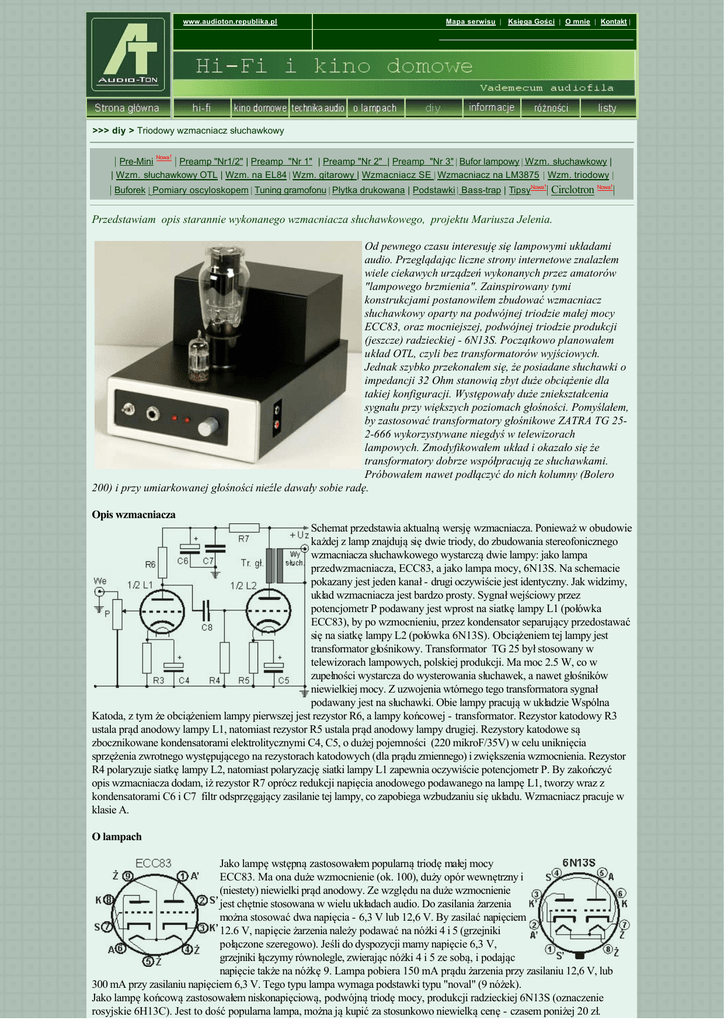 www.audioton.republika.pl Mapa serwisu | Księga Gości | O mnie | Kontakt | >>> diy > Triodowy wzmacniacz słuchawkowy | Pre-Mini Nowa! | Preamp "Nr1/2" | Preamp "Nr 1" | Preamp "Nr 2" | Preamp "Nr 3" | Bufor lampowy | Wzm. słuchawkowy | | Wzm. słuchawkowy OTL | Wzm. na EL84 | Wzm. gitarowy | Wzmacniacz SE | Wzmacniacz na LM3875 | Wzm. triodowy | | Buforek | Pomiary oscyloskopem | Tuning gramofonu | Płytka drukowana | Podstawki | Bass-trap | TipsyNowa!| Circlotron Nowa!| Przedstawiam opis starannie wykonanego wzmacniacza słuchawkowego, projektu Mariusza Jelenia. Od pewnego czasu interesuję się lampowymi układami audio. Przeglądając liczne strony internetowe znalazłem wiele ciekawych urządzeń wykonanych przez amatorów "lampowego brzmienia". Zainspirowany tymi konstrukcjami postanowiłem zbudować wzmacniacz słuchawkowy oparty na podwójnej triodzie małej mocy ECC83, oraz mocniejszej, podwójnej triodzie produkcji (jeszcze) radzieckiej - 6N13S. Początkowo planowałem układ OTL, czyli bez transformatorów wyjściowych. Jednak szybko przekonałem się, że posiadane słuchawki o impedancji 32 Ohm stanowią zbyt duże obciążenie dla takiej konfiguracji. Występowały duże zniekształcenia sygnału przy większych poziomach głośności. Pomyślałem, by zastosować transformatory głośnikowe ZATRA TG 252-666 wykorzystywane niegdyś w telewizorach lampowych. Zmodyfikowałem układ i okazało się że transformatory dobrze współpracują ze słuchawkami. Próbowałem nawet podłączyć do nich kolumny (Bolero 200) i przy umiarkowanej głośności nieźle dawały sobie radę. Opis wzmacniacza Schemat przedstawia aktualną wersję wzmacniacza. Ponieważ w obudowie każdej z lamp znajdują się dwie triody, do zbudowania stereofonicznego wzmacniacza słuchawkowego wystarczą dwie lampy: jako lampa przedwzmacniacza, ECC83, a jako lampa mocy, 6N13S. Na schemacie pokazany jest jeden kanał - drugi oczywiście jest identyczny. Jak widzimy, układ wzmacniacza jest bardzo prosty. Sygnał wejściowy przez potencjometr P podawany jest wprost na siatkę lampy L1 (połówka ECC83), by po wzmocnieniu, przez kondensator separujący przedostawać się na siatkę lampy L2 (połówka 6N13S). Obciążeniem tej lampy jest transformator głośnikowy. Transformator TG 25 był stosowany w telewizorach lampowych, polskiej produkcji. Ma moc 2.5 W, co w zupełności wystarcza do wysterowania słuchawek, a nawet głośników niewielkiej mocy. Z uzwojenia wtórnego tego transformatora sygnał podawany jest na słuchawki. Obie lampy pracują w układzie Wspólna Katoda, z tym że obciążeniem lampy pierwszej jest rezystor R6, a lampy końcowej - transformator. Rezystor katodowy R3 ustala prąd anodowy lampy L1, natomiast rezystor R5 ustala prąd anodowy lampy drugiej. Rezystory katodowe są zbocznikowane kondensatorami elektrolitycznymi C4, C5, o dużej pojemności (220 mikroF/35V) w celu uniknięcia sprzężenia zwrotnego występującego na rezystorach katodowych (dla prądu zmiennego) i zwiększenia wzmocnienia. Rezystor R4 polaryzuje siatkę lampy L2, natomiast polaryzację siatki lampy L1 zapewnia oczywiście potencjometr P. By zakończyć opis wzmacniacza dodam, iż rezystor R7 oprócz redukcji napięcia anodowego podawanego na lampę L1, tworzy wraz z kondensatorami C6 i C7 filtr odsprzęgający zasilanie tej lampy, co zapobiega wzbudzaniu się układu. Wzmacniacz pracuje w klasie A. O lampach Jako lampę wstępną zastosowałem popularną triodę małej mocy ECC83. Ma ona duże wzmocnienie (ok. 100), duży opór wewnętrzny i (niestety) niewielki prąd anodowy. Ze względu na duże wzmocnienie jest chętnie stosowana w wielu układach audio. Do zasilania żarzenia można stosować dwa napięcia - 6,3 V lub 12,6 V. By zasilać napięciem 12.6 V, napięcie żarzenia należy podawać na nóżki 4 i 5 (grzejniki połączone szeregowo). Jeśli do dyspozycji mamy napięcie 6,3 V, grzejniki łączymy równolegle, zwierając nóżki 4 i 5 ze sobą, i podając napięcie także na nóżkę 9. Lampa pobiera 150 mA prądu żarzenia przy zasilaniu 12,6 V, lub 300 mA przy zasilaniu napięciem 6,3 V. Tego typu lampa wymaga podstawki typu "noval" (9 nóżek). Jako lampę końcową zastosowałem niskonapięciową, podwójną triodę mocy, produkcji radzieckiej 6N13S (oznaczenie rosyjskie 6H13C). Jest to dość popularna lampa, można ją kupić za stosunkowo niewielką cenę - czasem poniżej 20 zł. Lampa ta zawiera w szklanej obudowie dwie triody o mocy ok. 13 W każda. Można ją zasilać niskim napięciem anodowym 90 V i daje spory jak na lampę, prąd anodowy - 70-90 mA (z każdej triody). Nie ma dużego współczynnika wzmocnienia, tylko 2,5. Napięcie żarzenia to 6,3 V, natomiast wymagany prąd żarzenia jest dość duży, bo aż 2,5 A. Lampa mocno się grzeje, pamiętajmy o tym podczas planowania wzmacniacza. Do tej lampy stosuje się podstawki typu "oktal" (8 nóżek). Rysunek z lewej, schemat lampy ECC83, z prawej - 6N13S. Widok od dołu lamp. Zasilacz Do zasilania układu użyłem transformatora typu TS 20/60/nn/01, który przewinąłem tak, by uzyskać na wyjściu odpowiednio : 6,3V 3A, oraz 180V, 250mA. Umieściłem go w osłonie z blachy, by zmniejszyć wpływ pola magnetycznego na pozostałe części układu. Układ zasilacza jest bardzo prosty. Żarzenie lamp odbywa się za pomocą napięcia zmiennego 6,3V. Rezystory R8 i R9 symetryzują napięcie, dzięki czemu zmniejsza się przydźwięk sieciowy przedostający się do układu wzmacniacza przez układ żarzenia lamp. Dioda elektroluminescencyjna D sygnalizuje pracę wzmacniacza. Stałe napięcie anodowe (+Uz) uzyskuje się po wyprostowaniu napięcia zmiennego 180 V (mostek prostowniczy M) i odfiltrowaniu przez filtr RC, składający się z kondensatorów wysokonapięciowych C1, C2 i C3 oraz rezystora R1. Rezystor R2 rozładowuje kondensatory po wyłączeniu zasilania. Napięcie anodowe włączane jest po upływie 1 minuty poprzez układ cza
