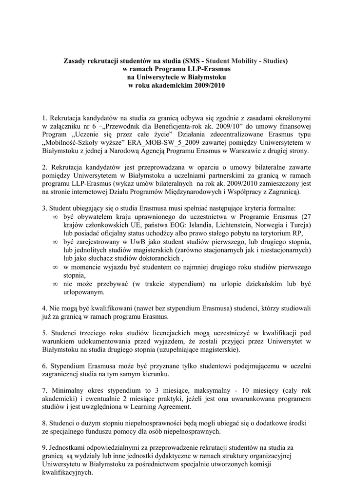 Zasady rekrutacji studentów na studia (SMS - Student Mobility - Studies) w ramach Programu LLP-Erasmus na Uniwersytecie w Białymstoku w roku akademickim 2009/2010 1. Rekrutacja kandydatów na studia za granicą odbywa się zgodnie z zasadami określonymi w załączniku nr 6 –„Przewodnik dla Beneficjenta-rok ak. 2009/10” do umowy finansowej Program „Uczenie się przez całe życie” Działania zdecentralizowane Erasmus typu „Mobilność-Szkoły wyższe” ERA_MOB-SW_5_2009 zawartej pomiędzy Uniwersytetem w Białymstoku z jednej a Narodową Agencją Programu Erasmus w Warszawie z drugiej strony. 2. Rekrutacja kandydatów jest przeprowadzana w oparciu o umowy bilateralne zawarte pomiędzy Uniwersytetem w Białymstoku a uczelniami partnerskimi za granicą w ramach programu LLP-Erasmus (wykaz umów bilateralnych na rok ak. 2009/2010 zamieszczony jest na stronie internetowej Działu Programów Międzynarodowych i Współpracy z Zagranicą). 3. Student ubiegający się o studia Erasmusa musi spełniać następujące kryteria formalne: • być obywatelem kraju uprawnionego do uczestnictwa w Programie Erasmus (27 krajów członkowskich UE, państwa EOG: Islandia, Lichtenstein, Norwegia i Turcja) lub posiadać oficjalny status uchodźcy albo prawo stałego pobytu na terytorium RP, • być zarejestrowany w UwB jako student studiów pierwszego, lub drugiego stopnia, lub jednolitych studiów magisterskich (zarówno stacjonarnych jak i niestacjonarnych) lub jako słuchacz studiów doktoranckich , • w momencie wyjazdu być studentem co najmniej drugiego roku studiów pierwszego stopnia, • nie może przebywać (w trakcie stypendium) na urlopie dziekańskim lub być urlopowanym. 4. Nie mogą być kwalifikowani (nawet bez stypendium Erasmusa) studenci, którzy studiowali już za granicą w ramach programu Erasmus. 5. Studenci trzeciego roku studiów licencjackich mogą uczestniczyć w kwalifikacji pod warunkiem udokumentowania przed wyjazdem, że zostali przyjęci przez Uniwersytet w Białymstoku na studia drugiego stopnia (uzupełniające magisterskie). 6. Stypendium Erasmusa może być przyznane tylko studentowi podejmującemu w uczelni zagranicznej studia na tym samym kierunku. 7. Minimalny okres stypendium to 3 miesiące, maksymalny - 10 miesięcy (cały rok akademicki) i ewentualnie 2 miesiące praktyki, jeżeli jest ona uwarunkowana programem studiów i jest uwzględniona w Learning Agreement. 8. Studenci o dużym stopniu niepełnosprawności będą mogli ubiegać się o dodatkowe środki ze specjalnego funduszu pomocy dla osób niepełnosprawnych. 9. Jednostkami odpowiedzialnymi za przeprowadzenie rekrutacji studentów na studia za granicą są wydziały lub inne jednostki dydaktyczne w ramach struktury organizacyjnej Uniwersytetu w Białymstoku za pośrednictwem specjalnie utworzonych komisji kwalifikacyjnych. 10. Koordynacją prac komisji kwalifikacyjnej właściwej jednostki zajmuje się koordynator wyznaczony przez daną jednostkę, który jest jednocześnie odpowiedzialny za bezpośrednią współpracę z Działem Programów Międzynarodowych i Współpracy z Zagranicą Uniwersytetu w Białymstoku. 11. W skład komisji kwalifikacyjnej właściwej jednostki wchodzi: • koordynator jednostki zajmujący się Programem Erasmus, • osoba sprawdzająca znajomość języka, • przedstawiciel studentów, • oraz inne osoby w zależności od zakresu przedmiotowego Wydziału. 12. Podstawowe kryteria selekcji kandydatów to: średnia ocen nie niższa niż 3,5 oraz dobra znajomość języka obcego, w którym prowadzone są wykłady w uczelni partnerskiej (najlepiej potwierdzona certyfikatem zewnętrznym). 13. W rekrutacji pierwszeństwo przyznaje się studentom starszych lat studiów. • niezbędnym warunkiem uczestnictwa w kwalifikacji jest zaliczenie roku poprzedniego na uczelni macierzystej, • w uzasadnionych przypadkach możliwe jest wysyłanie studenta posiadającego wpis warunkowy. 14. W przypadku większej ilości studentów niż posiadanych miejsc, kryterium pierwszeństwa stanowi wyższa średnia z dotychczasowego okresu studiów. 15. Wydziały mogą ustalać dodatkowe kryteria rekrutacji. 16. Komisja kwalifikacyjna ustala i podaje do publicznej wiadomości, poprzez zamieszczenie na tablicy ogłoszeniowej i w Internecie, terminy, procedury kwalifikacji oraz listy kandydatów zakwalifikowanych do wyjazdu na studia za granicą oraz listy rezerwowej. 17. Odwołania należy kierować niezwłocznie do Koordynatora Uczelnianego. 18. Protokoły z posiedzeń komisji kwalifikacyjnych powinny być przekazane wraz z oryginałami formularzy zawierających podstawowe dane studenta : Zgłoszenie kandydatury studenta/studentki na wyjazd w ramach programu LLP- Erasmus w roku akademickim ........ do Działu Programów Międzynarodowych i Współpracy z Zagranicą Uniwersytetu w Białymstoku w terminie do 31 marca. 19. W przypadku wolnych miejsc na studia może być przeprowadzona przez wydziały dodatkowa rekrutacja dotycząca wyjazdów na studia w semestrze letnim, roku akademickiego 2009/10. 20. Kandydat, który rezygnuje z wyjazdu, powinien pisemnie poinformować o tym fakcie właściwego koordynatora oraz Dział Programów Międzynarodowych i Współpracy z Zagranicą Uniwersytetu w Białymstoku. Powyższe zasady zostały zatwierdzone na posiedzeniu koordynatorów wydziałowych/instytutowych programu Erasmus w dniu 13.10.2009 2