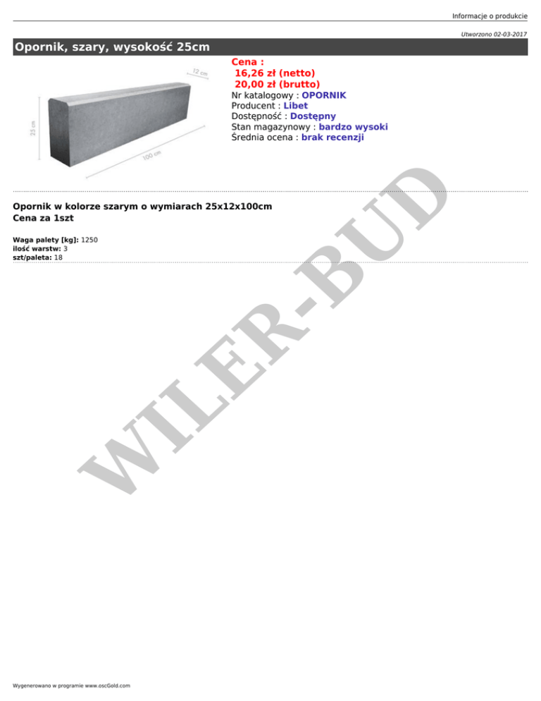 Informacje o produkcie Utworzono 02-03-2017 Opornik, szary, wysokość 25cm Cena : 16,26 zł (netto) 20,00 zł (brutto) Opornik w kolorze szarym o wymiarach 25x12x100cm Cena za 1szt W IL ER -B Waga palety [kg]: 1250 ilość warstw: 3 szt/paleta: 18 U D Nr katalogowy : OPORNIK Producent : Libet Dostępność : Dostępny Stan magazynowy : bardzo wysoki Średnia ocena : brak recenzji Wygenerowano w programie www.oscGold.com