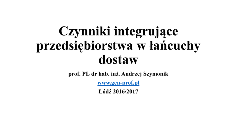 Czynniki integrujące przedsiębiorstwa w łańcuchy dostaw prof. PŁ dr hab. inż. Andrzej Szymonik www.gen-prof.pl Łódź 2016/2017 Przedsiębiorstwa w górnej i dolnej części łańcucha dostaw ŁD- to: górną część łańcucha, czyli odcinek, w którym zlokalizowane są czynności lub firmy zajmujące wcześniejszą pozycję w stosunku do danej czynności lub firmy; dolną część łańcucha, czyli odcinek, w którym zlokalizowane są czynności lub firmy zajmujące późniejszą pozycję w stosunku do danej czynności lub firmy; cd. ŁD- to: dostawcę pierwszego rzędu – podmiot dostarczający produkty lub świadczący usługi bezpośrednio danej firmie; dostawcę drugiego rzędu – podmiot dostarczający produkty lub świadczący usługi dostawcy pierwszego rzędu obsługującemu daną firmę. Przykład ŁD w praktyce – sklep sprzedający glazurę: kopalnie wydobywające glinę do produkcji glazury; firmy transportowe (morskie, kolejowe, samochodowe) dostarczające surowiec do zakładów produkcyjnych; zakłady ceramiczne; przykład ŁD w praktyce – sklep sprzedający glazurę: hurtowników, którzy decydują, jaką glazurę sprzedawać i gdzie; przedsiębiorstwa transportowe dowożące produkty gotowe zgodnie z wymogami rynku; zakłady produkujące dodatkowe elementy (np. klej, listwy, narożniki) dla firm usługowych kładących glazurę ścienną czy podłogową; przedsiębiorstwa dowożące dodatkowe elementy do hurtowników czy odbiorców indywidualnych; firmy telekomunikacyjne i informatyczne ułatwiające przepływ informacji, który towarzyszy przemieszczaniu dóbr i usług, by wszelkie dostawy odbywały się na zasadzie JiT; instytucje bankowe zainteresowane obsługą klienta i udzielaniem kredytów. Narzędzia i instrumenty integrujące przedsiębiorstwa w łańcuchy dostaw Zaufanie Działania nieetyczne: niewykonywanie zobowiązań przez organizację gospodarczą, firmę lub człowieka –powiązanych w ramach łańcucha dostaw; podłączenie się organizacji - szczególnie w ramach łańcucha dostaw która ma podważyć dobre imię i skompromitować inną o charakterze globalnym; firmę na rynku, najczęściej cd. działania nieetyczne: • postępowanie niezgodne z interesami własnego kraju, np. członkowie organizacji wirtualnych pragną ominąć embarga, inne ograniczenia prawne czy skorzystać z ulg podatkowych. Definicje zaufania: kompetencje – umiejętność lub/i zdolność do wykonywania tego co potrzeba; przewidywalność – dotyczy działania stron (zarówno pożądanych, jak i niepożądanych), które są wystarczające, aby można na ich podstawie było przewidywać przyszłe sytuacje. cd. definicje zaufania: życzliwość – oznacza troskę i motywację do działania w interesie drugiej strony i stanowi przeciwieństwo działań oportunistycznych; uczciwość – to zawieranie umów w dobrej wierze, mówienie prawdy, dotrzymywanie obietnic; Narzędzia zaufania: zmniejszenie subiektywnej i obiektywnej niepewności oraz ryzyka kontrahenta z przeprowadzaną operacją i transakcją; przekonanie potencjalnego klienta do dokonania operacji, zakupu; zwiększanie lojalności już zdobytego klienta; zwiększanie udziału usług internetowych w wydatkach klienta, zarówno kosztem zmniejszenia ilości operacji dokonywanych za pomocą tradycyjnych kanałów dystrybucji, jak i innych sklepów internetowych; cd. narzędzia zaufania: pogłębianie relacji z klientem; poprawa zadowolenia klienta; zbieranie danych celem pogłębienia relacji z klientem. Partnerstwo Definicja (I): • Dojrzała forma bycia w relacji, współpracy z innymi. Partnerzy mówią: jesteśmy sobie równi, szanujemy się, mamy wspólne cele, współdziałamy, ufamy sobie, wspieramy się, otwarcie nazywamy swoje oczekiwania i potrzeby, o różnicach dyskutujemy, szukając rozwiązań, które są do zaakceptowania przez obie strony, zawsze używamy argumentów, a nie siły. Takie partnerstwo musi opierać się na wartościach, bo na każdym kroku poddawane jest próbom i weryfikacji. Jest wyzwaniem dla ludzi i organizacji. Definicja (II): Podział pracy i zasobów służący optymalizacji wykorzystania umiejętności partnera, w celu dzielenia zysków, strat i zobowiązań. Partnerstwo w łańcuchu dostaw: Kształtowanie stosunków gospodarczych między jego uczestnikami na zasadach zaufania, podziału ryzyka i korzyści, prowadzące do uzyskania dodatkowych efektów synergicznych i przewagi konkurencyjnej. Co kształtuje partnerstwo w ŁD? powstania nowych form organizacyjnych w biznesie (np. przedsiębiorstwa rozległe, wirtualne, sieciowe); przyspieszonych zmian technologicznych i ich starzenia się, wymagające szybszej deprecjacji (spadku) kapitału i inwestycji know – how; cd. Co kształtuje partnerstwo w ŁD? trudności w utrzymaniu zadowalającej zyskowności przedsiębiorstwa, skłaniającej do poszukiwania sposobów redukcji kosztów; wzrastającej złożoności wielu produktów oraz różnorodności procesów technologicznych; rosnącej liczby uregulowań prawnych; cd. Co kształtuje partnerstwo w ŁD? intensywnej konkurencji w skali całego świata, która stanowi silny bodziec skłaniający przedsiębiorstwa do poszukiwania partnerów rynkowych, dzięki którym będzie możliwe obniżenie poziomu ryzyka towarzyszącego określonym przedsięwzięciom (np. wejściu na rynki zagraniczne, wprowadzaniu nowych produktów itp.); łączeniu swoich sił przez przedsiębiorstwa produkcyjne i handlowe na płaszczyźnie szeroko pojętych badań rynkowych; Co kształtuje partnerstwo w ŁD? likwidacji granic rynków lokalnych i globalnych w wyniku mobilności konsumentów, którzy posiadają własne wzory i upodobania; odchodzenie od wszelkich form pośrednictwa na rzecz zakupów bezpośrednich często między producentem a finalnymi (jest to szczególnie widoczne w e-biznesie). odbiorcami Partnerstwo w ŁD – korzyści: redukcja niepewności; zwiększenie elastyczności; możliwo