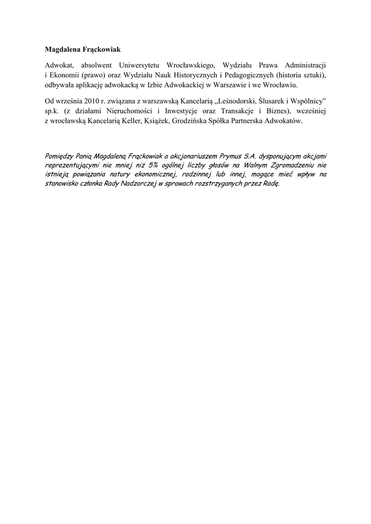 Magdalena Frąckowiak Adwokat, absolwent Uniwersytetu Wrocławskiego, Wydziału Prawa Administracji i Ekonomii (prawo) oraz Wydziału Nauk Historycznych i Pedagogicznych (historia sztuki), odbywała aplikację adwokacką w Izbie Adwokackiej w Warszawie i we Wrocławiu. Od września 2010 r. związana z warszawską Kancelarią „Leśnodorski, Ślusarek i Wspólnicy” sp.k. (z działami Nieruchomości i Inwestycje oraz Transakcje i Biznes), wcześniej z wrocławską Kancelarią Keller, Książek, Grodzińska Spółka Partnerska Adwokatów. Pomiędzy Panią Magdaleną Frąckowiak a akcjonariuszem Prymus S.A. dysponującym akcjami reprezentującymi nie mniej niŜ 5% ogólnej liczby głosów na Walnym Zgromadzeniu nie istnieją powiązania natury ekonomicznej, rodzinnej lub innej, mogące mieć wpływ na stanowisko członka Rady Nadzorczej w sprawach rozstrzyganych przez Radę.