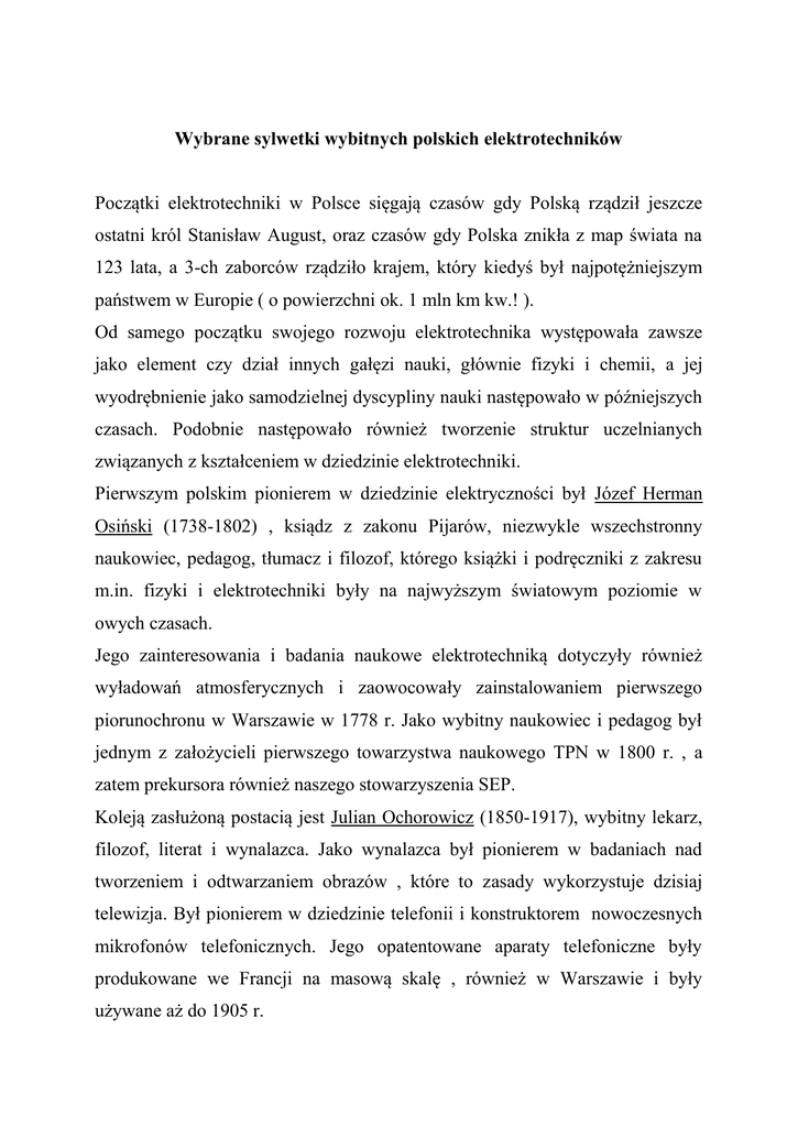 Wybrane sylwetki wybitnych polskich elektrotechników Początki elektrotechniki w Polsce sięgają czasów gdy Polską rządził jeszcze ostatni król Stanisław August, oraz czasów gdy Polska znikła z map świata na 123 lata, a 3-ch zaborców rządziło krajem, który kiedyś był najpotężniejszym państwem w Europie ( o powierzchni ok. 1 mln km kw.! ). Od samego początku swojego rozwoju elektrotechnika występowała zawsze jako element czy dział innych gałęzi nauki, głównie fizyki i chemii, a jej wyodrębnienie jako samodzielnej dyscypliny nauki następowało w późniejszych czasach. Podobnie następowało również tworzenie struktur uczelnianych związanych z kształceniem w dziedzinie elektrotechniki. Pierwszym polskim pionierem w dziedzinie elektryczności był Józef Herman Osiński (1738-1802) , ksiądz z zakonu Pijarów, niezwykle wszechstronny naukowiec, pedagog, tłumacz i filozof, którego książki i podręczniki z zakresu m.in. fizyki i elektrotechniki były na najwyższym światowym poziomie w owych czasach. Jego zainteresowania i badania naukowe elektrotechniką dotyczyły również wyładowań atmosferycznych i zaowocowały zainstalowaniem pierwszego piorunochronu w Warszawie w 1778 r. Jako wybitny naukowiec i pedagog był jednym z założycieli pierwszego towarzystwa naukowego TPN w 1800 r. , a zatem prekursora również naszego stowarzyszenia SEP. Koleją zasłużoną postacią jest Julian Ochorowicz (1850-1917), wybitny lekarz, filozof, literat i wynalazca. Jako wynalazca był pionierem w badaniach nad tworzeniem i odtwarzaniem obrazów , które to zasady wykorzystuje dzisiaj telewizja. Był pionierem w dziedzinie telefonii i konstruktorem nowoczesnych mikrofonów telefonicznych. Jego opatentowane aparaty telefoniczne były produkowane we Francji na masową skalę , również w Warszawie i były używane aż do 1905 r. Julian Ochorowicz był również konstruktorem nowych przyrządów elektrycznych (np. galwanometrów), które jako lekarz wykorzystywał do badań lekarskich (w badaniach parapsychologicznych). Wykładał na Uniwersytecie Lwowskim, a pracował m.in. w Paryżu i Warszawie. Niezwykle zasłużoną postacią w rozwoju polskiej elektrotechniki był Ignacy Mościcki (1867-1946) – prezydent Rzeczpospolitej Polskiej w latach 1926 – 1939 r. Ignacy Mościcki był profesorem w dziedzinie chemii i elektrotechniki, pracował na Uniwersytecie Lwowskim i na Politechnice Warszawskiej, był również inżynierem i wybitnym wynalazcą i projektantem. W dziedzinie elektrotechniki zajmował się techniką wysokich napięć i ochroną przepięciową, a efektem jego pracy były m.in. kondensatory wysokonapięciowe produkowane w Szwajcarii, zawory przepięciowe i prostowniki wysokiego napięcia. Największe zasługi dla kraju w technice Ignacy Mościcki odniósł dziedzinie elektrochemii projektując fabryki chemiczne m.in. do produkcji kwasu azotowego, nawozów sztucznych i rafinacji ropy naftowej. Jego metody i opatentowane technologie były rewelacyjne w skali światowej i zostały wdrożone w przemyśle chemicznym w wielu krajach europejskich, jak również w USA. Po odzyskaniu przez Polskę niepodległości wniósł ogromny wkład pod budowę polskiego przemysłu chemicznego ( dla przemysłu zbrojeniowego, rolnictwa itp.), organizując i budując takie zakłady chemiczne jak kombinat związków azotowych w Chorzowie i kombinat chemiczny Mościce k. Tarnowa. Jego dorobek naukowy to przeszło 60 prac naukowych, 40 patentów polskich i zagranicznych, a za swoje zasługi naukowe otrzymał 8 doktoratów honoris causa. Jako wybitny Polak był 2-krotnie wybierany prezydentem Rzeczypospolitej w latach 1926 i 1933. Pionierem elektryfikacji polskich kolei był Roman Podoski (1873-1954). Po ukończeniu studiów na Politechnice Lwowskiej a następnie w Zurichu w 1897 r. podjął pracę za granicą m.in. we Włoszech, na Sycylii, również na Ukrainie, gdzie budował pierwsze linie tramwajowe i elektrownie. Po powrocie do kraju rozpoczął w 1907 r. pracę przy elektryfikacji linii tramwajowej w Warszawie, oddaną do użytku w 1908 r. Po uzyskaniu niepodległości przez Polskę w 1918 r. opracowywał projekty elektryfikacji kolei w Polsce, jak również był profesorem na Politechnice Warszawskiej, gdzie wykładał przedmioty związane z elektryfikacją kolei. Niezwykle zasłużonym dla rozwoju elektrotechniki w Polsce był Kazimierz Szpotański (1887-1966). Ten niezwykle utalentowany Polak i wielki patriota od samego początku swojej działalności uważał , że rozwój ekonomiczny i cywilizacyjny kraju musi odbywać się przy powszechnej elektryfikacji całej gospodarki i wszelkich dziedzin życia. Po studiach wyższych na uczelniach niemieckich i praktykach zawodowych w renomowanych zakładach i koncernach np. AEG nabył cenne doświadczenia do dalszej działalności. Niezwłocznie po odzyskaniu niepodległości przez Polskę w 1918 r. utworzył w Warszawie „Fabrykę Aparatów Elektrycznych” ( początkowo zatrudniającą 2 pracowników !) , jako zalążek planowanej powszechnej elektryfikacji kraju. Jako niezwykle utalentowany przedsiębiorca i menadżer doprowadził, pomimo różnych trudności ( kryzysu), do rozkwitu bardzo nowoczesnej firmy, która przed wybuchem wojny zatrudniała ponad 1500 pracowników i produkowała ok. 400 różnych aparatów elektrycznych na najwyższym światowym poziomie. Jako wielki patriota Kazimierz Szpotański przyczynił się w czasie II wojny swoją działalnością do ocalenia wielu Polaków przed ich zagładą przez nazistów. Z nazwiskiem Kazimierz Szpotańskiego jako współpracownicy, nieodłącznie kojarzą się również nazwiska innych, licznych zasłużonych polskich elektryków, jak Jabłoński, Szpor, Mejro, Podoski, Drewnowski , Obrąpalski i inni. Z nazwiskiem Kazimierza Szpotańskiego wiąże się również ściśle Stowarzyszenie Elektryków Polskich . W 1919 r. powołano Stowarzyszenie Elektrotechników Polskich