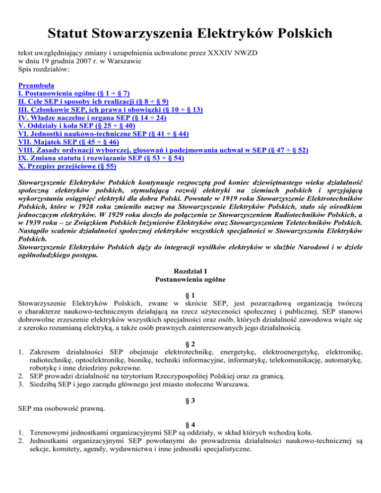 Statut Stowarzyszenia Elektryków Polskich tekst uwzględniający zmiany i uzupełnienia uchwalone przez XXXIV NWZD w dniu 19 grudnia 2007 r. w Warszawie Spis rozdziałów: Preambuła I. Postanowienia ogólne (§ 1 ÷ § 7) II. Cele SEP i sposoby ich realizacji (§ 8 ÷ § 9) III. Członkowie SEP, ich prawa i obowiązki (§ 10 ÷ § 13) IV. Władze naczelne i organa SEP (§ 14 ÷ 24) V. Oddziały i koła SEP (§ 25 ÷ § 40) VI. Jednostki naukowo-techniczne SEP (§ 41 ÷ § 44) VII. Majątek SEP (§ 45 ÷ § 46) VIII. Zasady ordynacji wyborczej, głosowań i podejmowania uchwał w SEP (§ 47 ÷ § 52) IX. Zmiana statutu i rozwiązanie SEP (§ 53 ÷ § 54) X. Przepisy przejściowe (§ 55) Stowarzyszenie Elektryków Polskich kontynuuje rozpoczętą pod koniec dziewiętnastego wieku działalność społeczną elektryków polskich, stymulującą rozwój elektryki na ziemiach polskich i sprzyjającą wykorzystaniu osiągnięć elektryki dla dobra Polski. Powstałe w 1919 roku Stowarzyszenie Elektrotechników Polskich, które w 1928 roku zmieniło nazwę na Stowarzyszenie Elektryków Polskich, stało się ośrodkiem jednoczącym elektryków. W 1929 roku doszło do połączenia ze Stowarzyszeniem Radiotechników Polskich, a w 1939 roku – ze Związkiem Polskich Inżynierów Elektryków oraz Stowarzyszeniem Teletechników Polskich. Nastąpiło scalenie działalności społecznej elektryków wszystkich specjalności w Stowarzyszeniu Elektryków Polskich. Stowarzyszenie Elektryków Polskich dąży do integracji wysiłków elektryków w służbie Narodowi i w dziele ogólnoludzkiego postępu. Rozdział I Postanowienia ogólne §1 Stowarzyszenie Elektryków Polskich, zwane w skrócie SEP, jest pozarządową organizacją twórczą o charakterze naukowo-technicznym działającą na rzecz użyteczności społecznej i publicznej. SEP stanowi dobrowolne zrzeszenie elektryków wszystkich specjalności oraz osób, których działalność zawodowa wiąże się z szeroko rozumianą elektryką, a także osób prawnych zainteresowanych jego działalnością. §2 1. Zakresem działalności SEP obejmuje elektrotechnikę, energetykę, elektroenergetykę, elektronikę, radiotechnikę, optoelektronikę, bionikę, techniki informacyjne, informatykę, telekomunikację, automatykę, robotykę i inne dziedziny pokrewne. 2. SEP prowadzi działalność na terytorium Rzeczypospolitej Polskiej oraz za granicą. 3. Siedzibą SEP i jego zarządu głównego jest miasto stołeczne Warszawa. §3 SEP ma osobowość prawną. §4 1. Terenowymi jednostkami organizacyjnymi SEP są oddziały, w skład których wchodzą koła. 2. Jednostkami organizacyjnymi SEP powołanymi do prowadzenia działalności naukowo-technicznej są sekcje, komitety, agendy, wydawnictwa i inne jednostki specjalistyczne. 3. Oddział może uzyskać osobowość prawną na podstawie niniejszego statutu i uchwały walnego zgromadzenia delegatów oddziału, poprzedzonej pozytywną opinią Zarządu Głównego SEP. Od-dział, który uzyskał osobowość prawną pozostaje nadal terenową jednostką organizacyjną SEP. 4. Każda jednostka organizacyjna SEP działa na podstawie i zgodnie z niniejszym statutem. §5 1. SEP opiera swoją działalność na pracy społecznej członków; do prowadzenia swych spraw może zatrudniać pracowników. 2. Działalność SEP, wszystkich jego władz i organów jest jawna. 3. SEP może prowadzić działalność gospodarczą służącą realizacji celów statutowych, z której dochody przeznacza na te cele. Działalność gospodarcza może być prowadzona w ramach stowarzyszenia lub poprzez powołane w tym celu inne podmioty, zgodnie z obowiązującą ustawą o działalności gospodarczej. §6 1. SEP może być członkiem naukowych, technicznych i gospodarczych organizacji krajowych i zagranicznych. 2. SEP może być założycielem fundacji realizujących między innymi cele określone w niniejszym statucie. 3. SEP może tworzyć związki stowarzyszeń. §7 1. Godłem SEP są stylizowane białe litery SEP na niebieskim tle, zamknięte białym okręgiem. Wzorzec godła jest umieszczony na okładce statutu. Godło podlega ochronie prawnej. 2. SEP posiada sztandar oraz odznaki członkowskie. 3. Za zasługi dla SEP lub szeroko pojętej elektryki mogą być przyznawane: godność członka honorowego i godność zasłużonego seniora, odznaki honorowe, medale oraz inne wyróżnienia. Rozdział II Cele SEP i sposoby ich realizacji §8 Cele SEP są następujące: 1) propagowanie społecznie użytecznego wykorzystywania elektryki dla wspomagania rozwoju gospodarczego kraju, 2) inicjowanie i popieranie twórczości naukowej i technicznej we wszystkich dziedzinach elektryki i dziedzinach pokrewnych; popularyzowanie elektryki, jej historii i twórców - szczególnie polskich, 3) działanie na rzecz gospodarki energetycznej w zakresie wytwarzania, przetwarzania, przesyłania, dystrybucji i użytkowania paliw i energii we wszystkich postaciach oraz eksploatacji urządzeń, instalacji i sieci, 4) działanie na rzecz rozwoju systemów informatycznych i telekomunikacyjnych oraz społeczeństwa informacyjnego, 5) oddziaływanie na jakość wyrobów, materiałów i usług elektrycznych oraz upowszechnianie i ochro-na praw konsumentów; popularyzacja bezpiecznego i racjonalnego użytkowania wyrobów elektrycznych oraz energii elektrycznej, 6) doskonalenie kwalifikacji zawodowych oraz kształtowanie etyki zawodowej elektryków, 7) krzewienie w społeczeństwie kultury technicznej i ekologicznej, ochrony dziedzictwa przyrodniczego i poszanowania energii, 8) integrowanie środowiska i tworzenie przyjacielskich więzi członków, 9) rozwijanie kontaktów i współpracy między społeczeństwami, w tym z międzynarodowymi i zagranicznymi organizacjami elektryków, 10) ochrona zawodu i interesów członków SEP. §9 SEP realizuje swoje cele przede wszystkim przez: 1) monitorowanie i rozpatrywanie zagadnień naukowo-technicznych, prawnych, organizacyjnych, ekon
