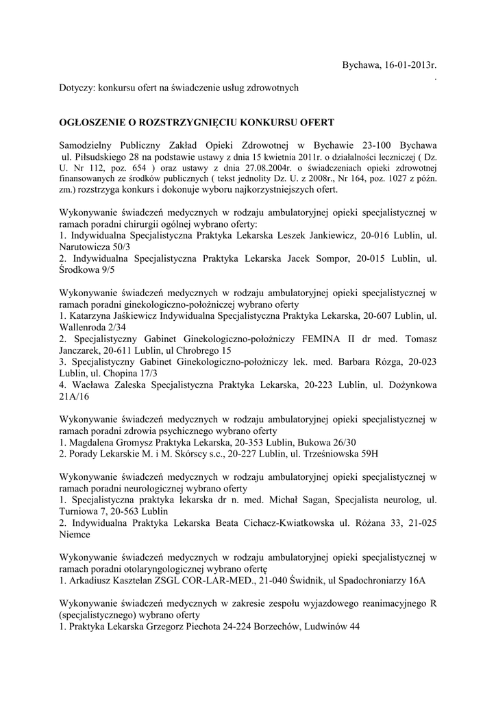 Bychawa, 16-01-2013r. . Dotyczy: konkursu ofert na świadczenie usług zdrowotnych OGŁOSZENIE O ROZSTRZYGNIĘCIU KONKURSU OFERT Samodzielny Publiczny Zakład Opieki Zdrowotnej w Bychawie 23-100 Bychawa ul. Piłsudskiego 28 na podstawie ustawy z dnia 15 kwietnia 2011r. o działalności leczniczej ( Dz. U. Nr 112, poz. 654 ) oraz ustawy z dnia 27.08.2004r. o świadczeniach opieki zdrowotnej finansowanych ze środków publicznych ( tekst jednolity Dz. U. z 2008r., Nr 164, poz. 1027 z późn. zm.) rozstrzyga konkurs i dokonuje wyboru najkorzystniejszych ofert. Wykonywanie świadczeń medycznych w rodzaju ambulatoryjnej opieki specjalistycznej w ramach poradni chirurgii ogólnej wybrano oferty: 1. Indywidualna Specjalistyczna Praktyka Lekarska Leszek Jankiewicz, 20-016 Lublin, ul. Narutowicza 50/3 2. Indywidualna Specjalistyczna Praktyka Lekarska Jacek Sompor, 20-015 Lublin, ul. Środkowa 9/5 Wykonywanie świadczeń medycznych w rodzaju ambulatoryjnej opieki specjalistycznej w ramach poradni ginekologiczno-położniczej wybrano oferty 1. Katarzyna Jaśkiewicz Indywidualna Specjalistyczna Praktyka Lekarska, 20-607 Lublin, ul. Wallenroda 2/34 2. Specjalistyczny Gabinet Ginekologiczno-położniczy FEMINA II dr med. Tomasz Janczarek, 20-611 Lublin, ul Chrobrego 15 3. Specjalistyczny Gabinet Ginekologiczno-położniczy lek. med. Barbara Rózga, 20-023 Lublin, ul. Chopina 17/3 4. Wacława Zaleska Specjalistyczna Praktyka Lekarska, 20-223 Lublin, ul. Dożynkowa 21A/16 Wykonywanie świadczeń medycznych w rodzaju ambulatoryjnej opieki specjalistycznej w ramach poradni zdrowia psychicznego wybrano oferty 1. Magdalena Gromysz Praktyka Lekarska, 20-353 Lublin, Bukowa 26/30 2. Porady Lekarskie M. i M. Skórscy s.c., 20-227 Lublin, ul. Trześniowska 59H Wykonywanie świadczeń medycznych w rodzaju ambulatoryjnej opieki specjalistycznej w ramach poradni neurologicznej wybrano oferty 1. Specjalistyczna praktyka lekarska dr n. med. Michał Sagan, Specjalista neurolog, ul. Turniowa 7, 20-563 Lublin 2. Indywidualna Praktyka Lekarska Beata Cichacz-Kwiatkowska ul. Różana 33, 21-025 Niemce Wykonywanie świadczeń medycznych w rodzaju ambulatoryjnej opieki specjalistycznej w ramach poradni otolaryngologicznej wybrano ofertę 1. Arkadiusz Kasztelan ZSGL COR-LAR-MED., 21-040 Świdnik, ul Spadochroniarzy 16A Wykonywanie świadczeń medycznych w zakresie zespołu wyjazdowego reanimacyjnego R (specjalistycznego) wybrano oferty 1. Praktyka Lekarska Grzegorz Piechota 24-224 Borzechów, Ludwinów 44 2. Indywidualna Praktyka Lekarska Michał Pasternak, 20-560 Lublin, ul. Wyżynna 21/59 3. Indywidualna Praktyka Lekarska Daniel Pietrzak, 20-603 Lublin, ul. Wileńska 11/103 4. Prywatna Praktyka Lekarska Łukasz Dudek 20-857 Lublin ul. Harnasie 6/6 5. Indywidualna Praktyka Lekarska Arkadiusz Król, 20-134 Lublin, ul. Wiejska 20 6. Indywidualna Praktyka Lekarska Waldemar Kostrzewa, 23-100 Bychawa, ul. A. Mickiewicza 36 7. Indywidualna Praktyka Lekarska Piotr Otrocki, 23-107 Strzyżewice, Piotrowice 93/2 Dziękujemy za udział w postępowaniu. p.o. Dyrektora SP ZOZ w Bychawie lek .med. Piotr Wojtaś Przewodnicząca Komisji Konkursowej Specjalista ds. zamówień publicznych mgr Monika Surma