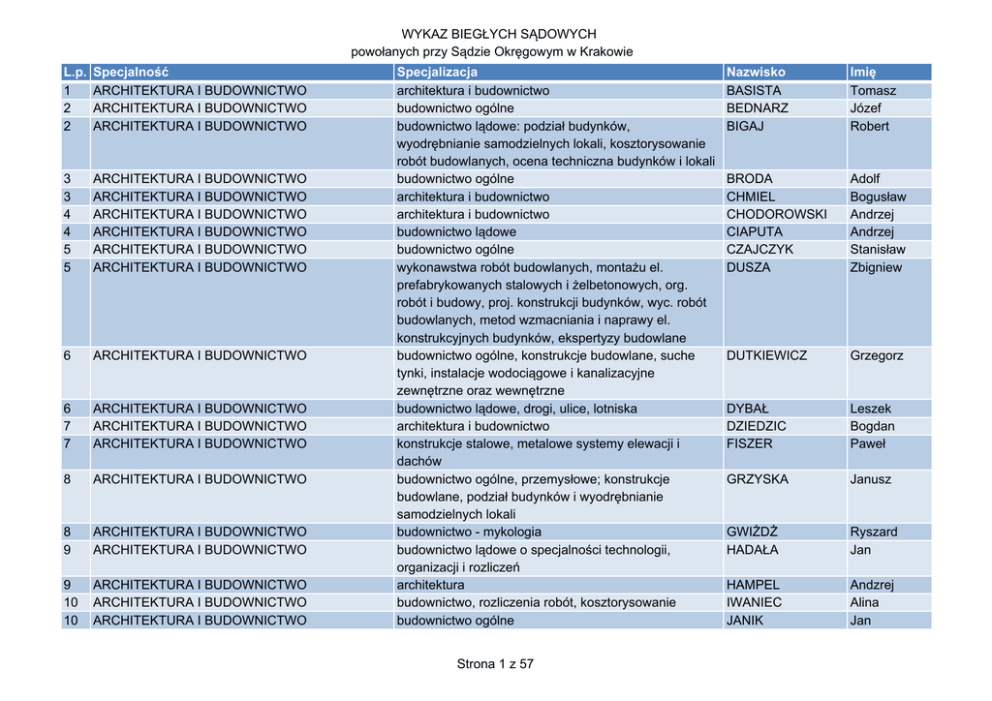WYKAZ BIEGŁYCH SĄDOWYCH powołanych przy Sądzie Okręgowym w Krakowie L.p. 1 2 2 Specjalność ARCHITEKTURA I BUDOWNICTWO ARCHITEKTURA I BUDOWNICTWO ARCHITEKTURA I BUDOWNICTWO 3 3 4 4 5 5 ARCHITEKTURA I BUDOWNICTWO ARCHITEKTURA I BUDOWNICTWO ARCHITEKTURA I BUDOWNICTWO ARCHITEKTURA I BUDOWNICTWO ARCHITEKTURA I BUDOWNICTWO ARCHITEKTURA I BUDOWNICTWO 6 ARCHITEKTURA I BUDOWNICTWO 6 7 7 ARCHITEKTURA I BUDOWNICTWO ARCHITEKTURA I BUDOWNICTWO ARCHITEKTURA I BUDOWNICTWO 8 ARCHITEKTURA I BUDOWNICTWO 8 9 ARCHITEKTURA I BUDOWNICTWO ARCHITEKTURA I BUDOWNICTWO 9 10 10 ARCHITEKTURA I BUDOWNICTWO ARCHITEKTURA I BUDOWNICTWO ARCHITEKTURA I BUDOWNICTWO Specjalizacja architektura i budownictwo budownictwo ogólne budownictwo lądowe: podział budynków, wyodrębnianie samodzielnych lokali, kosztorysowanie robót budowlanych, ocena techniczna budynków i lokali budownictwo ogólne architektura i budownictwo architektura i budownictwo budownictwo lądowe budownictwo ogólne wykonawstwa robót budowlanych, montażu el. prefabrykowanych stalowych i żelbetonowych, org. robót i budowy, proj. konstrukcji budynków, wyc. robót budowlanych, metod wzmacniania i naprawy el. konstrukcyjnych budynków, ekspertyzy budowlane budownictwo ogólne, konstrukcje budowlane, suche tynki, instalacje wodociągowe i kanalizacyjne zewnętrzne oraz wewnętrzne budownictwo lądowe, drogi, ulice, lotniska architektura i budownictwo konstrukcje stalowe, metalowe systemy elewacji i dachów budownictwo ogólne, przemysłowe; konstrukcje budowlane, podział budynków i wyodrębnianie samodzielnych lokali budownictwo - mykologia budownictwo lądowe o specjalności technologii, organizacji i rozliczeń architektura budownictwo, rozliczenia robót, kosztorysowanie budownictwo ogólne Strona 1 z 57 Nazwisko BASISTA BEDNARZ BIGAJ Imię Tomasz Józef Robert BRODA CHMIEL CHODOROWSKI CIAPUTA CZAJCZYK DUSZA Adolf Bogusław Andrzej Andrzej Stanisław Zbigniew DUTKIEWICZ Grzegorz DYBAŁ DZIEDZIC FISZER Leszek Bogdan Paweł GRZYSKA Janusz GWIŻDŻ HADAŁA Ryszard Jan HAMPEL IWANIEC JANIK Andzrej Alina Jan WYKAZ BIEGŁYCH SĄDOWYCH powołanych przy Sądzie Okręgowym w Krakowie L.p. Specjalność Specjalizacja Nazwisko Imię 11 11 12 12 13 13 14 14 ARCHITEKTURA I BUDOWNICTWO ARCHITEKTURA I BUDOWNICTWO ARCHITEKTURA I BUDOWNICTWO ARCHITEKTURA I BUDOWNICTWO ARCHITEKTURA I BUDOWNICTWO ARCHITEKTURA I BUDOWNICTWO ARCHITEKTURA I BUDOWNICTWO ARCHITEKTURA I BUDOWNICTWO JANOWIEC JASIŃSKI JÓZEFOWSKI KALIŃSKA KARAPYTA KLISIŃSKI KOPACZ KOPTA Tomasz Leszek Maciej Małgorzata Andrzej Ryszard Jarosław Tadeusz 15 15 16 16 17 ARCHITEKTURA I BUDOWNICTWO ARCHITEKTURA I BUDOWNICTWO ARCHITEKTURA I BUDOWNICTWO ARCHITEKTURA I BUDOWNICTWO ARCHITEKTURA I BUDOWNICTWO KOROWAJCZYK KROPIWNICKA KUŹMIŃSKI KWIECIŃSKI LESSIG Wojciech Władysława Czesław Ryszard Henryk 17 ARCHITEKTURA I BUDOWNICTWO ŁOWCZOWSKI Paweł 18 ARCHITEKTURA I BUDOWNICTWO MASTEK Krzysztof 18 ARCHITEKTURA I BUDOWNICTWO MIGAS Marian 19 ARCHITEKTURA I BUDOWNICTWO MUCHA Roman 19 20 ARCHITEKTURA I BUDOWNICTWO ARCHITEKTURA I BUDOWNICTWO budownictwo architektura architektura i budownictwo budownictwo budownictwo lądowe budownictwo budownictwo budowlane budownictwo lądowe - infrastruktura komunikacyjna w tym rowerowa oraz organizacja ruchu w tym rowerowego budownictwo budownictwo drogowe budownictwo - roboty budowlano - sanitarne budownictwo ogólne szkło budowlane (szyby zespolone, szkło hartowane, wzmacniane termicznie, badanie zawartości argonu i innych gazów szlachetnych w szybach zespolonych metodą nieniszczącą, opracowywanie instrukcji jakosciowych zgodnie z normami PN-EN) budownictwo (jakość i koszt robót budowlanych, projektowanie w zakresie rozwiązywania kosztorysów budowlanych, budynków i in. budowli) architektura i budownictwo oraz prace w obiektach zabytkowych kosztorysowanie i wycena robót budowlano montażowych- zawieszona dział. od 30.07.2012r.20.07.2013r konstrukcje budowlane w tym obiekty zabytkowe, kosztorysowanie robót budowlanych i inwestycyjnych budownictwo budownictwo ogólne NIEUPORANY NOWAK Andrzej Piotr Strona 2 z 57 WYKAZ BIEGŁYCH SĄDOWYCH powołanych przy Sądzie Okręgowym w Krakowie L.p. Specjalność Specjalizacja Nazwisko Imię 20 ARCHITEKTURA I BUDOWNICTWO PERCZYŃSKI Hieronim 21 21 22 22 23 ARCHITEKTURA I BUDOWNICTWO ARCHITEKTURA I BUDOWNICTWO ARCHITEKTURA I BUDOWNICTWO ARCHITEKTURA I BUDOWNICTWO ARCHITEKTURA I BUDOWNICTWO PERZANOWSKI PINKAS PODKÓWKA RYBAK RYŻY Zdzisław Bogdan Kazimierz Waldemar Robert 23 ARCHITEKTURA I BUDOWNICTWO SAMBORA Zbigniew 24 24 25 25 ARCHITEKTURA I BUDOWNICTWO ARCHITEKTURA I BUDOWNICTWO ARCHITEKTURA I BUDOWNICTWO ARCHITEKTURA I BUDOWNICTWO SENDOR SIEŃKO SIKORSKI SIT Elżbieta Rafał Jan Sebastian 26 ARCHITEKTURA I BUDOWNICTWO STAWIARSKI Przemysław 26 27 27 28 28 ARCHITEKTURA I BUDOWNICTWO ARCHITEKTURA I BUDOWNICTWO ARCHITEKTURA I BUDOWNICTWO ARCHITEKTURA I BUDOWNICTWO ARCHITEKTURA I BUDOWNICTWO SURÓWKA SYGULIŃSKI SYGUŁA SZAFRANIEC ŚLIWA Tadeusz Henryk Kinga Wacław Andrzej 29 29 ARCHITEKTURA I BUDOWNICTWO ARCHITEKTURA I BUDOWNICTWO budownictwo - nadzorowanie, technologia, likwidacja przedsiębiorstw budownictwo - konstrukcje stalowe budownictwo ogólne, konstrukcje budowlane budownictwo ogólne, przemysłowe i hydrotechniczne budownictwo ogólne budownictwo lądowe, konstrukcje budowlane, budownictwo ogólne i przemysłowe inwestycje oraz remonty budowlane w specjal. organizacja robót,technologia wykonawstwa robót budowl-montażowych w branży budowl., konstrukcyjnej, sanitarnej i elektrycznej architektura i budownictwo budownictwo budownictwo, konstrukcje wycena nieruchomości i budownictwo- polecono jednostkom podległym bezwzględne wstrzymanie kierowania zleceń do odwołania par. 9 Rozp. MS w spr. biegłych budownictwo i materiały budowlane, badanie odpowiedzialności w budownictwie w aspekcie przepisów prawa karnego,bezp.i higienę pracy przy wykonywaniu robót budowlanych budownictwo ogolne budownictwo, ko