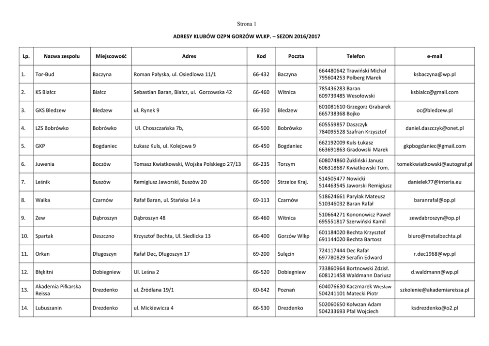 Strona 1 ADRESY KLUBÓW OZPN GORZÓW WLKP. – SEZON