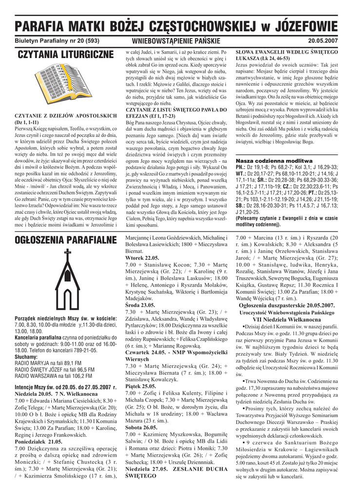 PARAFIA MATKI BOŻEJ CZÊSTOCHOWSKIEJ w JÓZEFOWIE Biuletyn Parafialny nr 20 (593) CZYTANIA LITURGICZNE CZYTANIE Z DZIEJÓW APOSTOLSKICH (Dz 1, 1-11) Pierwszą Księgę napisałem, Teofilu, o wszystkim, co Jezus czynił i czego nauczał od początku aż do dnia, w którym udzielił przez Ducha Świętego poleceń Apostołom, których sobie wybrał, a potem został wzięty do nieba. Im też po swojej męce dał wiele dowodów, że żyje: ukazywał się im przez czterdzieści dni i mówił o królestwie Bożym. A podczas wspólnego posiłku kazał im nie odchodzić z Jerozolimy, ale oczekiwać obietnicy Ojca: Słyszeliście o niej ode Mnie - /mówił/ - Jan chrzcił wodą, ale wy wkrótce zostaniecie ochrzczeni Duchem Świętym. Zapytywali Go zebrani: Panie, czy w tym czasie przywrócisz królestwo Izraela? Odpowiedział im: Nie wasza to rzecz znać czasy i chwile, które Ojciec ustalił swoją władzą, ale gdy Duch Święty zstąpi na was, otrzymacie Jego moc i będziecie moimi świadkami w Jerozolimie i OG£OSZENIA PARAFIALNE Porz¹dek niedzielnych Mszy œw. w koœciele: 7.00, 8.30, 10.00-dla m³odzie¿y,11.30-dla dzieci, 13.00, 18.00. Kancelaria parafialna czynna od poniedzia³ku do soboty w godzinach: 9.00-11.00 oraz od 16.0018.00. Telefon do kancelarii 789-21-05. S³uchamy: RADIO MARYJA na fali 89,1 FM RADIO ŒWIÊTY JÓZEF na fali 96,5 FM RADIO WARSZAWA na fali 106,2 FM Intencje Mszy œw. od 20.05. do 27.05.2007 r. Niedziela 20.05. 7 N. Wielkanocna 7.00 + Edwarda i Mariana Ciesielskich; 8.30 + Zofię Telega; / + Martę Mierzejewską (Gr. 20); 10.00 O b ł. Boże i opiekę MB dla Rodziny Krajewskich i Szymańskich; 11.30 I Komunia Święta; 13.00 Za Parafian; 18.00 + Karolinę, Reginę i Jerzego Frankowskich. Poniedziałek 21.05. 7.00 Dziękczynna za szczęśliwą operację z prośbą o dalszą opiekę nad zdrowiem Moniczki; / + Stefanię Chustecką (3 r. śm.); 7.30 + Martę Mierzejewską (Gr. 21); / + Kazimierza Smolińskiego (17 r. śm.), WNIEBOWSTĄPIENIE PAŃSKIE 20.05.2007 w całej Judei, i w Samarii, i aż po krańce ziemi. Po tych słowach uniósł się w ich obecności w górę i obłok zabrał Go im sprzed oczu. Kiedy uporczywie wpatrywali się w Niego, jak wstępował do nieba, przystąpili do nich dwaj mężowie w białych szatach. I rzekli: Mężowie z Galilei, dlaczego stoicie i wpatrujecie się w niebo? Ten Jezus, wzięty od was do nieba, przyjdzie tak samo, jak widzieliście Go wstępującego do nieba. CZYTANIE Z LISTU ŚWIĘTEGO PAWŁA DO EFEZJAN (Ef 1, 17-23) Bóg Pana naszego Jezusa Chrystusa, Ojciec chwały, dał wam ducha mądrości i objawienia w głębszym poznaniu Jego samego. [Niech da] wam światłe oczy serca tak, byście wiedzieli, czym jest nadzieja waszego powołania, czym bogactwo chwały Jego dziedzictwa wśród świętych i czym przemożny ogrom Jego mocy względem nas wierzących - na podstawie działania Jego potęgi i siły. Wykazał On je, gdy wskrzesił Go z martwych i posadził po swojej prawicy na wyżynach niebieskich, ponad wszelką Zwierzchnością i Władzą, i Mocą, i Panowaniem, i ponad wszelkim innym imieniem wzywanym nie tylko w tym wieku, ale i w przyszłym. I wszystko poddał pod Jego stopy, a Jego samego ustanowił nade wszystko Głową dla Kościoła, który jest Jego Ciałem, Pełnią Tego, który napełnia wszystko wszelkimi sposobami. SŁOWA EWANGELII WEDŁUG ŚWIĘTEGO ŁUKASZA (Łk 24, 46-53) Jezus powiedział do swoich uczniów: Tak jest napisane: Mesjasz będzie cierpiał i trzeciego dnia zmartwychwstanie, w imię Jego głoszone będzie nawrócenie i odpuszczenie grzechów wszystkim narodom, począwszy od Jerozolimy. Wy jesteście świadkami tego. Oto Ja ześlę na was obietnicę mojego Ojca. Wy zaś pozostańcie w mieście, aż będziecie uzbrojeni mocą z wysoka. Potem wyprowadził ich ku Betanii i podniósłszy ręce błogosławił ich. A kiedy ich błogosławił, rozstał się z nimi i został uniesiony do nieba. Oni zaś oddali Mu pokłon i z wielką radością wrócili do Jerozolimy, gdzie stale przebywali w świątyni, wielbiąc i błogosławiąc Boga. Marcjannę i Leona Goździewskich, Michalinę i Bolesława Łasiewickich; 1800 + Mieczysława Biernat. Wtorek 22.05. 7.00 + Stanisławę Kocon; 7.30 + Martę Mierzejewską (Gr. 22); / + Karolinę (9 r. śm.), Janinę i Boleslawa Laskusów; 18.00 + Helenę, Antoniego i Ryszarda Molaków, Krystynę Suchańską, Wiktorię i Bartłomieja Madejaków. Środa 23.05. 7.30 + Martę Mierzejewską (Gr. 23); / + Zdzisława, Aleksandra, Wandę i Władysławę Pytlarczyków; 18.00 Dziękczynna za wszelkie łaski i o zdrowie i bł. Boże dla Iwony i całej rodziny Rupniewskich; + Feliksa Czaplińskiego (6 r. śm.); + Mariannę Rogowską. Czwartek 24.05. - NMP Wspomożycielki Wiernych 7.30 + Martę Mierzejewską (Gr. 24); + Mieczysława Biernata (7 r. śm.); 18.00 + Stanisławę Kowalczyk. Piątek 25.05. 7.00 + Zofię i Feliksa Kulenty, Filipine i Michała Czopek; 7.30 + Martę Mierzejewską (Gr. 25); O bł. Boże, w dorosłym życiu, dla Michała w 18 urodziny; 18.00 + Wacława Mazura (23 r. śm.). Sobota 26.05. 7.00 + Kazimierę Myszkowska, Bogumiłę Salwin; / O bł. Boże i opiekę MB dla Lidii i Romana oraz dzieci: Piotra i Moniki; 7.30 + Martę Mierzejewską (Gr. 26); / + Zofię Suchecką; 18.00 + Urszulę Dziennniak. Niedziela 27.05. ZESŁANIE DUCHA ŚWIĘTEGO 7.00 + Marcina (13 r. śm.) i Ryszarda (20 r. śm.) Kowalskich; 8.30 + Aleksandra (5 r. śm.) i Janinę Orzełowskich, Stanisława Jaroń; / + Martę Mierzejewską (Gr. 27); 10.00 + Stanisłąwę, ludwika, Henryka, Rozalię, Stanisława Witanów, Józefę i Jana Truszewskich, Sewerynę Bogucką, Eugeniusza Książka, Gustawę Repsz; 11.30 Rocznica I Komunii Świętej; 13.00 Za Parafian; 18.00 + Wandę Wójcicką (7 r. śm.). Nasza codzienna modlitwa PN.: Dz 19,1-8; Ps 68,2-7; Kol 3,1; J 16,29-33; WT.: Dz 20,17-27; Ps 68,10-11.20-21; J 14,16; J 17,1-11a; ŚR.: Dz 20,28-38; Ps 68,29-30.33-36; J 17,21; J 17,11b-19; CZ.: Dz 22