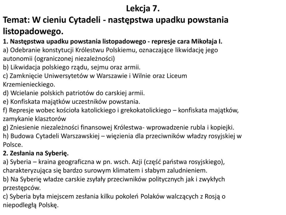 Lekcja 7. Temat: W cieniu Cytadeli - następstwa upadku powstania listopadowego. 1. Następstwa upadku powstania listopadowego - represje cara Mikołaja I. a) Odebranie konstytucji Królestwu Polskiemu, oznaczające likwidację jego autonomii (ograniczonej niezależności) b) Likwidacja polskiego rządu, sejmu oraz armii. c) Zamknięcie Uniwersytetów w Warszawie i Wilnie oraz Liceum Krzemienieckiego. d) Wcielanie polskich patriotów do carskiej armii. e) Konfiskata majątków uczestników powstania. f) Represje wobec kościoła katolickiego i grekokatolickiego – konfiskata majątków, zamykanie klasztorów g) Zniesienie niezależności finansowej Królestwa- wprowadzenie rubla i kopiejki. h) Budowa Cytadeli Warszawskiej – więzienia dla przeciwników władzy rosyjskiej w Polsce. 2. Zesłania na Syberię. a) Syberia – kraina geograficzna w pn. wsch. Azji (część państwa rosyjskiego), charakteryzująca się bardzo surowym klimatem i słabym zaludnieniem. b) Na Syberię władze carskie zsyłały przeciwników politycznych jak i zwykłych przestępców. c) Syberia była miejscem zesłania kilku pokoleń Polaków walczących z Rosją o niepodległą Polskę. d) Rodzaje zesłań: • Katorga – skazanie na przymusową pracę w kopalniach i obozach pracy. • Zesłanie – dożywotni lub czasowy nakaz osiedlenia się w wyznaczonych przez władze rosyjskie miejscach Syberii.