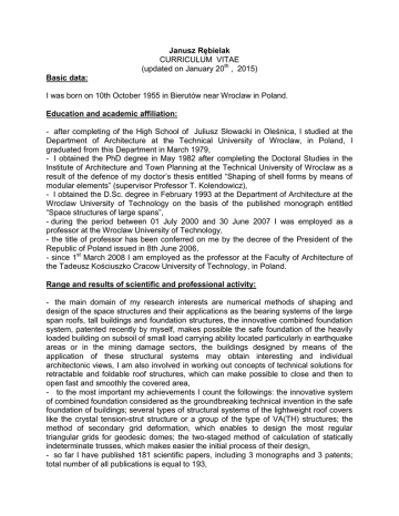 Janusz Rębielak CURRICULUM VITAE (updated on January 20th , 2015) Basic data: I was born on 10th October 1955 in Bierutów near Wroclaw in Poland. Education and academic affiliation: - after completing of the High School of Juliusz Słowacki in Oleśnica, I studied at the Department of Architecture at the Technical University of Wroclaw, in Poland, I graduated from this Department in March 1979, - I obtained the PhD degree in May 1982 after completing the Doctoral Studies in the Institute of Architecture and Town Planning at the Technical University of Wroclaw as a result of the defence of my doctor’s thesis entitled “Shaping of shell forms by means of modular elements” (supervisor Professor T. Kolendowicz), - I obtained the D.Sc. degree in February 1993 at the Department of Architecture at the Wroclaw University of Technology on the basis of the published monograph entitled “Space structures of large spans”, - during the period between 01 July 2000 and 30 June 2007 I was employed as a professor at the Wroclaw University of Technology, - the title of professor has been conferred on me by the decree of the President of the Republic of Poland issued in 8th June 2006, - since 1st March 2008 I am employed as the professor at the Faculty of Architecture of the Tadeusz Kościuszko Cracow University of Technology, in Poland. Range and results of scientific and professional activity: - the main domain of my research interests are numerical methods of shaping and design of the space structures and their applications as the bearing systems of the large span roofs, tall buildings and foundation structures, the innovative combined foundation system, patented recently by myself, makes possible the safe foundation of the heavily loaded building on subsoil of small load carrying ability located particularly in earthquake areas or in the mining damage sectors, the buildings designed by means of the application of these structural systems may obtain interesting and individual architectonic views, I am also involved in working out concepts of technical solutions for retractable and foldable roof structures, which can make possible to close and then to open fast and smoothly the covered area, - to the most important my achievements I count the followings: the innovative system of combined foundation considered as the groundbreaking technical invention in the safe foundation of buildings; several types of structural systems of the lightweight roof covers like the crystal tension-strut structure or a group of the type of VA(TH) structures; the method of secondary grid deformation, which enables to design the most regular triangular grids for geodesic domes; the two-staged method of calculation of statically indeterminate trusses, which makes easier the initial process of their design, - so far I have published 181 scientific papers, including 3 monographs and 3 patents; total number of all publications is equal to 193, - I have given lectures during national and international scientific conferences held in Poland, Great Britain (1993, 1997, 2002, 2011, 2014), USA (1995, 2006, 2011), China (1996, 2006, 2010), Denmark (1998), Israel (1998, 2011), Spain (2000, 2003, 2014), the Netherlands (2000), Australia (2001), Japan (2001, 2014), Belgium (2002), Taiwan (2003, 2011), Argentina (2004, 2010), France (2004) Hungary (2004), Austria (2005), Germany (2006), Iran (2007, 2009, 2011), Ukraine (2008), Egypt (2012), South Korea (2012), Greece (2013), Singapore (2013) and in Italy (2014). Activities in professional and scientific societies: - I am a chairman of the Commission of Architecture and Town Planning of the Polish Academy of Sciences (PAN), Wroclaw Branch, since 1st October 2006, in Spring 2011 I have been re-elected as the Chairman of the Commission for the tenure 2011-2014, - I am member of the Chapter for the Award of the Wroclaw Branch of Polish Academy of Sciences „Iuvenes Wratislaviae”, - I was a member of Section of Architecture of the Committee for Architecture and Town Planning of the Polish Academy of Science (PAN), term 2003-2006, - a member of Committee for European Cultures of the Wroclaw Branch of Polish Academy of Sciences, - I was a V-ce Chairman of the Inter-University Association for Teaching of Building Technology in Architectural Education in Poland, - I co-operate with the Space Structures Research Centre established by Prof. Zygmunt Stanisław Makowski in the middle of 60s at the University of Surrey in Great Britain, - a member of Scientific Committee of the International School of Computer Aided Design, Manufacture and Operating organized annually by the Military University of Technology in Warsaw, - a member of the Advisory Board of the International Society for Interdisciplinary Study of Symmetry (ISIS-SYMMETRY), - a member of the International Association of Mathematics and Design, - a member of editorial committee of Jornadas Internacionales de Mathematics & Design, issued in Buenos Aires, Argentina, - a member of the editorial committee for the Journal of Mathematics and System Science, issued in USA, - a member of the Research Board of Advisors of the American Biographical Institute (ABI), Raleigh, North Carolina, USA, - I was a member of group of referees of International Journal of Solids and Structures, Stanford University, California, USA, - I organized the invited scientific session “Design Methods of Spatial Structures in Architecture and Civil Engineering” during The 10th World Multi-Conference on Systemics, Cybernetics and Informatics in July 2006, in Orlando, Florida, USA, - I organized the Minisymposium “Methods of approximate static analyses of complex structural systems” during the 11th. World Congress on Computational Mechanics (WCCM2014), 5th. European Conference on Computational Mechanics (ECCM V) and 6th. European Conference on Computational Fluid Dynamics (ECFD VI), July 20 - 25, 2014, Barcelona, Spain, - I am organizer of the international s