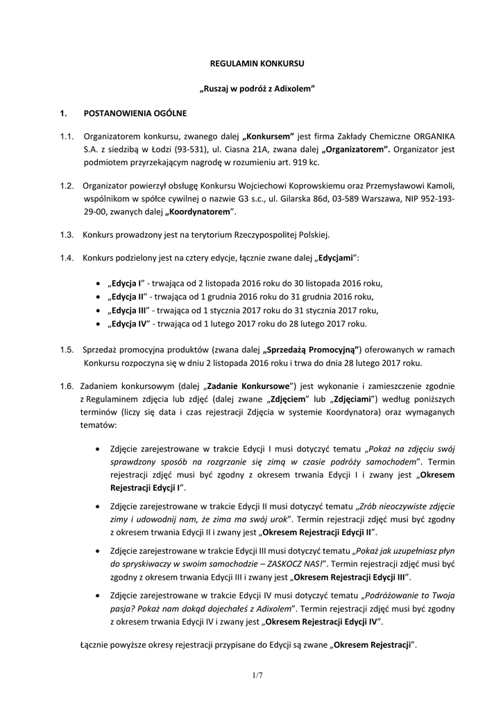 REGULAMIN KONKURSU „Ruszaj w podróż z Adixolem” 1. POSTANOWIENIA OGÓLNE 1.1. Organizatorem konkursu, zwanego dalej „Konkursem” jest firma Zakłady Chemiczne ORGANIKA S.A. z siedzibą w Łodzi (93-531), ul. Ciasna 21A, zwana dalej „Organizatorem”. Organizator jest podmiotem przyrzekającym nagrodę w rozumieniu art. 919 kc. 1.2. Organizator powierzył obsługę Konkursu Wojciechowi Koprowskiemu oraz Przemysławowi Kamoli, wspólnikom w spółce cywilnej o nazwie G3 s.c., ul. Gilarska 86d, 03-589 Warszawa, NIP 952-19329-00, zwanych dalej „Koordynatorem”. 1.3. Konkurs prowadzony jest na terytorium Rzeczypospolitej Polskiej. 1.4. Konkurs podzielony jest na cztery edycje, łącznie zwane dalej „Edycjami”: 1.5. „Edycja I” - trwająca od 2 listopada 2016 roku do 30 listopada 2016 roku, „Edycja II” - trwająca od 1 grudnia 2016 roku do 31 grudnia 2016 roku, „Edycja III” - trwająca od 1 stycznia 2017 roku do 31 stycznia 2017 roku, „Edycja IV” - trwająca od 1 lutego 2017 roku do 28 lutego 2017 roku. Sprzedaż promocyjna produktów (zwana dalej „Sprzedażą Promocyjną”) oferowanych w ramach Konkursu rozpoczyna się w dniu 2 listopada 2016 roku i trwa do dnia 28 lutego 2017 roku. 1.6. Zadaniem konkursowym (dalej „Zadanie Konkursowe”) jest wykonanie i zamieszczenie zgodnie z Regulaminem zdjęcia lub zdjęć (dalej zwane „Zdjęciem” lub „Zdjęciami”) według poniższych terminów (liczy się data i czas rejestracji Zdjęcia w systemie Koordynatora) oraz wymaganych tematów: Zdjęcie zarejestrowane w trakcie Edycji I musi dotyczyć tematu „Pokaż na zdjęciu swój sprawdzony sposób na rozgrzanie się zimą w czasie podróży samochodem”. Termin rejestracji zdjęć musi być zgodny z okresem trwania Edycji I i zwany jest „Okresem Rejestracji Edycji I”. Zdjęcie zarejestrowane w trakcie Edycji II musi dotyczyć tematu „Zrób nieoczywiste zdjęcie zimy i udowodnij nam, że zima ma swój urok”. Termin rejestracji zdjęć musi być zgodny z okresem trwania Edycji II i zwany jest „Okresem Rejestracji Edycji II”. Zdjęcie zarejestrowane w trakcie Edycji III musi dotyczyć tematu „Pokaż jak uzupełniasz płyn do spryskiwaczy w swoim samochodzie – ZASKOCZ NAS!”. Termin rejestracji zdjęć musi być zgodny z okresem trwania Edycji III i zwany jest „Okresem Rejestracji Edycji III”. Zdjęcie zarejestrowane w trakcie Edycji IV musi dotyczyć tematu „Podróżowanie to Twoja pasja? Pokaż nam dokąd dojechałeś z Adixolem”. Termin rejestracji zdjęć musi być zgodny z okresem trwania Edycji IV i zwany jest „Okresem Rejestracji Edycji IV”. Łącznie powyższe okresy rejestracji przypisane do Edycji są zwane „Okresem Rejestracji”. 1/7 1.7. Zdjęcia zarejestrowane w innych terminach niż Okres Rejestracji nie biorą udziału w Konkursie. Rejestrowane Zdjęcia muszą być w formacie „jpg”, „jpeg”, „gif” lub „png”. Maksymalny rozmiar pliku ze Zdjęciem to 5 MB. Każde nadesłane Zdjęcie podlega weryfikacji moderatora celem sprawdzenia jego zgodności z zapisami Regulaminu. Uczestnik ma możliwość usunięcia swoich Zdjęć ze strony konkursowej, z wyłączeniem Zdjęć już nagrodzonych. 1.8. Konkurs przeznaczony jest dla pełnoletnich osób fizycznych, zamieszkałych na terytorium Rzeczypospolitej Polskiej, dokonujących czynności zakupu Produktu w imieniu swoim lub osób/firm trzecich, które spełnią postanowienia i warunki niniejszego Regulaminu. Osoba biorąca udział w Konkursie, spełniająca wymagania i postanowienia Regulaminu zwana jest dalej „Uczestnikiem”. 1.9. Konkurs odbywa się za pośrednictwem strony internetowej www.konkurs.organika.com.pl, zwanej dalej „Stroną Konkursową”. 1.10. Informacja na temat Konkursu została zamieszczona na Stronie Konkursowej, na której Uczestnik może zapoznać się z treścią niniejszego Regulaminu. Na stronie tej Organizator opublikuje wyniki Konkursu. Zgłaszając swój udział w Konkursie zgodnie z niniejszym Regulaminem, Uczestnik w przypadku wygranej wyraża zgodę na: publikację swojego imienia i pierwszej litery nazwiska oraz miejscowości zamieszkania, publikację Zdjęcia na Stronie Konkursowej. 1.11. Nad prawidłowym przebiegiem Konkursu czuwa powołana przez Organizatora Komisja Konkursowa, zwana dalej „Komisją”. 1.12. Członkowie Komisji oraz pracownicy Koordynatora nie mogą być Uczestnikami Konkursu. 2. 2.1. PRODUKTY OBJĘTE KONKURSEM Konkursem objęte są następujące promocyjne produkty oferowane przez Organizatora: zimowy płyn do spryskiwaczy Adixol -21°C - pojemność 4 litry, zimowy płyn do spryskiwaczy Adixol -21°C PREMIUM - pojemność 4 litry. 2.2. Produkty wymienione w pkt. 2.1. Regulaminu zakupione w okresie trwania Sprzedaży Promocyjnej zwane są dalej „Produktem” lub „Produktami”. 3. 3.1. NAGRODY Określenie rodzaju i wartości nagród oferowanych w Konkursie, łącznie dalej zwanych „Nagrodami”: a. „Nagrody I stopnia” – 4 Nagrody, każda w postaci bonu wycieczkowego TravelPass Premium o wartości 7 000,00 zł brutto (słownie: siedem tysięcy złotych 00/100) wraz z nagrodą pieniężną o wartości 778,00 zł (słownie: siedemset siedemdziesiąt osiem złotych 00/100). 2/7 b. „Nagroda II stopnia” – 8 Nagród, każda w postaci kamery GoPro Hero 4 o wartości 1906,50 zł brutto (słownie: tysiąc dziewięćset sześć złotych 50/100) wraz z nagrodą pieniężną o wartości 212,00 zł (słownie: dwieście dwanaście złotych 00/100). c. „Nagroda III stopnia” – 100 Nagród, każda w postaci dwóch biletów do kina (wyłącznie w sieciach Multikino i Silver Screen) o wartości 50,00 zł brutto (wartość dwóch biletów, słownie: pięćdziesiąt złotych 00/100) wraz z nagrodą pieniężną o wartości 6,00 zł (słownie: sześć złotych 00/100). 3.2. Łączna wartość brutto Nagród wynosi: 53 660,00 zł (słownie: pięćdziesiąt trzy tysiące sześćset sześćdziesiąt z