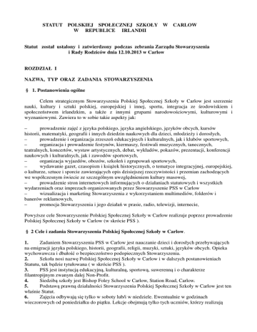 STATUT POLSKIEJ SPOŁECZNEJ SZKOŁY W CARLOW W REPUBLICE IRLANDII Statut został ustalony i zatwierdzony podczas zebrania Zarządu Stowarzyszenia i Rady Rodziców dnia 12.10.2013 w Carlow ROZDZIAŁ I NAZWA, TYP ORAZ ZADANIA STOWARZYSZENIA § 1. Postanowienia ogólne Celem strategicznym Stowarzyszenia Polskiej Społecznej Szkoły w Carlow jest szerzenie nauki, kultury i sztuki polskiej, europejskiej i innej, sportu, integracja ze środowiskiem i społeczeństwem irlandzkim, a także z innymi grupami narodowościowymi, kulturowymi i wyznaniowymi. Zawiera to w sobie takie aspekty jak: – prowadzenie zajęć z języka polskiego, języka angielskiego, języków obcych, kursów historii, matematyki, geografii i innych dziedzin naukowych dla dzieci, młodzieży i dorosłych, – prowadzenie i organizacja zrzeszeń edukacyjnych i kulturalnych, jak i klubów sportowych, – organizacja i prowadzenie festynów, kiermaszy, festiwali muzycznych, tanecznych, teatralnych, koncertów, wystaw artystycznych, debat, wykładów, pokazów, prezentacji, konferencji naukowych i kulturalnych, jak i zawodów sportowych, – organizacja wyjazdów, obozów, szkoleń i zgrupowań sportowych, – wydawanie gazet, czasopism i książek historycznych, o tematyce integracyjnej, europejskiej, o kulturze, sztuce i sporcie zawierających opis dzisiejszej rzeczywistości i przemian zachodzących we współczesnym świecie ze szczególnym uwzględnieniem kultury masowej, – prowadzenie stron internetowych informujących o działaniach statutowych i wszystkich wydarzeniach oraz imprezach organizowanych przez Stowarzyszenie PSS w Carlow – wizualizacja i marketing Stowarzyszenia z wykorzystaniem multimediów, folderów i banerów reklamowych, – promocja Stowarzyszenia i jego działań w prasie, radio, telewizji, internecie, Powyższe cele Stowarzyszenie Polskiej Społecznej Szkoły w Carlow realizuje poprzez prowadzenie Polskiej Społecznej Szkoły w Carlow (w skrócie PSS ). § 2 Cele i zadania Stowarzyszenia Polskiej Społecznej Szkoły w Carlow. 1. Zadaniem Stowarzyszenia PSS w Carlow jest nauczanie dzieci i dorosłych przebywających na emigracji języka polskiego, historii, geografii, religii, muzyki, sztuki, języków obcych. Opieka wychowawcza i dbałość o bezpieczeństwo podopiecznych Stowarzyszenia. 2. Szkoła nosi nazwę Polskiej Społecznej Szkoły w Carlow i w dalszych postanowieniach Statutu, tak będzie tytułowana ( w skrócie PSS ). 3. PSS jest instytucją edukacyjną, kulturalną, sportową, suwerenną i o charakterze filantropijnym zwanym dalej Non-Profit. 4. Siedzibą szkoły jest Bishop Foley School w Carlow, Station Road, Carlow. 5. Podstawą prawną działalności Stowarzyszenia Polskiej Społecznej Szkoły w Carlow jest ten właśnie Statut. 6. Zajęcia odbywają się tylko w soboty lub/i w niedziele. Ewentualnie w godzinach wieczorowych od poniedziałku do piątku. Lekcje obejmują tylko tych uczniów, którzy realizują obowiązek szkolny w szkołach irlandzkich. Rodzice uczniów muszą dostarczyć stosowne oświadczenia o wypełnianiu obowiązku szkolnego. 7. Program nauczania zostaje zatwierdzony przez Radę Pedagogiczną w porozumieniu z Zarządem i po zasięgnięciu opinii Rady Rodziców. ROZDZIAŁ II WŁADZE STOWARZYSZENIA § 3 Stowarzyszenie Polskiej Społecznej Szkoły w Carlow jest zwane dalej organem prowadzącym szkołę, w imieniu którego działa Zarząd Stowarzyszenia. § 4 Władzą Stowarzyszenia jest Zarząd Stowarzyszenia w osobach Przewodniczącego (Prezesa) Zarządu, Skarbnika Zarządu i Sekretarza Zarządu ( 3 osoby ). § 5 1. Członkami Stowarzyszenia są rodzice uczniów PSS w Carlow. 2. Członkowie i Zarząd działają Non-Profit. 3. Stowarzyszenie zatrudnia pracowników. 4. Utrata członkostwa w Stowarzyszeniu następuje przez: a) dobrowolne zrzeczenie się praw członkowskich przez poszczególnych członków b) wykluczenia przez Zarząd z powodu: - łamania Statutu i regulaminów obowiązujących w Stowarzyszeniu, - nieprzestrzeganie uchwał władz Stowarzyszenia - nieregulowania opłat czesnego za lekcje – maksymalna zaległość to 2 raty lub z innych uzasadnionych powodów np. śmierci członka. 5. Przed ostateczną decyzją o wykluczeniu przez Zarząd, członek ma prawo do wyjaśnienia sytuacji. Zarząd podejmuje decyzję w sprawie po konsultacji z pozostałymi organami Stowarzyszenia, Dyrektorem Szkoły i Przewodniczącym Rady. 6. Walne Zgromadzenie Zarządu i Członków Stowarzyszenia musi odbyć się przynajmniej 4 razy w roku. Sprawy omawiane na walnym zgromadzeniu członków to: kwartalne podsumowanie działalności Zarządu; sprawozdanie finansowe i inne istotne dla istnienia lub prowadzenia Szkoły sprawy; sprawozdanie Dyrektora Szkoły. 7. Do kompetencji Walnego Zgromadzenia Zarządu i Członków Stowarzyszenia należą: a) sprawy statutowe b) polityka personalna i finansowa Stowarzyszenia 8. Zarząd składa się z 3 osób. Zostaje wybrany na Walnym Zgromadzeniu Zarządu i Członków Stowarzyszenia na okres 2 lat. 9. Zarząd podejmuje decyzje zwykłą większością głosów w obecności 2/3 członków Zarządu. 10. Zarząd musi zbierać się przynajmniej 4 razy do roku na zebraniach walnych zwanych kwartalnymi. 11. Każdy członek Zarządu może utracić swoje miejsce w Zarządzie, jeśli nie będzie uczestniczył w 3 kolejnych spotkaniach Zarządu bez podania racjonalnej przyczyny nieobecności ( na piśmie lub e-mailem). 12. Uchwały Zarządu są jawne, dostępne dla wszystkich członków Stowarzyszenia, Rady Pedagogicznej i Rady Rodziców oraz Komisji Rewizyjnej. 13. Przy Stowarzyszeniu działa 3 osobowa Rada Rodziców jako organ doradczy i opiniotwórczy. Rada Rodziców ma prawo wglądu w historię i dokumentację prawną i finansową Stowarzyszenia PSS w Carlow. 14. Zarząd jest odpowiedzialny za: a) wspieranie pracy Dyrektora Szkoły; b) współpracę z Radą Rodziców i wszystkimi rodzicami, którzy płacą za lekcje dzieci; c) ustalenie zakresu ob