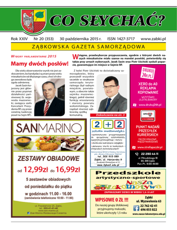Rok XXIV Nr 20 (353) 30 października 2015 r. ISSN 1427-3717 www.zabki.pl Z ą b k o w s k a G a z e ta S a m o rz ą d o wa W ybory parlamentarne 2015 Mamy dwóch posłów! Dla wielu obserwatorów wynik nie jest zaskoczeniem, bo kandydaci są znani przez wielu mieszkańców od dłuższego czasu, choć ich droga zawodowa była zgoła odmienna. Jacek Sasin kojarzony jest głównie przez pryzmat działalności państwowej (b. wojewoda mazowiecki, zastępca szefa Kancelarii Prezydenta RP, czy przez ostatnią kadencję poseł na Sejm RP). W stępne, przedwyborcze przypuszczenia, zgodnie z którymi dwóch naszych mieszkańców miało szanse na mandat poselski, potwierdziły się także przy urnach wyborczych. Jacek Sasin oraz Piotr Uściński zyskali poparcie, gwarantujące im miejsce w Sejmie RP. Z kolei Piotr Uściński to doświadczony samorządowiec, który przeszedł wszystkie szczeble w strukturze samorządu terytorialnego (był radnym miejskim, powiatowym, a obecnie także sejmiku mazowieckiego), pełnił również funkcję wicestarosty i starosty powiatu wołomińskiego. Zarządzał również ząbkowską spółką komunalną. Dokończenie na str. 3 »systematyczne przygotowywanie do sprawdzianu szóstoklasisty, egzaminu gimnazjalnego i matury »skuteczne nadrabianie zaległości »ułatwianie startu w konkursach i olimpiadach matematycznych Rekomendacja Ministra Edukacji Narodowej jako „Miejsce Odkrywania Talentów” tel. 502 915 089 Ząbki, ul. Harcerska 9 (budynek Gimnazjum nr 1) www.2plus2.edu.pl Przedszkole artystyczno-sportowe ZAPRASZAMY DZIECI W WIEKU 1,5–5 LAT Codzienne zajęcia edukacyjne, ruchowe i plastyczne Przestronne sale, każda przystosowana do poszczególnych zajęć Dwa duże place zabaw w sąsiedztwie lasu Do naszej grupy żłobkowej Szeroka oferta zajęć dodatkowych w ramach czesnego przyjmujemy maluszki, (m.in.: artoteka, karate, zumba, zajęcia sportowe, fitness, językukończyły angielski 3 razy w 1,5 tygodniu które roku www.nasza-lokomotywa.edu.pl Własna kuchnia WPISOWE 0 ZŁ !!! Ząbki ul. Wyzwolenia 63 22 762 42 41 696 055 822 CO SŁYCHAĆ ZAPOWIEDZI www.zabki.pl Zmiana organizacji ruchu drogowego w okolicach cmentarza przy ul. Piłsudskiego W związku z nadchodzącym dniem Wszystkich Świętych od 30 października do 2 listopada 2015r. w rejonie cmentarza przy ul. Piłsudskiego zostanie wdrożona czasowa organizacja ruchu drogowego. Ulicą Andersena między ul. Piłsudskiego a ul. Ułańską będzie odbywał się ruch jednokierunkowy w kierunku do ul. Ułańskiej. Na fragmencie ul. Andersena pomiędzy ul. Ułańską, a ul. Reymonta samochody będą mogły jechać w obu kierunkach. Ul. Obrońców, Jesienna i fragment ul. gen. J. Rómmla pomiędzy ul. Obrońców i ul. Jesienną będą jednokierunkowe. Ulicą Obrońców będzie można dojechać w rejon cmentarza od strony ul. Szwoleżerów. Jadąc ul. Szwoleżerów nie będzie można skręcić w ul. Jesienną. Prosimy o zachowanie ostrożności i zwracanie uwagi na nowe oznakowanie. Informujemy, że w dniu 1 listopada ‐ dzień Wszystkich Świętych przejazd linią „Ząbki‐1” jest BEZPŁATNY dla każdego. W tym dniu nie potrzeba okazywać karty mieszkańca lub kupować biletu jednorazowego. Podstawa prawna – uchwała Nr XI/105/2015 Rady Miasta Ząbki z dnia z dnia 28 lipca 2015 r. Urząd Miasta Ząbki Zaproszenie na niezwykły turniej na basenie J uż 22 listopada na mieszkańców Ząbek i okolic czeka nie lada atrakcja, bowiem na ząbkowskim basenie z inicjatywy Urzędu Miasta Ząbki, Miejskiego Ośrodka Sportu i Rekreacji i Towarzystwa Przyjaciół Ząbek odbędzie się Puchar... smoczych łodzi. Smocze łodzie, które swoją nazwę biorą od smoczych ornamentów na rufie i dziobie to drużynowy sport wywodzący się aż z Chin. Do Ząbek przywędruje jednak za pomocą Stowarzyszenia Spójnia Smocze Łodzie i oprócz zapewnienia niesamowitych wrażeń umożliwi zawalczenie o Puchar. Reprezentanci z ząbkowskich szkół podstawowych i gimnazjów staną w szrankach na smoczych łodziach, a uczestnicy zagadkowej kategorii „Fun” zapewnią nienaganne widowisko. To wszystko 22 listopada na basenie miejskim przy ulicy Słowackiego 21. Liczymy na Państwa obecność i doping, bo emocji i sportowej rywalizacji na pewno nie zabraknie. Więcej informacji na temat smoczych łodzi, a także samego wydarzenia znajdą Państwo na fanpage’u Towarzystwa Przyjaciół Ząbek na Facebooku. Serdecznie zapraszamy! Mariola Lekszycka – Towarzystwo Przyjaciół Ząbek CO SŁYCHAĆ? Wydawca: Urząd Miasta w Ząbkach Redaktor naczelny: Mirosław Oleksiak e-mail: [email protected], tel. 694 759 987 Redakcja: ul. Wojska Polskiego 10, Ząbki, tel. 22 5109 793 Druk: Drukarnia Rajgraf, ul. Mazowiecka 50B, 05-120 Legionowo, tel. 22 784 86 58 Redakcja nie odpowiada za treść ogłoszeń i reklam. Nakład 6000 egz. 2 DYŻURY REDAKCYJNE: red. Mirosław Oleksiak Urząd Miasta pok. nr 28 poniedziałki godz. 16.00–18.00 piątki godz. 8.00–10.00 IA Społeczeństwo www.zabki.pl Dokończenie ze str. 1 PiS – 6 129 (41,95%) PO – 3 287 (22,5%) Nowoczesna Ryszarda Petru – 1454 (9,95%) Kukiz’15 – 1177 (8,06%) KORWIN – 818 (5,6%) Zjednoczona Lewica – 748 (5,12%) Razem – 593 (4,06%) PSL – 270 (1,85%) KWW Zbigniewa Stonogi – 133 (0,91%) Nowi posłowie elekci startując z listy KW Prawo i Sprawiedliwość, w okręgu składającym się z powiatów podwarszawskich zyskali odpowiednio: Jacek Sasin – 43 250 głosów oraz Piotr Uściński – 6 679 głosów. Warto podkreślić, że Jacek Sasin zdobył 3 wynik w całym okręgu, zaraz po Małgorzacie Kidawie-Błońskiej oraz Mariuszu Błaszczaku. Jak głosowali ząbkowianie? W Ząbkach zdecydowanie wygrało Prawo i Sprawiedliwość, zyskując prawie 42% ważnie oddanych głosów. Na drugim miejscu znalazła się Platforma Obywatelska (22,5%), a na trzecim Nowoczesna Ryszarda Petru (9,95%). Co ciekawe, prawie połowa spośród wszystkich głosujących w Ząbkach odda