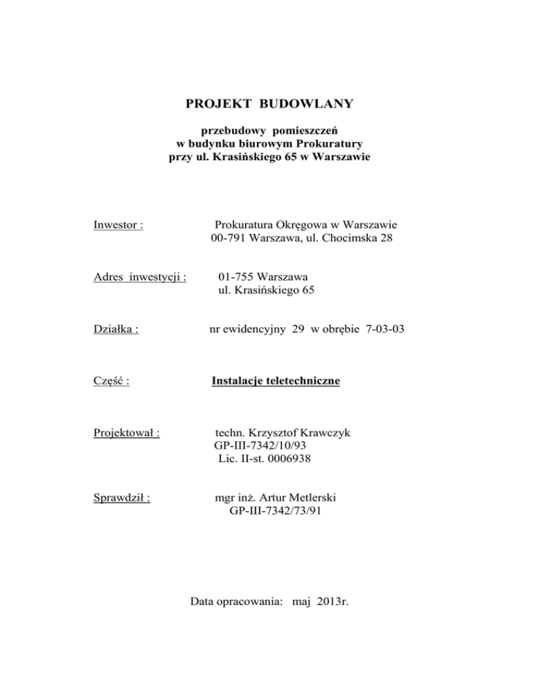 PROJEKT BUDOWLANY przebudowy pomieszczeń w budynku biurowym Prokuratury przy ul. Krasińskiego 65 w Warszawie Inwestor : Adres inwestycji : Prokuratura Okręgowa w Warszawie 00-791 Warszawa, ul. Chocimska 28 01-755 Warszawa ul. Krasińskiego 65 Działka : nr ewidencyjny 29 w obrębie 7-03-03 Część : Instalacje teletechniczne Projektował : techn. Krzysztof Krawczyk GP-III-7342/10/93 Lic. II-st. 0006938 Sprawdził : mgr inż. Artur Metlerski GP-III-7342/73/91 Data opracowania: maj 2013r. OŚWIADCZENIE Zgodnie z art.20 ust.4 - Prawa Budowlanego (Dz. U. 207/2003 poz. 2016 z późniejszymi zmianami) oświadczamy jako projektant / sprawdzający , że projekt budowlany obiektu: Przebudowa instalacji teletechnicznych w wydzielonych pomieszczeniach w budynku biurowym Prokuratury w Warszawie, ul. Krasińskiego 65, dz. nr ewid. 29, obręb 7-03-03 dla Inwestora: Prokuratura Okręgowa w Warszawie 00-791 Warszawa ul. Chocimska 28 sporządzono zgodnie z obowiązującymi przepisami oraz zasadami wiedzy technicznej. PROJEKTANT: techn. elektr. Krzysztof Krawczyk upr. bud. nr GP-7342/10/93 SPRAWDZAJĄCY: mgr inż. Artur Metlerski upr. bud. nr GP-7342/73/91 2 I. Opis techniczny. 1. Przedmiot opracowania 2. Podstawa opracowania. 3. Zakres projektu. 4. Przeniesienie istn. detektora tlenku węgla w garażu. 5. Zmiany w systemie sygnalizacji pożarowej SAP. 5.1. Opis istn. systemu sygnalizacji pożarowej SAP. 5.2. Opis projektowanych zmian w instalacji sygnalizacji pożarowej SAP. 5.3. Projektowane okablowanie instalacji SAP. 6. Zmiany w instalacji okablowania poziomego sieci strukturalnej (komputerowej i telefonicznej). 6.1. Opis istn. instalacji okablowania strukturalnego. 6.2. Opis proj. zmian w instalacji okablowania strukturalnego. 6.3. Projektowane okablowanie poziome. 7. Rozbudowa systemu telewizji użytkowej CCTV. 7.1. Proj. stanowisko nadzoru. 7.2. Proj. kamery wewnętrzne. 7.3. Proj. kamera zewnętrzna. 7.4. Proj. okablowanie do kamer. 7.5. Proj. zasilanie kamer. 8. Rozbudowa instalacji sygnalizacji włamania i napadu SSWN. 8.1. Opis istn. systemu sygnalizacji włamania i napadu. 8.2. Zmiany w istn. instalacji SSWN. 8.3. Okablowanie istn. instalacji SSWN. 8.4. Zasilanie proj. podcentrali PP. 9. Rozbudowa systemu kontroli dostępu KD. 9.1. Opis istn. systemu kontroli dostępu KD. 9.2. Proj. rozbudowa systemu kontroli dostępu KD. 9.3. Instalacja - okablowanie. 9.4. Zasilanie urządzeń. 10. Uwagi dodatkowe do montażu instalacji. V. Rysunki. 1T. Instalacje teletechniczne - rzut parteru po remoncie. 2T. Instalacje teletechniczne - rzut I-piętra po remoncie. 3T. Instalacje teletechniczne - rzut II-piętra po remoncie. 3 I. Opis techniczny 1. Przedmiot opracowania Przedmiotem opracowania jest Projekt Budowlany zmian w instalacjach: detekcji tlenku węgla, sygnalizacji pożarowej SAP, okablowania strukturalnego instalacji komputerowej i telefonicznej, telewizji użytkowej CCTV, sygnalizacji włamania i napadu SSWN oraz kontroli dostępu KD w remontowanym budynku biurowym Prokuratury w Warszawie przy ul. Krasińskiego 65. 2. Podstawa opracowania. • Uzgodnienia z Inwestorem. • Wizja lokalna i oględziny instalacji. • Rzuty architektoniczne w skali 1:100. • Obowiązujące przepisy i normy. 3. Zakres projektu. Projekt obejmuje wykonanie w budynku zmian (przebudowy / rozbudowy) następujących instalacji teletechnicznych: - detekcji tlenku węgla, - sygnalizacji pożarowej SAP, - okablowania strukturalnego instalacji komputerowej i telefonicznej, - telewizji użytkowej CCTV, - sygnalizacji włamania SSWN, - kontroli dostępu KD, 4. Przeniesienie istn. detektora tlenku węgla w garażu. W garażu jest istn. detektor tlenku węgla typu WG-22GB "Gazex", który po wymurowaniu ściany znajdzie się w proj. Magazynie i dlatego ma być przeniesiony do garażu. Detektor WG-22GB przenieść do nowej lokalizacji w garażu i zainstalować na ścianie na wys. 2,0 m oraz doprowadzić okablowanie w listwie LN 40x16.1 na tynku: - YDY 3x1,5 mm2 - zasilanie, - YDY 2x1,5 mm2 - ster. wentylacją, - YDY 2x1,5 mm2 - sygn. optyczna, które należy przyłączyć w miejscu poprzedniej lokalizacji detektora przy pomocy odgałęźników n/t 4x2,5 mm2, IP56 – patrz rzut parteru, rys. 1T. 4 5. Zmiany w systemie sygnalizacji pożarowej SAP. 5.1. Opis istn. systemu sygnalizacji pożarowej SAP. W budynku istnieje system sygnalizacji pożarowej obejmujący cały budynek, który złożony jest z następujących elementów: • centrala sygnalizacji pożarowej FCC-330A mikroprocesorowa, 4-pętlowa, umieszczona w pom. Ochrony na parterze, • 2 pętlowe linie dozorowe, - linia nr 1 obejmująca podziemie i parter, w której zainstalowano 31 elementów, - linia nr 2 obejmująca I-piętro, II-piętro i III-piętro, w której zainstalowano 121 elementów, • optyczne uniwersalne czujki dymu OP 320A z gniazdem SO 320 i izolatorem zwarcia, • czujki nadmiarowo-różniczkowe temperatury HI 320A z gniazdem SO 320 i izolatorem zwarcia, • ręczne ostrzegacze pożarowe MT 320A z puszką wtynkową DBZ 1192 i izolatorem zwarcia, • moduły sterujące ABI, • sygnalizatory wewnętrzne i zewnętrzne. 5.2. Opis projektowanych zmian w instalacji sygnalizacji pożarowej SAP. W związku z wydzieleniem Biura podawczego z Holu i pomieszczenia Magazynowego z garażu oraz wyburzeniem istn. ścian działowych i podziału istn. pomieszczeń biurowych należy: • zdemontować i przesunąć istn. ręczny ostrzegacz pożarowy L1/3 w garażu na parterze, • zdemontować i przesunąć w nowej lokalizacji istn. optyczne czujki dymu: - L2/27 w pom. 112 na I-piętrze, - L2/38 w pom. 103 na I-piętrze, - L2/67 w pom. 213 na II-piętrze, • zainstalować nowe optyczne czujki dymu OP 320A z gniazdem SO 320 adapterem SOA 322 i izolatorem zwarcia, w pom.: - L1/2a w Holu na parterze, - L1/2b w Magazynie na parterze, - L1/2c w Magazynie na parterze, 5 - L2/10b w Pokoju okazań nr 123 na I-piętrze, - L2/22a w pom. nr 117 na I-piętrze, - L2/27a w pom. nr 113 n