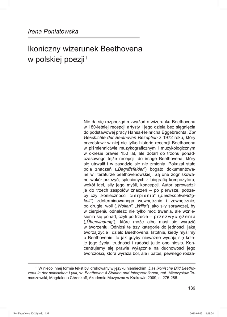 Irena Poniatowska Ikoniczny wizerunek Beethovena w polskiej poezji1 Nie da się rozpocząć rozważań o wizerunku Beethovena w 180-letniej recepcji artysty i jego dzieła bez sięgnięcia do podstawowej pracy Hansa-Heinricha Eggebrechta, Zur Geschichte der Beethoven Rezeption z 1972 roku, który przedstawił w niej nie tylko historię recepcji Beethovena w piśmiennictwie muzykograficznym i muzykologicznym w okresie prawie 150 lat, ale dotarł do trzonu ponadczasowego tejże recepcji, do image Beethovena, który się utrwalił i w zasadzie się nie zmienia. Pokazał stałe pola znaczeń („Begriffsfelder”) bogato dokumentowane w literaturze beethovenowskiej. Są one zogniskowane wokół przeżyć, splecionych z biografią kompozytora, wokół idei, siły jego myśli, koncepcji. Autor sprowadził je do trzech zespołów znaczeń – po pierwsze, potrzeby czy „konieczności c i e r p i e n i a” („Leidesnotwendigkeit”) zdeterminowanego wewnętrznie i zewnętrznie, po drugie, woli („Wollen”, „Wille”) jako siły sprawczej, by w cierpieniu odnaleźć nie tylko moc trwania, ale wzniesienia się ponad, czyli po trzecie – p r z e z w y c i ę ż e n i a („Überwindung”), które może albo musi się wyrazić w tworzeniu. Odniósł te trzy kategorie do jedności, jaką tworzą życie i dzieło Beethovena. Istotnie, kiedy myślimy o Beethovenie, to jak gdyby nieważne wydają się koleje jego życia, trudności i radości jakie ono niosło. Koncentrujemy się prawie wyłącznie na duchowości jego twórczości, która wyraża ból, ale i patos, pewnego rodza1 W nieco innej formie tekst był drukowany w języku niemieckim: Das ikonische Bild Beethovens in der polnischen Lyrik, w: Beethoven 4.Studien und Interpretationen, red. Mieczysław Tomaszewski, Magdalena Chrenkoff, Akademia Muzyczna w Krakowie 2009, s. 275-286. 139 Res Facta Nova 12(21).indd 139 2011-09-13 11:18:24 ju wyższość przeżywanej przez niego egzystencji. Eggebrecht upodobnił konstrukcję swojego wywodu do formy sonatowej, której Beethoven nadał wyjątkową wymowę dramatyczną, a więc do ekspozycji podstawowych tematów, przede wszystkim „konieczności cierpienia”, przetworzenia ich w piśmiennictwie, do repryzy koncentrujacej się na „przezwyciężeniu” i do kody, którą stanowią pytania o próby wyjścia z zaklętego kręgu zastanych kategorii – czy można się bez nich obejść? Pamiętamy, że pierwsze próby wyzwolenia się z ciążącego obrazu Beethovena – tytana datują się na okres neoklasycyzmu. Ferruccio Busoni w artykule Was gab uns Beethoven? opublikowanym w 1922 roku2 chciał oczyścić werbalną recepcję Beethovena „od symbolu dzieła muzycznej ludzkości”, od przerostu znaczeń i ujmować go od strony estetycznej, czysto dźwiękowej i ludzkiej. Busoni nie sprowokował szerszej dyskusji, ale obudził proces redukowania hermeneutyki i sprowadzenia analizy dzieła Beethovena do tzw. warsztatu kompozytorskiego („Handwerk”), co odpowiadało tendencjom neoklasycystycznym. Na stulecie śmierci Beethovena przeprowadzono sondaż wśród młodych kompozytorów, pytając, co on dla nich znaczy. Opublikowane wyniki3 ujawniły krytyczne sądy o „hymniczno-filozofującym kulcie” Beethovena, o „fałszywej wykładni” jego sztuki i o legendzie jego życia. Jego koncepcje nie były już dla kompozytorów żywotne, natomiast w recepcji społecznej, w życiu muzycznym zadawano kłam deklaracjom młodych twórców. Rozpoczął się bowiem okres niesłychanego zainteresowania dyrygentów, wykonawców dziełem Beethovena, a w muzykologii ustanawiania i potwierdzania stałych kategorii recepcji Beethovena, tak jakby istniał jeden tylko język rozumienia jego muzyki. W tymże roku pojawiła się książka Arnolda Schmitza Das romantische Beethovenbild, w której Beethoven oczyszczony był z charakterystyk takich, jak „genialne dziecko natury”, „czarodziej” („Zauberer”), „kapłan” („Priester”), ale pozostały uniwersalne kategorie, jak nieprzemijalność, ponadczasowość znaczenia Beethovena, siła i wielkość jego „heroicznej muzyki”. Również w roku 1927, co podkreśla Eggebrecht, powstało exposé Beethoven, mowa wygłoszona na Święcie Beethovena w Uniwersytecie w Bonn przez Ludwiga Schiedermaira4, w której uwalnia on Beethovena od subiektywnych etykiet, obiektywizuje jego obraz, uznaje go za „dokument ludzkości, który dźwiękami oznajmia i opromienia Pieśń nad pieśniami niemieckiego idealizmu” oraz za prowadzącego walkę z losem nie dla siebie samego, lecz dla ideałów swego czasu. W tym duchu wygłaszano także inne mowy w roku stuletniej rocznicy śmierci artysty. Po II wojnie światowej dominowały technologiczne analizy twórczości Beethovena oraz wiele prób odmitologizowania postaci kompozytora, zdejmowania masek, aż do psychoanalitycznego dotarcia do ukrytych, pierwotnych instynktów, do skłonności homoseksualnych, znęcania się psychicznego nad bratankiem Karlem, co miało przeciwdziałać mieszczańskiemu kultowi jego postaci. Ale Beethoven wyszedł z tej merkantylno-sensacyjnej otoczki jako zwycięzca, gdyż – jak argumentowano – potrafił swoje wewnętrzne konflikty poddać artystycznej sublimacji i ukształtować w doskonałe dzieło. W Roku Beethovenowskim 1970 – dwusetletniej rocznicy urodzin muzyka – oceniano jego sztukę jako wielką „Erle2 F. Busoni, Was gab uns Beethoven, w: Von der Einheit der Musik (Max Hesses Handbücher, 76), Berlin 1922, cyt. za: H.-H. Eggebrecht, Zur Geschichte der Beethoven-Rezeption, Mainz 1972, s. 11. 3 Beethoven in der Meinung der jungen Musiker, w: Zeitgemässes aus der Literarischen Welt, fotomechaniczny druk, Stuttgart 1963, stron 89. 4 A. Schmitz, Das romantische Beethovenbild, Berlin, Bonn 1927; L. Schiedermair, Beethoven, mowa wygłoszona na Święcie Beethovena w Uniwersytecie w Bonn 19 lutego 1927, Beethoven Jahrbuch IV 1930; H.-H. Eggebrecht, op. cit., s. 13 i 16. 1