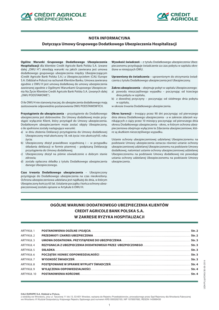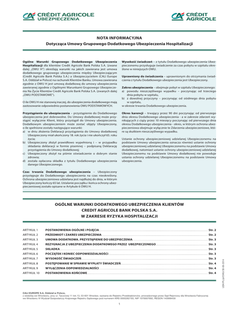 NOTA INFORMACYJNA Dotycząca Umowy Grupowego Dodatkowego Ubezpieczenia Hospitalizacji Ogólne Warunki Grupowego Dodatkowego Ubezpieczenia Hospitalizacji dla klientów Credit Agricole Bank Polska S.A. (zwane dalej „OWU H”) określają warunki na jakich zawierana jest umowa dodatkowego grupowego ubezpieczenia między Ubezpieczającym (Credit Agricole Bank Polska S.A.) a Ubezpieczycielem (CALI Europe S.A. Oddział w Polsce) na rachunek Klientów Banku. Umowa zawierana zgodnie z OWU H jest umową dodatkową do umowy ubezpieczenia zawieranej zgodnie z Ogólnymi Warunkami Grupowego Ubezpieczenia Na Życie Klientów Credit Agricole Bank Polska S.A. (zwanych dalej „OWU PODSTAWOWE”). Wysokość świadczeń – z tytułu Dodatkowego ubezpieczenia Ubezpieczonemu przysługuje świadczenie za czas pobytu w szpitalu określone w niniejszych OWU. Uprawniony do świadczenia – uprawnionym do otrzymania świadczenia z tytułu Dodatkowego ubezpieczenia jest Ubezpieczony. Zakres ubezpieczenia – obejmuje pobyt w szpitalu Ubezpieczonego: a) powodu nieszczęśliwego wypadku – poczynając od trzeciego dnia pobytu w szpitalu, b)z dowolnej przyczyny – poczynając od siódmego dnia pobytu w szpitalu, w okresie trwania Dodatkowego ubezpieczenia. O ile OWU H nie stanowią inaczej, do ubezpieczenia dodatkowego mają zastosowanie odpowiednio postanowienia OWU PODSTAWOWYCH. Przystąpienie do ubezpieczenia – przystąpienie do Dodatkowego ubezpieczenia jest dobrowolne. Do Umowy dodatkowej może przystąpić wyłącznie Klient, który przystąpił do Umowy ubezpieczenia. Dodatkowym ubezpieczeniem może zostać objęty Ubezpieczony, o ile spełnione zostały następujące warunki: a)w dniu złożenia Deklaracji przystąpienia do Umowy dodatkowej Ubezpieczony miał ukończony 18. rok życia i nie ukończył 65. roku życia; b)Ubezpieczony złożył prawidłowo wypełnioną i – w przypadku składania deklaracji w formie pisemnej – podpisaną Deklarację przystąpienia do Umowy dodatkowej; c)Ubezpieczony złożył na piśmie oświadczenie o dobrym stanie zdrowia; d)została opłacona składka z tytułu Dodatkowego ubezpieczenia danego Ubezpieczonego. Okres karencji – trwający przez 90 dni poczynając od pierwszego dnia okresu Dodatkowego ubezpieczenia - a w zakresie zdarzeń wynikających z ciąży przez 10 miesięcy poczynając od pierwszego dnia okresu Dodatkowego ubezpieczenia - okres, w którym ochrona ubezpieczeniowa obejmuje wyłącznie te Zdarzenia ubezpieczeniowe, które są skutkiem nieszczęśliwego wypadku. Ustanie ochrony ubezpieczeniowej udzielanej Ubezpieczonemu na podstawie Umowy ubezpieczenia oznacza również ustanie ochrony ubezpieczeniowej udzielanej Ubezpieczonemu na podstawie Umowy dodatkowej, natomiast ustanie ochrony ubezpieczeniowej udzielanej Ubezpieczonemu na podstawie Umowy dodatkowej nie powoduje ustania ochrony udzielanej Ubezpieczonemu na podstawie Umowy ubezpieczenia. Czas trwania Dodatkowego ubezpieczenia – Ubezpieczony przystępuje do Dodatkowego ubezpieczenia na czas nieokreślony. Ochrona ubezpieczeniowa udzielana jest najdłużej do dnia, w którym Ubezpieczony kończy 65 lat. Ustalanie początku i końca ochrony ubezpieczeniowej zostało opisane w Artykule 6 OWU H. ARTYKUŁ 1 POSTANOWIENIA OGÓLNE i POJĘCIA.. . . . . . . . . . . . . . . . . . . . . . . . . . . . . . . . . . . . . . . . . . . . . . . . . . . . . . . . . . . . . . . . . . . . . . . . . . . . . . . . . . . . . . . . . . . . . . . . . . . . . . . . . . . . . . . Str. 2 ARTYKUŁ 2 PRZEDMIOT I ZAKRES UBEZPIECZENIA������������������������������������������������������������������������������������������������������������ Str. 2 ARTYKUŁ 3 UMOWA DODATKOWA. PRZYSTĄPIENIE DO UBEZPIECZENIA���������������������������������������������������������������������������� Str. 3 ARTYKUŁ 4 REZYGNACJA Z UBEZPIECZENIA DODATKOWEGO PRZEZ UBEZPIECZONEGO����������������������������������������������������� Str. 3 ARTYKUŁ 5 SKŁADKA������������������������������������������������������������������������������������������������������������������������������������������������������� Str. 3 ARTYKUŁ 6 POCZĄTEK I KONIEC ODPOWIEDZIALNOŚCI����������������������������������������������������������������������������������������������������� Str. 3 ARTYKUŁ 7 WYSOKOŚĆ ŚWIADCZEŃ��������������������������������������������������������������������������������������������������������������������������������� Str. 3 ARTYKUŁ 8 POSTĘPOWANIE W SPRAWIE WYPŁATY ŚWIADCZEŃ�����������������������������������������������������������������������������������