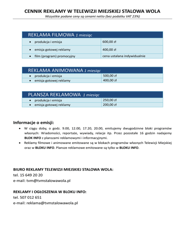 CENNIK REKLAMY W TELEWIZJI MIEJSKIEJ STALOWA WOLA Wszystkie podane ceny są cenami netto (bez podatku VAT 23%) REKLAMA FILMOWA 1 miesiąc produkcja i emisja 600,00 zł emisja gotowej reklamy 400,00 zł film (program) promocyjny cena ustalana indywidualnie REKLAMA ANIMOWANA 1 miesiąc produkcja i emisja emisja gotowej reklamy PLANSZA REKLAMOWA 500,00 zł 400,00 zł 1 miesiąc produkcja i emisja emisja gotowej reklamy 250,00 zł 200,00 zł Informacje o emisji: W ciągu doby, o godz. 9.00, 12.00, 17.20, 20.00, emitujemy dwugodzinne bloki programów własnych: Wiadomości, reportaże, wywiady, relacje itp. Przez pozostałe 16 godzin nadajemy BLOK INFO z planszami reklamowymi i informacyjnymi. Reklamy filmowe i animowane emitowane są w blokach programów własnych Telewizji Miejskiej oraz w BLOKU INFO. Plansze reklamowe emitowane są tylko w BLOKU INFO. BIURO REKLAMY TELEWIZJI MIEJSKIEJ STALOWA WOLA: tel. 15 649 20 20 e-mail: [email protected] REKLAMY I OGŁOSZENIA W BLOKU INFO: tel. 507 012 651 e-mail: [email protected]