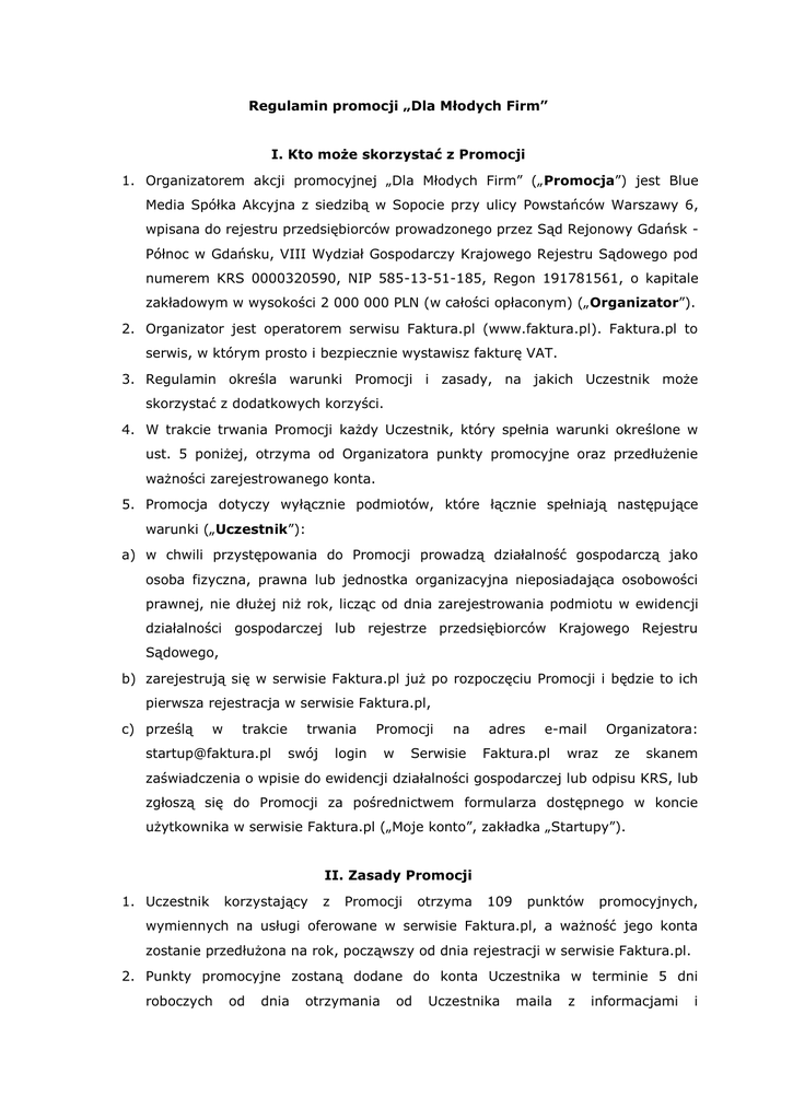 Regulamin promocji „Dla Młodych Firm” I. Kto może skorzystać z Promocji 1. Organizatorem akcji promocyjnej „Dla Młodych Firm” („Promocja”) jest Blue Media Spółka Akcyjna z siedzibą w Sopocie przy ulicy Powstańców Warszawy 6, wpisana do rejestru przedsiębiorców prowadzonego przez Sąd Rejonowy Gdańsk Północ w Gdańsku, VIII Wydział Gospodarczy Krajowego Rejestru Sądowego pod numerem KRS 0000320590, NIP 585-13-51-185, Regon 191781561, o kapitale zakładowym w wysokości 2 000 000 PLN (w całości opłaconym) („Organizator”). 2. Organizator jest operatorem serwisu Faktura.pl (www.faktura.pl). Faktura.pl to serwis, w którym prosto i bezpiecznie wystawisz fakturę VAT. 3. Regulamin określa warunki Promocji i zasady, na jakich Uczestnik może skorzystać z dodatkowych korzyści. 4. W trakcie trwania Promocji każdy Uczestnik, który spełnia warunki określone w ust. 5 poniżej, otrzyma od Organizatora punkty promocyjne oraz przedłużenie ważności zarejestrowanego konta. 5. Promocja dotyczy wyłącznie podmiotów, które łącznie spełniają następujące warunki („Uczestnik”): a) w chwili przystępowania do Promocji prowadzą działalność gospodarczą jako osoba fizyczna, prawna lub jednostka organizacyjna nieposiadająca osobowości prawnej, nie dłużej niż rok, licząc od dnia zarejestrowania podmiotu w ewidencji działalności gospodarczej lub rejestrze przedsiębiorców Krajowego Rejestru Sądowego, b) zarejestrują się w serwisie Faktura.pl już po rozpoczęciu Promocji i będzie to ich pierwsza rejestracja w serwisie Faktura.pl, c) prześlą w trakcie [email protected] trwania swój Promocji login w na Serwisie adres e-mail Faktura.pl Organizatora: wraz ze skanem zaświadczenia o wpisie do ewidencji działalności gospodarczej lub odpisu KRS, lub zgłoszą się do Promocji za pośrednictwem formularza dostępnego w koncie użytkownika w serwisie Faktura.pl („Moje konto”, zakładka „Startupy”). II. Zasady Promocji 1. Uczestnik korzystający z Promocji otrzyma 109 punktów promocyjnych, wymiennych na usługi oferowane w serwisie Faktura.pl, a ważność jego konta zostanie przedłużona na rok, począwszy od dnia rejestracji w serwisie Faktura.pl. 2. Punkty promocyjne zostaną dodane do konta Uczestnika w terminie 5 dni roboczych od dnia otrzymania od Uczestnika maila z informacjami i dokumentami, o których mowa w ust. 1 powyżej. Punkty promocyjne mogą być wykorzystane wyłącznie w serwisie Faktura.pl na usługi świadczone przez Organizatora, zgodnie z Regulaminem Faktura.pl. 3. Uczestnik nie może zamienić punktów promocyjnych na ekwiwalent pieniężny. Jeśli Uczestnik nie wykorzysta punktów promocyjnych do dnia usunięcia swojego konta w serwisie Faktura.pl, pozostałe punkty promocyjne przepadają. Punkty promocyjne przepadają również w wypadku, gdy po upływie ważności konta Uczestnik nie uiści nowej opłaty przedłużającej ważność konta Uczestnika. 4. Promocja trwa od dnia 21.03.2016r. do dnia 31.12.2017r. włącznie. 5. Niniejsza Promocja nie łączy się z innymi promocjami organizowanymi w serwisie Faktura.pl. III. Reklamacje 1. Reklamacje mogą być składane: a) drogą pisemną - osobiście u Organizatora lub za pośrednictwem operatora pocztowego, kuriera lub posłańca na adres Organizatora: ul. Powstańców Warszawy 6, 81-718 Sopot; b) drogą elektroniczną- za pośrednictwem formularza reklamacyjnego dostępnego na stronie:pomoc.bluemedia.pl/; c) ustnie - telefonicznie pod nr tel. 58 7604 844 w godzinach 8:00 - 22.00 w dni robocze oraz w soboty w godzinach 8:00 – 16:00 (połączenie płatne według stawek właściwego dla Użytkownika operatora telekomunikacyjnego) lub osobiście do protokołu u Organizatora (w godzinach od 8.00 do 16.00 w dni robocze). 2. Reklamacja powinna zawierać zwięzły i dokładny opis zgłaszanych zastrzeżeń oraz wskazanie danych Uczestnika wraz z jego adresem korespondencyjnym (np. adresem zamieszkania), z wyjątkiem sytuacji opisanych w ust. 3 i 4 poniżej. 3. Jeśli Uczestnik dostępnego na złożył reklamację stronie za pomocą pomoc.bluemedia.pl/, formularza nie musi reklamacyjnego podawać adresu korespondencyjnego. 4. Jeśli Uczestnik złożył wniosek o otrzymanie odpowiedzi na reklamację pocztą elektroniczną, podaje on adres poczty e-mail do doręczenia odpowiedzi na reklamację (o ile Organizator takiego adresu e-mail Uczestnika nie posiada). 5. Na żądanie Uczestnika, Organizator potwierdza Uczestnikowi otrzymanie reklamacji pocztą elektroniczną lub w formie pisemnej. 6. Organizator rozpatruje reklamację niezwłocznie, nie później niż w terminie 30 dni od dnia jej otrzymania. 7. W szczególnie skomplikowanych przypadkach, uniemożliwiających rozpatrzenie reklamacji i udzielenie odpowiedzi w terminie określonym w ust. 6, Organizator wyjaśnia Uczestnikowi przyczyny opóźnienia, wskazuje okoliczności, które muszą zostać ustalone dla rozpatrzenia reklamacji i wskazuje przewidywany termin rozpatrzenia reklamacji i udzielenia odpowiedzi, który nie może być dłuższy niż 60 dni od dnia otrzymania reklamacji. 8. Jeżeli reklamacja wymaga uzupełnienia zgodnie z brzmieniem ust. 2 – Organizator zwraca się do Uczestnika z prośbą o jej uzupełnienie. 9. Organizator udziela odpowiedzi na reklamację w formie papierowej na adres korespondencyjny Uczestnika, chyba że: a) Uczestnik złożył reklamację za pomocą formularza reklamacyjnego dostępnego na stronie pomoc.bluemedia.pl/- wtedy Organizator zamieszcza odpowiedź na reklamację w indywidulanym profilu reklamacyjnym Uczestnika dostępnym na stronie pomoc.bluemedia.pl/, b) Uczestnik złożył wniosek o otrzymywanie odpowiedzi pocztą elektroniczną – wtedy Organizator doręcza odpowiedź na reklamację na podany przez Uczestnika adres poczty e-mail. 10. W pozostałym zakresie do reklamacji ma zastosowanie regulamin korzystania z serwisu Faktura.pl, który Uczestnik zaakceptował zakład
