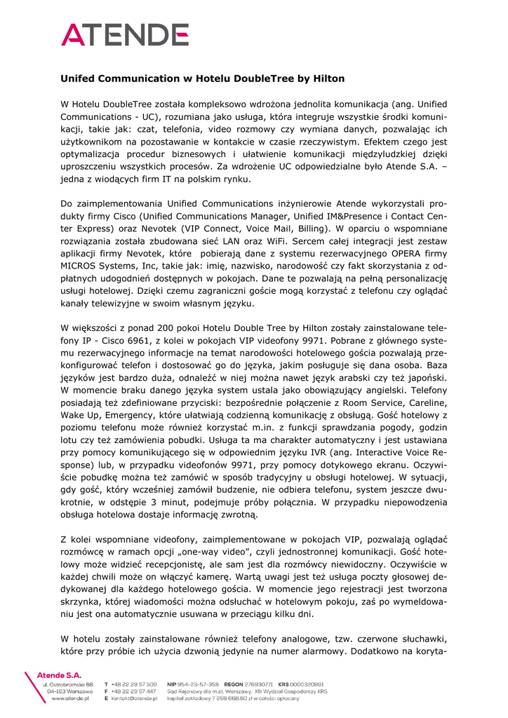 Unifed Communication w Hotelu DoubleTree by Hilton W Hotelu DoubleTree została kompleksowo wdrożona jednolita komunikacja (ang. Unified Communications - UC), rozumiana jako usługa, która integruje wszystkie środki komunikacji, takie jak: czat, telefonia, video rozmowy czy wymiana danych, pozwalając ich użytkownikom na pozostawanie w kontakcie w czasie rzeczywistym. Efektem czego jest optymalizacja procedur biznesowych i ułatwienie komunikacji międzyludzkiej dzięki uproszczeniu wszystkich procesów. Za wdrożenie UC odpowiedzialne było Atende S.A. – jedna z wiodących firm IT na polskim rynku. Do zaimplementowania Unified Communications inżynierowie Atende wykorzystali produkty firmy Cisco (Unified Communications Manager, Unified IM&Presence i Contact Center Express) oraz Nevotek (VIP Connect, Voice Mail, Billing). W oparciu o wspomniane rozwiązania została zbudowana sieć LAN oraz WiFi. Sercem całej integracji jest zestaw aplikacji firmy Nevotek, które pobierają dane z systemu rezerwacyjnego OPERA firmy MICROS Systems, Inc, takie jak: imię, nazwisko, narodowość czy fakt skorzystania z odpłatnych udogodnień dostępnych w pokojach. Dane te pozwalają na pełną personalizację usługi hotelowej. Dzięki czemu zagraniczni goście mogą korzystać z telefonu czy oglądać kanały telewizyjne w swoim własnym języku. W większości z ponad 200 pokoi Hotelu Double Tree by Hilton zostały zainstalowane telefony IP - Cisco 6961, z kolei w pokojach VIP videofony 9971. Pobrane z głównego systemu rezerwacyjnego informacje na temat narodowości hotelowego gościa pozwalają przekonfigurować telefon i dostosować go do języka, jakim posługuje się dana osoba. Baza języków jest bardzo duża, odnaleźć w niej można nawet język arabski czy też japoński. W momencie braku danego języka system ustala jako obowiązujący angielski. Telefony posiadają też zdefiniowane przyciski: bezpośrednie połączenie z Room Service, Careline, Wake Up, Emergency, które ułatwiają codzienną komunikację z obsługą. Gość hotelowy z poziomu telefonu może również korzystać m.in. z funkcji sprawdzania pogody, godzin lotu czy też zamówienia pobudki. Usługa ta ma charakter automatyczny i jest ustawiana przy pomocy komunikującego się w odpowiednim języku IVR (ang. Interactive Voice Response) lub, w przypadku videofonów 9971, przy pomocy dotykowego ekranu. Oczywiście pobudkę można też zamówić w sposób tradycyjny u obsługi hotelowej. W sytuacji, gdy gość, który wcześniej zamówił budzenie, nie odbiera telefonu, system jeszcze dwukrotnie, w odstępie 3 minut, podejmuje próby połącznia. W przypadku niepowodzenia obsługa hotelowa dostaje informację zwrotną. Z kolei wspomniane videofony, zaimplementowane w pokojach VIP, pozwalają oglądać rozmówcę w ramach opcji „one-way video”, czyli jednostronnej komunikacji. Gość hotelowy może widzieć recepcjonistę, ale sam jest dla rozmówcy niewidoczny. Oczywiście w każdej chwili może on włączyć kamerę. Wartą uwagi jest też usługa poczty głosowej dedykowanej dla każdego hotelowego gościa. W momencie jego rejestracji jest tworzona skrzynka, której wiadomości można odsłuchać w hotelowym pokoju, zaś po wymeldowaniu jest ona automatycznie usuwana w przeciągu kilku dni. W hotelu zostały zainstalowane również telefony analogowe, tzw. czerwone słuchawki, które przy próbie ich użycia dzwonią jedynie na numer alarmowy. Dodatkowo na koryta- rzach oraz w holach windowych spotkać można telefony modelu 8961, posiadające predefiniowane klawisze połączeń typu Emergency, Careline oraz Front Desk. Wdrożone telefony również pomagają w codziennej pracy obsługi hotelowej. Przykładowo pokojówki nie muszą już pisemnie wypełniać odpowiednich formularzy dotyczących stanu pokoju. Wykorzystują w tym celu połączenie z odpowiednią aplikacją i głosowo składają raport, poprzez wybranie odpowiednich opcji dopisujących wykorzystane odpłatne usługi do rachunku gościa. Funkcja ta jest realizowana dzięki dostarczonemu przez firmę Nevotek serwisowi IVR. Rozwiązania Nevotek kontrolują też dostęp gości do bezprzewodowej sieci WiFi, udostępniając każdemu z nich, na ekranie telewizora, spersonalizowanego loginu i hasła. Pozwala to dokładnie rozliczyć wykorzystanie WiFi, jeśli jest ona płatna. W przypadku łódzkiego hotelu dostęp do sieci bezprzewodowej dla gości jest darmowy. Wprowadzenie w hotelu WiFi nie należało do najprostszych zadań. Największym problemem dla inżynierów były grube ściany budynku, których mają silne właściwości wygłuszające. Niestety, jak się okazało tłumiły one również sygnał sieci WiFi. Telefony WiFi Cisco 7926, używane przez obsługę hotelową, gubiły zasięg oraz miały problemy z ponownym podpięciem się do sieci. Inżynierom Atende, poprzez odpowiedni tuning kontrolerów sieci WiFi oraz konfigurację telefonów, udało się zapewnić stabilne działanie łączności bezprzewodowej w całym obiekcie. Dzięki wykorzystanej technologii można było całkowicie zrezygnować z telefonów bezprzewodowych tzw. starej generacji, pracujących w technologii DECT. Nie było więc konieczności budowania specjalnie pod te urządzenia odpowiedniej infrastruktury. Podobnie wyglądała sytuacja w windach, gdzie zastosowano rozwiązanie WiFi MESH. W kabinie windy zainstalowano Access Point (AP), podobnie na dole i szczycie szybu windowego. AP w kabinie posiada dwa moduły radiowe – jeden do obsługi użytkowników, drugi do łączenia się z Access Pointami w szybie windy. Access Pointy w szybie windy są podłączone siecią Ethernet do infrastruktury, dzięki czemu nawet w czasie podróży z parteru na 10 piętro klient nie traci zasięgu sieci WiFi, mogąc swobodnie serfować po Internecie lub prowadzić rozmowę głosową. Dostępna w hotelu sieć została zabezpieczona w oparciu o mechanizm 802.1x, w trybie MDA (ang. Multi-Domain 