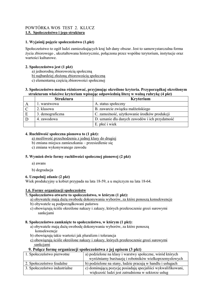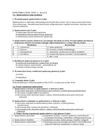 POWTÓRKA WOS TEST 2. KLUCZ 1.5. Społeczeństwo i jego struktura 1. Wyjaśnij pojęcie społeczeństwo (1.pkt) Społeczeństwo to ogół ludzi zamieszkujących kraj lub dany obszar. Jest to samowystarczalna forma Ŝycia zbiorowego , ukształtowana historycznie, połączona przez wspólne terytorium, instytucje oraz wartości kulturowe. 2. Społeczeństwo jest (1 pkt) a) jednorodną zbiorowością społeczną b) najbardziej złoŜoną zbiorowością społeczną c) elementarną częścią zbiorowości społecznej 3. Społeczeństwo moŜna róŜnicować, przyjmując określone kryteria. Przyporządkuj określonym strukturom właściwe kryterium wpisując odpowiednią literę w wolną rubrykę (4 pkt) Struktura A C E D 1. warstwowa 2. klasowa 3. demograficzna 4. zawodowa Kryterium A. status społeczny B. zawarcie związku małŜeńskiego C. zamoŜność, uŜytkowanie środków produkcji D. uznanie dla danych zawodów i ich przydatność E. płeć i wiek 4. Ruchliwość społeczna pionowa to (1 pkt): a) moŜliwość przechodzenia z jednej klasy do drugiej b) zmiana miejsca zamieszkania – przesiedlenie się c) zmiana wykonywanego zawodu 5. Wymień dwie formy ruchliwości społecznej pionowej (2 pkt) a) awans b) degradacja 6. Uzupełnij zdanie (2 pkt) Wiek produkcyjny u kobiet przypada na lata 18-59, a u męŜczyzn na lata 18-64. 1.6. Formy organizacji społeczeństw 7. Społeczeństwo otwarte to społeczeństwo, w którym (1 pkt): a) obywatele mają duŜą swobodę dokonywania wyborów, za które ponoszą konsekwencje b) obywatele są podporządkowani państwu c) obowiązują ściśle określone nakazy i zakazy, których przekroczenie grozi surowymi sankcjami 8. Społeczeństwo zamknięte to społeczeństwo, w którym (1 pkt): a) obywatele mają duŜą swobodę dokonywania wyborów, za które ponoszą konsekwencje b) obowiązują takie wartości jak pluralizm i tolerancja c) obowiązują ściśle określone nakazy i zakazy, których przekroczenie grozi surowymi sankcjami 9. Połącz formę organizacji społeczeństwa z jej opisem (3 pkt) 1. Społeczeństwo pierwotne 2. Społeczeństwo feudalne 3. Społeczeństwo industrialne a) podzielone na klasy i warstwy społeczne, wśród których wyróŜniamy burŜuazję i robotników wielkoprzemysłowych b) podzielone na stany, ludzie pracują w handlu i usługach c) dominującą pozycję posiadają specjaliści wykwalifikowani, większość ludzi jest zatrudniona w sektorze usług 4. Społeczeństwo postindustrialne 5. Społeczeństwo globalne 6. Społeczeństwo informacyjne 7. Społeczeństwo masowe 1 ...E.. 2 .G.. d) duŜe zbiorowości ludzkie, zanikają wyŜsze wartości i ideały, ludzie kierują się konsumpcją i hedonizmem e) struktura społeczna niezbyt rozbudowana, nie ma duŜych róŜnic społecznych, olbrzymią rolę odgrywały grupy oparte na pokrewieństwie f) w jego skład wchodzą wszyscy mieszkańcy Ziemi, którzy tworzą wspólnotę. Powstało dzięki rozwojowi środków masowego przekazu i telekomunikacji g) społeczeństwo zhierarchizowane, podzielone na stany, które posiadały róŜne przywileje. Społeczeństwo charakteryzujące się niewielką ruchliwością społeczną h) cechuje je powszechny dostęp do informacji oraz znakomicie rozwinięty sektor nowych usług 3 ..A.. 4 .C... 5F 6…H 7…D 1.7. Prawidłowości Ŝycia społecznego 10. System wartości to (1 pkt) a) nakazy i zakazy dotyczące zachowania się człowieka b) w miarę spójny, funkcjonalny system wartości c) ogół norm i zwyczajów określających stosunki międzyludzkie i międzynarodowe 11. Normy obyczajowe to (1 pkt) a) zasady zachowania ustanowione lub uznane za obowiązujące przez państwo b) zasady zachowania oparte na ocenach i wartościach moralnych c) nawyki zachowania uznane w danej zbiorowości 12. Wpisz w wolną kolumnę PRAWDA jeŜeli zdanie jest prawdziwe lub FAŁSZ jeŜeli jest fałszywe (3 pkt) Lp. Zdanie Prawda/Fałsz 1. 2. 3. ArbitraŜ polega na prowadzeniu rozmów między stronami konfliktu z udziałem osoby trzeciej, która zachowuje neutralność i pomaga znaleźć rozwiązanie problemu. Mediacja polega na rozstrzygnięciu konfliktu przez osobę trzecią. Obie strony konfliktu muszą podporządkować się podjętej przez tę osobę decyzji Negocjacje to rozmowy podjęte przez dwie strony konfliktu, po to by znaleźć rozwiązanie satysfakcjonujące obie strony FAŁSZ FAŁSZ PRAWDA 13. Połącz twórców róŜnych idei sprawiedliwości społecznej z ideami (4 pkt) 1.Sprawiedliwość wyrównawczo - rozdzielcza a) Franciszek z AsyŜu 2. Sprawiedliwość jako równość szans b) Robert Nazick 3. Sprawiedliwość jako cnota c) John Rawls 4. Sprawiedliwość jako uprawnienie d) Arystoteles e) Platon 1 ..D... 2 .C... 3 ..E.. 4 ..B.. 14. Do podanych poniŜej przykładów dopisz, jaki to rodzaj normy społecznej. (7. pkt) A. Nie zdradzamy swoich przyjaciół. Norma ......MORALNA......................................... B. Mówimy prawdę. Norma .........MORALNA................................................................ C. Okazujemy szacunek starszym. Norma ....OBYCZAJOWA........................................ D. Parkujemy w miejscach dozwolonych. Norma .......PRAWNA.................................. E. Nie kradniemy. Norma ……PRAWNA………………………………… F. Nie spoŜywamy mięsa w piątek. Norma …RELIGIJNA…………. G. Podajemy rękę na powitanie. Norma ……OBYCZAJOWA……….. 15. Połącz pojęcie z opisem (6 pkt) Pojęcie Opis C 1. Przystosowanie A. Uzgodnione działanie zmierzające do osiągnięcia wspólnych celów. F 2. Dezintegracja B. Spójny i hierarchicznie uporządkowany układ wartości D 3. Konflikt społ. B 4. System wartości A 5. Współpraca C. Zmiana dotychczasowych wzorców działań i kryteriów ocen w sytuacji, gdy uniemoŜliwiają one uczestnictwo w Ŝyciu zbiorowości D. Rywalizacja między jednostkami / grupami, która zachodzi wówczas gdy dochodzi do sprzeczności interesów, a realiza