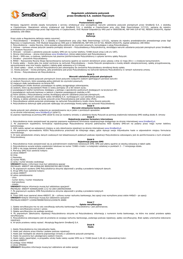 Regulamin udzielania pożyczek przez SmsBanQ S.A. osobom fizycznym Dział 1 Postanowienia ogólne Niniejszy regulamin określa zasady korzystania z serwisu smsbanq.pl oraz szczegółowe warunki udzielania pożyczek pieniężnych przez SmsBanQ S.A. z siedzibą w Częstochowie. Operatorem witryny smsbanq.pl jest SmsBanQ S.A. z siedzibą w Częstochowie przy ulicy Wały Dwernickiego 117/121, wpisana do rejestru przedsiębiorców prowadzonego przez Sąd Rejonowy w Częstochowie, XVII Wydział Gospodarczy KRS pod nr 0000358146, NIP 949-214-67-82, REGON 24161476, kapitał zakładowy 200 000zł. Dział 2 Definicje Przez użyte w Regulaminie definicje należy rozumieć: 1. Pożyczkodawca – SmsBanQ S.A. z siedzibą w Częstochowie przy ulicy Wały Dwernickiego 117/121, wpisana do rejestru przedsiębiorców prowadzonego przez Sąd Rejonowy w Częstochowie, XVII Wydział Gospodarczy KRS pod nr 0000358146, NIP 949-214-67-82, REGON 24161476, kapitał zakładowy 200 000zł. 2. Pożyczkobiorca – osoba fizyczna, która posiada pełną zdolność do czynności prawnych, korzystająca z usług Pożyczkodawcy. 3. Umowa – ramowa umowa pożyczki zawarta pomiędzy stronami – Pożyczkodawcą a Pożyczkobiorcą, określająca warunki udzielania pożyczek pieniężnych przez SmsBanQ S.A. Osobom fizycznym. 4. Wniosek – wniosek o udzielenie pożyczki wysłany SMS-em na numer telefonu 72480 (koszt smsa 2,46 zł z VAT). 5. Strona internetowa – strona internetowa www.SmsBanQ.pl, której właścicielem jest Pożyczkodawca 6. Monit – SMS-owe, e-mailowe, telefoniczne lub pisemne poinformowanie Pożyczkobiorcy o upływie terminu spłaty Pożyczki. 7. Doradca – pracownik Pożyczkodawcy 8. RRSO – Rzeczywista Roczna Stopa Oprocentowania wyliczona zgodnie ze wzorem określonym przez ustawę z dnia 12 maja 2011 r. o kredycie konsumenckim. 9. Kwota spłaty – Kwota jaka ma zostać zwrócona na rachunek Pożyczkodawcy – kwota Pożyczki powiększona o kwotę składki ubezpieczeniowej, opłatę przygotowawczą, oprocentowanie oraz inne koszty zgodnie z tabelą opłat wskazaną w § 4 Umowy. 10. Dzień spłaty – dzień, w którym Pożyczkobiorca jest zobowiązany do zwrócenia Pożyczkodawcy określonej Kwoty spłaty. 11. Kwota pożyczki – kwota pieniężna, jaka przelewana jest przez Pożyczkodawcę na rachunek bankowy Pożyczkobiorcy w ramach wykonania umowy. 12. Strona – Pożyczkodawca lub Pożyczkobiorca . Dział 3 Warunki udzielania pożyczek pieniężnych 1. Pożyczkodawca udziela pożyczek pieniężnych (kwot pożyczki) wyłącznie osobom spełniającym poniższe warunki: a) osobom fizycznym, które posiadają pełną zdolność do czynności prawnych; b) mającym stałe zameldowanie na terenie RP; c) posiadającym źródło dochodu pozwalające na spłatę zaciągniętego zobowiązania; d) osobom, które są obywatelami Polski w wieku pomiędzy 25 a 60 rokiem życia; e) posiadającym telefon komórkowy działający u jednego z operatorów publicznych działających na terytorium RP; f) posiadającym rachunek bankowy w jednym z banków posiadających siedzibę w RP; g) które zawarły z Pożyczkodawcą umowę określającą warunki udzielania pożyczek pieniężnych; h) nie posiadają żadnych zobowiązań wobec SmsBanQ S.A. wynikających z już udzielonych pożyczek. 2. Walutą, w jakiej udzielane są kwoty pożyczki przez Pożyczkodawcę jest polski złoty (PLN). 3. Pożyczkodawca udziela pożyczek przelewając na rachunek Pożyczkobiorcy środki równe Kwocie pożyczki. 4. Pożyczkobiorca dokonuje spłat pożyczek wpłacając lub przelewając Kwotę spłaty na rachunek Pożyczkodawcy. Dział 4 Warunki otrzymania kwoty pożyczki Kwota pożyczki jest udzielana wyłącznie po zarejestrowaniu się w jeden z poniższych sposobów: a) na stronie internetowej www.SmsBanQ.pl (dział 5), b) poprzez rejestrację za pomocą SMS (dział 6) oraz po wysłaniu wniosku o udzielenie Kwoty Pożyczki za pomocą wiadomości tekstowej SMS według działu 8. Umowy Dział 5 Rejestracja poprzez formularz internetowy 1. Pożyczkobiorca może zarejestrować się poprzez poprawne wypełnienie formularza rejestracyjnego dostępnego na stronie internetowej www.SmsBanQ.pl. 2. Po poprawnym wypełnieniu formularza rejestracyjnego Pożyczkobiorca otrzyma jednorazowy KOD wysłany SMS-em na podany przez niego numer telefonu komórkowego. 3. KOD należy wpisać we wskazanym miejscu w celu dokończenia rejestracji na stronie internetowej www.SmsBanQ.pl. 4. Po poprawnym wprowadzeniu KODU Pożyczkobiorca przechodzi do kolejnego etapu, gdzie wpisuje swoje indywidualne hasło w odpowiednim miejscu formularza internetowego. 5. W razie jakiejkolwiek zmiany danych osobowych lub teleadresowych podanych podczas rejestracji Pożyczkobiorca zobowiązany jest do poinformowania o tych zmianach Pożyczkodawcę. Dział 6 Rejestracja poprzez SMS 1. Pożyczkobiorca może zarejestrować się za pośrednictwem wiadomości tekstowych SMS. SMS jest płatny zgodnie ze stawką wskazaną w tabeli opłat. 2. Pożyczkobiorca wysyła kolejne wiadomości tekstowe na numer 72480 o treści i w kolejności ustalonej w punktach 3 – 7 niniejszego działu. 3. SMS-y nie mogą zawierać polskich znaków. 4. Pierwszy SMS musi zawierać kolejno: a) słowo KREDYT b) Imię c) Nazwisko d) numer PESEL e) serię i numer dowodu osobistego UWAGA!!! Każda z informacji musi być oddzielona spacją! PRZYKŁAD: KREDYT JAN KOWALSKI 80092265765 ABC123456 5. Po poprawnym wysłaniu SMS Pożyczkobiorca otrzyma odpowiedź z prośbą o przesłanie kolejnych danych. 6. Drugi SMS musi zawierać kolejno: a) słowo KREDYT b) adres zameldowania: - ulica - numer domu / numer mieszkania - kod pocztowy - miasto UWAGA!!! Kolejne informacje muszą być oddzielone spacjami! PRZYKŁAD: KREDYT KONWALIOWA 1/12 42-200 CZESTOCHOWA 7. Po poprawnym wysłaniu SMS Pożyczkobiorca otrzyma odpowiedź z prośbą o przesłanie kolejnych danych. 8. Trzeci SMS musi zawierać słowo KREDYT, 26 – cyfrowy num