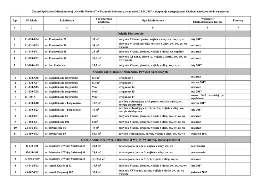 Zarząd Spółdzielni Mieszkaniowej „Osiedle Młodych” w Poznaniu informuje, że na dzień 23.01.2017 r. dysponuje następującymi lokalami użytkowymi do wynajęcia: Lp. 1 ID lokalu Lokalizacja Powierzchnia użytkowa Opis lokalu/terenu Wynajęcie lokalu/dzierżawa terenu Przetarg 2 3 4 5 6 7 Osiedle Piastowskie 1 11-020-U04 os. Piastowskie 20 33 m2 budynek XI kond, parter, wejście z ulicy, zw, cw, co, wc luty 2017 od zaraz 2 11-031-U03 os. Piastowskie 31 34 m2 budynek V kond, piwnica, wejście z ulicy, zw, cw, co, wc wspólne 3 11-045-U01 os. Piastowskie 45 23 m2 budynek V kond, piwnica, wejście z klatki, wc wspólne od zaraz 4 11-098-U02 os. Piastowskie 98 30,6 m2 budynek XI kond, piętro A, wejście z klatki, zw, cw, co, wc wspólne od zaraz 5 12-004-A09 ul. Św. Rocha 4a 23,3 m2 budynek V kond, piwnica, wejście z ulicy, zw, co, wc luty 2017 Osiedle Jagiellońskie, Oświecenia, Powstań Narodowych 1 21-130-X56 os. Jagiellońskie targowisko 8,3 m2 stragan nr 6 od zaraz 2 21-130-X67 os. Jagiellońskie targowisko 8,3 m2 stragan nr 7 marzec 2017 3 21-130-X15 os. Jagiellońskie targowisko 9 m2 stragan nr 14 od zaraz 21-130-X08 os. Jagiellońskie targowisko 9 m2 stragan nr 15 maj 2017 5 21-130-X os. Jagiellońskie targowisko 9 m2 stragan nr 17 marzec 2017 uzgodnieniu 6 21-130-U10 os. Jagiellońskie - Targowisko 13,5 m2 7 21-130-U23 os. Jagiellońskie - Targowisko 10 m2 8 21-062-U01 os. Jagiellońskie 62 65m2 budynek V kond, piwnica, wejście z ulicy, zw, cw, co, wc od zaraz 9 21-102-U01 os. Jagiellońskie 102 56m2 budynek V kond, piwnica, wejście z ulicy, zw, cw, co, wc od zaraz 10 22-016-U01 os. Oświecenia 16 45 m2 budynek V kond, piwnica, wejście z ulicy, zw, cw, co, wc od zaraz 11 22-059-U03 os. Oświecenia 59 55,7 m2 pawilon wolnostojący, parter, wejście z ulicy, zw, co, wc kwiecień 2017 4 pawilon wolnostojący nr 5, parter, wejście z ulicy, zw, energia elektryczna pawilon wolnostojący nr 18, parter, wejście z ulicy, zw, energia elektryczna marzec 2017 luty 2017 Osiedle Armii Krajowej, Bohaterów II Wojny Światowej, Rzeczypospolitej 1 42-038-U02 os. Bohaterów II Wojny Światowej 38 28,4 m2 hala targowa, box nr 2, wejście z ulicy, zw, wc po remoncie 2 42-038-U03 os. Bohaterów II Wojny Światowej 38 28,4 m2 hala targowa, box nr 3, wejście z ulicy, zw, wc po remoncie 3 42-038-U7,8,9 os. Bohaterów II Wojny Światowej 38 3 x 28,4 m2 hala targowa, box nr 7, 8, 9, wejście z ulicy, zw, wc od zaraz 4 43-042-U03 os. Armii Krajowej 42 19,3 m2 budynek V kond, piwnica, wejście z klatki, zw, cw, co, wc luty 2017 5 43-102-U02 os. Armii Krajowej 102 35,4 m2 budynek XVI kond., parter, wejście z klatki, zw, co, wc wspólne kwiecień 2017 wcześniej po Lp. 1 ID lokalu Lokalizacja 2 3 Powierzchnia użytkowa 4 Opis lokalu/terenu 5 Wynajęcie lokalu/dzierżawa terenu 6 Przetarg 7 Osiedle Armii Krajowej, Bohaterów II Wojny Światowej, Rzeczypospolitej 6 43-123-U01 os. Armii Krajowej 123 77,7 m2 budynek V kond., piwnica, wejście z ulicy, zw, cw, co, wc od zaraz 7 43-131-U01 os. Armii Krajowej 131 77,7 m2 budynek V kond., piwnica, wejście z ulicy, zw, cw, co, wc od zaraz 8 41-003-U08 os. Rzeczypospolitej 3 17,4 m2 budynek XVI kond., parter, wejście z ulicy, zw, cw, co, wc marzec 2017 9 41-063-U01 os. Rzeczypospolitej 63 13,1 m2 budynek V kond., piwnica, wejście z klatki, co od zaraz 10 41-067-U01 os. Rzeczypospolitej 66 44,5 m2 budynek V kond., piwnica, wejście z ulicy, zw, cw, co, wc po remoncie Osiedle Lecha, Czecha 1 51-039-U05 os. Lecha 39 17 m2 budynek XVI kond, parter, wejście z ulicy, zw, co, wc od zaraz 2 51-043-U45 os. Lecha 43 50 m2 pawilon wolnostojący, parter, wejście z ulicy, zw, co, wc od zaraz 3 51-121-U05 os. Lecha 121 153,4 m2 pawilon wolnostojący, parter, wejście z ulicy, zw, cw, co, wc od zaraz 4 51-122-U03 os. Lecha 122 8 m2 budynek XI kond., parter, wejście z ulicy, zw luty 2017 Osiedle Tysiąclecia 1 62-009-U10 os. Tysiąclecia 9 17,6 m2 budynek XI kond., parter, wejście z ulicy. luty 2017 2 62-030-U11 os. Tysiąclecia 30 23,6 m2 pawilon wolnostojący, piętro A, wejście z klatki, box L, zw, cw, co, wc luty 2017 wcześniej po uzgodnieniu Osiedle Stare Żegrze, Polan 1 71-036-U06 os. Stare Żegrze 36 37,5 m2 pawilon wolnostojący, piwnica, wejście z ulicy, zw, co, wc po remoncie 2 71-184-U01 os. Stare Żegrze 184 15 m2 budynek XI kond., parter, wejście z ulicy, zw, co, wc kwiecień 2017 3 72-017-U01 os. Polan 17 48,3 m2 budynek V kond., piwnica, wejście z ulicy, zw, cw, co, wc od zaraz 4 72-020-U01 os. Polan 20 48 m2 budynek V kond., piwnica, wejście z ulicy, zw, cw, co, wc kwiecień 2017 budynek V kond., parter, wejście z ulicy, zw, cw, co, wc od zaraz 5 72-033-U02 os. Polan 33 111,7 m2 Osiedle Orła Białego 1 81-004-U03 os. Orła Białego 4 34 m2 budynek XVI kond., parter, wejście z ulicy, zw, cw, co, wc po remoncie 2 81-020-U03 os. Orła Białego 20 14,8 m2 budynek XI kond., parter, wejście z ulicy, zw, cw, co, wc kwiecień 2017 wcześniej po uzgodnieniu 3 81-043-U02 os. Orła Białego 43 51,5 m2 4 81-076-U11 os. Orła Białego 76 28,2 m2 5 81-101-U03 os. Orła Białego 101 22,5 m2 budynek XVI kond., parter, wejście z ulicy, zw, cw, co, wc budynek XVI kond., parter, wejście z ulicy, zw, cw, co, wc budynek XI kond., parter, wejście z ulicy, zw, wc marzec 2017 od zaraz kwiecień 2017 Przetarg Lp. 1 ID lokalu Lokalizacja Powierzchnia użytkowa Opis lokalu/terenu Wynajęcie lokalu/dzierżawa terenu Przetarg 2 3 4 5 6 7 Osiedle Rusa 1 91-011-U05 os. Rusa 11 31 m2 budynek XVI kond., parter, wejście z ulicy, zw, cw luty 2017 2 91-094-U01 os. Rusa 94 7,8 m2 budynek V kond., wejście z klatki, piwnica, co od zaraz 3 91-131-U03 os. Rusa 131 64,1 m2 budynek XI kond., wejście z ulicy, parter, zw, cw, co, wc po remoncie Powyższy opis ma charakter informacyjny i nie stanowi oferty w rozumieniu przepisów Kodeksu Cywilnego. Informacje zawarte w powyższej tabeli mogą ulec zmianie. Wynajem lokali użytkowych w trybie przetargowym: Ofertę pisemną na