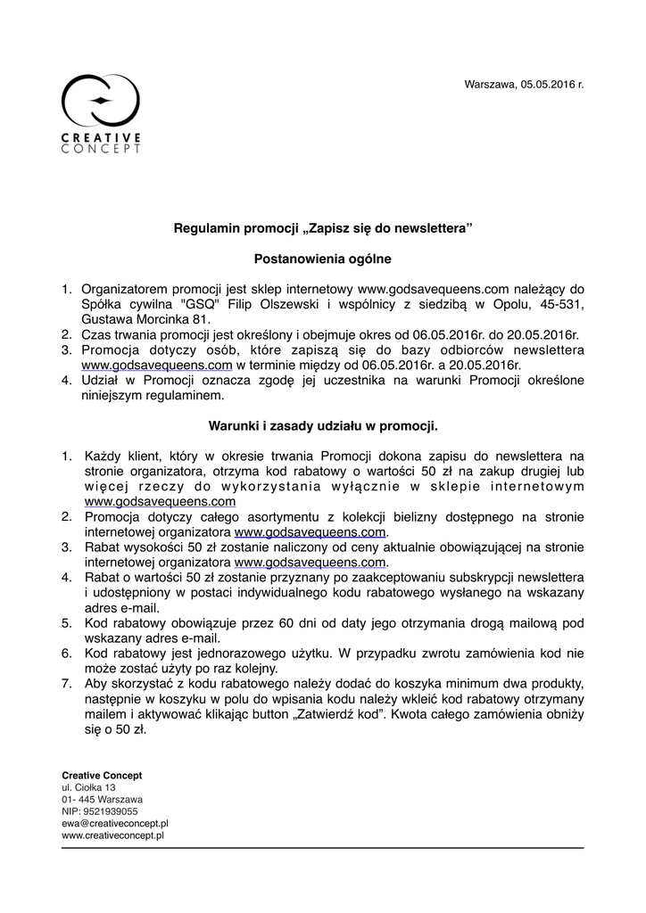 Warszawa, 05.05.2016 r. Regulamin promocji „Zapisz się do newslettera” Postanowienia ogólne 1. Organizatorem promocji jest sklep internetowy www.godsavequeens.com należący do Spółka cywilna "GSQ" Filip Olszewski i wspólnicy z siedzibą w Opolu, 45-531, Gustawa Morcinka 81. 2. Czas trwania promocji jest określony i obejmuje okres od 06.05.2016r. do 20.05.2016r. 3. Promocja dotyczy osób, które zapiszą się do bazy odbiorców newslettera www.godsavequeens.com w terminie między od 06.05.2016r. a 20.05.2016r. 4. Udział w Promocji oznacza zgodę jej uczestnika na warunki Promocji określone niniejszym regulaminem. Warunki i zasady udziału w promocji. 1. Każdy klient, który w okresie trwania Promocji dokona zapisu do newslettera na stronie organizatora, otrzyma kod rabatowy o wartości 50 zł na zakup drugiej lub więcej rzeczy do wykorzystania wyłącznie w sklepie internetowym www.godsavequeens.com 2. Promocja dotyczy całego asortymentu z kolekcji bielizny dostępnego na stronie internetowej organizatora www.godsavequeens.com. 3. Rabat wysokości 50 zł zostanie naliczony od ceny aktualnie obowiązującej na stronie internetowej organizatora www.godsavequeens.com. 4. Rabat o wartości 50 zł zostanie przyznany po zaakceptowaniu subskrypcji newslettera i udostępniony w postaci indywidualnego kodu rabatowego wysłanego na wskazany adres e-mail. 5. Kod rabatowy obowiązuje przez 60 dni od daty jego otrzymania drogą mailową pod wskazany adres e-mail. 6. Kod rabatowy jest jednorazowego użytku. W przypadku zwrotu zamówienia kod nie może zostać użyty po raz kolejny. 7. Aby skorzystać z kodu rabatowego należy dodać do koszyka minimum dwa produkty, następnie w koszyku w polu do wpisania kodu należy wkleić kod rabatowy otrzymany mailem i aktywować klikając button „Zatwierdź kod”. Kwota całego zamówienia obniży się o 50 zł. Creative Concept ul. Ciołka 13 01- 445 Warszawa NIP: 9521939055 [email protected] www.creativeconcept.pl 8. Warunkiem poprawnego naliczenia się kodu rabatowego jest dodanie do koszyka minimum dwóch produktów. 9. Towar zakupiony w Promocji podlega wymianie i zwrotom na zasadach zgodnych z Regulaminem Wymiany i Zwrotów dostępnym na stronie internetowej organizatora www.godsavequeens.com 10. W przypadku zwrotu produktu/produktów, na zakup których został udzielony rabat zgodnie z powyższymi postanowieniami, organizator zwraca tylko i wyłącznie kwotę rzeczywiście uiszczoną za zakupiony/e produkt/produkty. 11. Promocja nie obejmuje kolekcji strojów kąpielowych. Postanowienie końcowe 1. Niniejszy regulamin jest dostępny na stronie http://godsavequeens.com/pln/regulamin 2. Organizator zastrzega sobie prawo zmiany postanowień niniejszego regulaminu z ważnych przyczyn, w szczególności z przyczyn techniczno-organizacyjnych. Zmiana będzie każdorazowo ogłaszana na stronie internetowej organizatora pod adresem www.godsavequeens.com. 3. Aby wziąć udział w promocji należy się zapoznać z jego treścią i zaakceptować jego warunki. 4. W sprawach nieuregulowanych niniejszym regulaminem zastosowanie mają odpowiednie przepisy Kodeksu Cywilnego. Wszelkie spory wynikłe z tytułu wykonania zobowiązań związanych z niniejszą promocją będą rozstrzygane przez właściwy Sąd Powszechny. 5. Wszelkie reklamacje, zastrzeżenia lub uwagi dotyczące promocji mogą być składane w formie pisemnej w terminie 14 dni od zakończenia ważności kodu rabatowego na adres: [email protected]. Creative Concept ul. Ciołka 13 01- 445 Warszawa NIP: 9521939055 [email protected] www.creativeconcept.pl