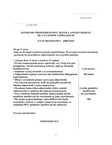 …………………………. kod pracy ucznia ………………………………………………… pieczątka WKK KONKURS PRZEDMIOTOWY JĘZYKA ANGIELSKIEGO DLA UCZNIÓW GIMNAZJUM ETAP REJONOWY– 2009/2010 Drogi Uczniu, witaj na II etapie konkursu języka angielskiego. Przeczytaj uważnie instrukcję i postaraj się prawidłowo odpowiedzieć na wszystkie pytania. • Arkusz liczy 9 stron i zawiera 13 zadań. • Przed rozpoczęciem pracy sprawdź, czy Twój test jest kompletny. Jeżeli zauważysz usterki, zgłoś je Komisji Czas pracy: Konkursowej. • Zadania czytaj uważnie i ze zrozumieniem. 90 minut • Odpowiedzi wpisuj czarnym lub niebieskim długopisem bądź piórem. • Dbaj o czytelność pisma i precyzję odpowiedzi. • Nie używaj korektora. Jeśli się pomylisz przekreśl błędną odpowiedź i wpisz poprawną. Liczba punktów • Oceniane będą tylko odpowiedzi, które zostały możliwych umieszczone w miejscu do tego przeznaczonym. do uzyskania: • Przy każdym zadaniu podano maksymalną liczbę punktów możliwych do uzyskania za jego rozwiązanie. 100 • Do etapu wojewódzkiego zakwalifikowani będą uczestnicy, którzy w etapie rejonowym uzyskają, co najmniej 85% punktów możliwych do zdobycia. Pracuj samodzielnie. POWODZENIA! 1 Zadanie 1 Przeczytaj zdania i zdecyduj czy są one prawdziwe czy fałszywe. Wpisz do tabeli literę T, jeśli zdanie jest prawdziwe lub literę F, jeśli zdanie jest fałszywe. Za każdą poprawną odpowiedź otrzymasz 1 punkt. 1. Sir Christopher Wren was an English architect. 2. Queen Elizabeth I was the daughter of Henry VII and Jane Seymour. 3. Silicon Valley is one of the most important centers of America’s computer industry. 4. The currency in the United Kingdom is euro. 5.Barack Obama is a Republican. 6. Sir William Wallace is regarded as a national hero of Wales. 7. West Point is the usual name for the famous Military Academy in the US. 8. Eton is the best-known English public school for girls. 9. The Everglades is an area of wet, warm land in Florida famous for alligators. 10. Niagara Falls are between the US and Mexico. 1. 2. 3. 4. 5. 6. 7. 8. 9. 10. ….p / 10p Zadanie 2 Do każdego nazwiska znanej osoby przyporządkuj wykonywany przez nią zawód. Wpisz odpowiednie litery od a-g w tabelkę. Dwa zawody zostały podane dodatkowo i nie pasują do żadnego nazwiska. Za każdą poprawną odpowiedź otrzymasz 1 punkt. 1. Andre Agassi a) actor 2. Oprah Winfrey b) politician 3. Daniel Radcliffe c) TV presenter 4. Mike Tyson d) writer 5. Tony Blair e) boxer f) tennis player g) scientist 1. 2. 3. 4. 5. ..….p / 5p 2 Zadanie 3 Poniżej podano wyrazy w brytyjskiej odmianie języka angielskiego. Podaj ich amerykańskie odpowiedniki. Za każdą poprawną odpowiedź otrzymasz 1 punkt. American English 1. 2. 3. 4. 5. 6. 7. 8. 9. 10. British English 1. motorway 2. tap 3. single (ticket) 4. football 5. ground floor 6. chemist’s 7. rubber 8. rubbish 9. toilet 10. lorry ..….p / 10p Zadanie 4 Przeczytaj podane wypowiedzi i zaznacz reakcję, która jest niewłaściwa w danej sytuacji. Zakreśl literę a, b, c lub d. Za każdą poprawną odpowiedź otrzymasz 1 punkt. 1. Would you like to go to the beach? a) I’d prefer to go to the cinema. b) I’d be delighted, thanks. c) I’d rather stay at home. d) I prefer going to a concert. 2. I don’t drink coffee, thank you. a) How about some tea? b) Would you like some juice then? c) Do you like tea? d) Have some juice then. 3. My ears are too big. a) Don’t worry, you look great! b) Don’t be ridiculous! c) Yes, it’s enormous! d) Come on, there’s nothing wrong with them! 4. Do you think it’s okay like that? a) Terrible! b) Terrific! c) That’s exactly it! d) That’s how it must be. 5. Could I speak to Mr Brown, please? a) Hang on, please. b) Wait for him. c) Yes, hold the line please. d) I’m afraid he’s on the other line. ..….p / 5 p 3 Zadanie 5 Jak zareagujesz po angielsku w podanych niżej sytuacjach? Napisz zwrot lub zdanie najbardziej odpowiednie w danej sytuacji. Za każdą poprawną odpowiedź otrzymasz 1 punkt. 1. Pogratuluj koledze zdania egzaminu na prawo jazdy. ……………………………………………………………………………………….….. 2.Twoi znajomi wybierają się w daleką podróż. Jakimi słowami możesz życzyć im przyjemnej podróży? …………………………………………………………………………………………... 3. Jak poprosisz siedzącego obok Ciebie przy stole Anglika o podanie cukru? …………………………………………………………………………………………… 4. Poproś przechodnia o wskazanie drogi na dworzec kolejowy. ……………………………………………………………………………………………. 5. Poradź koledze, który skręcił nogę, żeby poszedł do lekarza. ……………………………………………………………………………………………. ..….p / 5 p Zadanie 6 Przeczytaj podane definicje i wpisz właściwe wyrazy. Każda kreska zastępuje jedną literę. Nie wolno zmieniać żadnej z podanych liter. Za każdą poprawną odpowiedź otrzymasz 1 punkt. 1. a person who watches a sport or an event - s__c_____ 2. to open your mouth wide and breathe in deeply, especially when you are tired or bored - ___n 3. a person who teaches at a college or university – l _ _ _ u _ _ _ 4. a book for tourists which gives information about a town, area or country - _ _ i _ _ b _ _ _ 5. a doctor whose job is to perform operations - _ _ _ g _ _ n 6. a kind of bag filled with soft material that you put under your head when you are in bed -__l_o_ 7. a long period without rain - _ r _ _ _ _ t 8. a part of a blouse or a shirt that covers the arms or part of the arms - _ _ e _ _ e 9. the money that a person receives for the work done - _ a _ _ r _ 10. to speak very quietly into sb's ear, so that other people cannot hear what you are