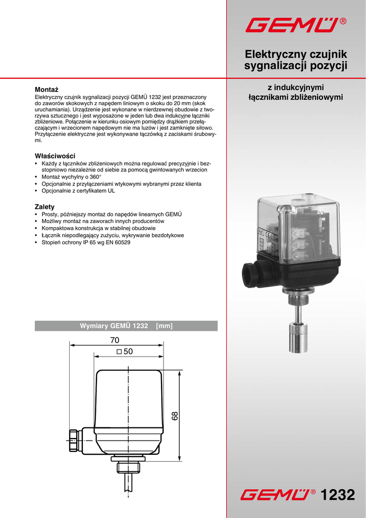 Elektryczny czujnik sygnalizacji pozycji Montaż Elektryczny czujnik sygnalizacji pozycji GEMÜ 1232 jest przeznaczony do zaworów skokowych z napędem liniowym o skoku do 20 mm (skok uruchamiania). Urządzenie jest wykonane w nierdzewnej obudowie z tworzywa sztucznego i jest wyposażone w jeden lub dwa indukcyjne łączniki zbliżeniowe. Połączenie w kierunku osiowym pomiędzy drążkiem przełączającym i wrzecionem napędowym nie ma luzów i jest zamknięte siłowo. Przyłączenie elektryczne jest wykonywane łączówką z zaciskami śrubowymi. z indukcyjnymi łącznikami zbliżeniowymi Właściwości • Każdy z łączników zbliżeniowych można regulować precyzyjnie i bezstopniowo niezależnie od siebie za pomocą gwintowanych wrzecion • Montaż wychylny o 360° • Opcjonalnie z przyłączeniami wtykowymi wybranymi przez klienta • Opcjonalnie z certyfikatem UL Zalety Prosty, późniejszy montaż do napędów linearnych GEMÜ Możliwy montaż na zaworach innych producentów Kompaktowa konstrukcja w stabilnej obudowie Łącznik niepodlegający zużyciu, wykrywanie bezdotykowe Stopień ochrony IP 65 wg EN 60529 Wymiary GEMÜ 1232 [mm] 70 □ 50 68 • • • • • 1232 Dane techniczne Warunki robocze Podłączenie elektryczne Zakres regulacji łącznika krańcowego 2 - 20 mm bezstopniowo Temperatura otoczenia -20 ... +60 Średnica kabli Zalecany przekrój żyły przewodu IP 65 EN 60529 UL PP 1.4104 PNP 3-przewod. (kod 305) Standard 24 V DC Certyfikat UL 24 V DC Opcja z LED 24 V DC ≤ 40 mA ≤ 40 mA ≤ 80 mA ≤ 24 mA ≤ 24 mA ≤ 44 mA 1 kHz 1 kHz 1 kHz 10 - 30 V DC 200 mA ≤ 2,5 V 10 - 30 V DC 200 mA ≤ 2,5 V 10 - 30 V DC 180 mA ≤ 2,5 V Schemat przyłączeniowy (kod 202) bl/bl Opcja wskaźnika LED L- L- R1 L+ L+ <1 mA ≥ 3 mA 1 kHz - Indukcyjny łącznik zbliżeniowy OTWARTY Łącznik krańcowy ZAMKNIĘTY Łącznik krańcowy OTWARTY Napięcie znamionowe Prąd znamionowy w stanie zakrytym Prąd znamionowy w stanie niezakrytym Maks. częstotliwość przełączania - bl br sw ZAMKNIĘTY sw br V2 4 br/bn V1 2 3 Podłączenie przez klienta Napięcie robocze bl/bl 1 Standard 8 V Namur Schemat przyłączeniowy (kod 303) Pozycja OTWARTY br/bn NAMUR 2-przewod. (kod 207) 1 2 R2 Napięcie znamionowe UB Pobór prądu w stanie zakrytym Pobór prądu w stanie niezakrytym Maks. częstotliwość przełączania Napięcie robocze Prąd obciążenia Spadek napięcia No. 14-M91 Szczegóły patrz www.ul.com 1.4104 Element zakrywający UL 508 C22.2 bl Opcja wskaźnika LED 3 UB = napięcie robocze / UB 0V 1 2 3 = wyjście sygnału / 0V = GND, 0V Plan przyłączania wtyczka M12, 4-stykowa, kod 304 4 1 1232 3 2 PIN 1 2 3 4 Standard L1/L+, napięcie zasilające Us, sygnał pozycji krańcowej ZAMKNIĘTY N/L-, napięcie zasilające Us, sygnał pozycji krrańcowej OTWARTY 2 Napięcie robocze Wrzeciono uruchamiające UR (recognized) CSA 1.4305 V4 Element prowadzący R4 Część dolna, polipropylen 30% GF Przełącznik Certyfikaty PSU Pozycja ZAMKNIĘTY Cześć górna, polisulfon 0,75 mm² V3 Materiały dostępna x 1 4,5 ... 7 mm R3 Stopień ochrony Łączówka z zaciskami śrubowymi M16 Opcja z LED L+, napięcie zasilające (Ub= 10-30 V DC) Us, sygnał pozycji krańcowej ZAMKNIĘTY L-, napięcie zasilające (Ub= 10-30 V DC) Us, sygnał pozycji krańcowej OTWARTY Dane do zamówienia Fieldbus Kod Bez Funkcja 000 OTWARTY/ZAMKNIĘTY NAMUR ZAMKNIĘTY NAMUR OTWARTY OTWARTY/ZAMKNIĘTY OTWARTY ZAMKNIĘTY OTWARTY/ZAMKNIĘTY OTWARTY ZAMKNIĘTY NAMUR PNP z LED PNP z LED PNP z LED PNP PNP PNP Podłączenie elektryczne Kod Dławik kablowy Skintop M16 Wtyczka M12 (tylko schemat przyłączeniowy według kodu 304) 1103 Dławik kablowy M16 Kod A00 A01 Schemat przyłączeniowy A10 Zaciski przyłączeniowe, PNP 202 303 Wtyczka M12; 4-stykowa; PNP (A3x) A11 A12 A30 304 Certyfikat A31 A32 1110 kod Zaciski przyłączeniowe, NAMUR A02 1101 Kod bez - Certyfikat UL (nie wszystkie wersje) Przełącznik NAMUR 2-przewod. (tylko schemat przyłączeniowy wg kodu 202) 3-przewod. łącznik zbliżeniowy PNP Inne przełączniki na zamówienie Przykład zamówienia Typ Fieldbus (kod) U Kod 207 305 1232 000 1232 000 Akcesoria Funkcja (kod) Przełącznik (kod) Podłączenie elektryczne (kod) Plan podłączania (kod) Certyfikat (kod) Z Z A30 A30 305 305 1101 1101 303 303 Zestaw montażowy 1232 S01Z... (wrzeciono + elementy mocujące) do zaworu. Proszę zamawiać oddzielnie! 3 1232 - - Czujnik sygnalizacji GEMÜ 1215 w połączeniu z zaworami GEMÜ uruchamia się w pozycji zaworu “OTWARTY” na 100% ; wyjątek stanowią typy serii 667, w których jest sygnalizowana pozycja zaworu “ZAMKNIĘTY” . Urządzenie jest dodatkowo wyposażone we wskaźnik optyczny. GEMÜ 1205 - czujnik sygnalizacji pozycji z mikroprzełącznikiem spełniający wymagania ATEX Elektryczny czujnik sygnalizacji pozycji GEMÜ 1205 jest wyposażony w jeden lub dwa mikroprzełączniki do sygnalizacji pozycji krańcowych. Można je mechanicznie nastawiać. Urządzenie jest przystosowane do montażu z aplikacjami zabezpieczonymi przed wybuchem zgodnie z dyrektywą ATEX. GEMÜ 1205 jest przystosowany do montażu z napędami liniowymi o maks. skoku 70 mm. GEMÜ 1201 i 1230 Czujniki sygnalizacji pozycji z mikroprzełącznikiem Elektryczne czujniki sygnalizacji pozycji GEMÜ 1201 i 1230 są wyposażone w jeden lub dwa mikroprzełączniki do sygnalizacji pozycji krańcowych. Można je mechanicznie nastawiać. GEMÜ 1201 jest przystosowany do montażu z napędami liniowymi o maks. skoku 70 mm. GEMÜ 1230 jest przystosowany do montażu z napędami liniowymi o maks. skoku 20 mm. GEMÜ 1234 i 1235/1236 Samouczące się czujniki sygnalizacji pozycji Czujniki sygnalizacji pozycji GEMÜ 1234 i GEMÜ 1235/1236 są wyposażone w automatyczny programator pozycji krańcowych oraz dodatkowo we wskaźnik optyczny w formie diod świecących dla oczekiwanego napięcia roboczego i pozycji krańcowych. GEMÜ 1211 i 1231 - czujnik sygnalizacji pozycji z łącznikiem zbliżeniowym s