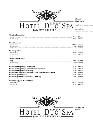 Masaż klasyczny: częściowy .................... całościowy ...................................... Masaż relaksacyjny: - częściowy ................................................................................................................... 70 zł / 25 min - całościowy ............................................................................................................... 100 zł / 50 min Masaż leczniczy: - częściowy ................................................................................................................. 100 zł / 25 min - całościowy ............................................................................................................... 140 zł / 50 min Masaż sportowy: - częściowy ................................................................................................................. 100 zł / 25 min - całościowy ............................................................................................................... 140 zł / 50 min Drenaż limfatyczny: - nogi ............................................................................................................................ 70 zł / 30 min - całościowy ................................................................................................................. 120zł / 60min Masaż aromatyczny z peelingiem .......................................................................... 120 zł / 50 min Masaż aromatyczny z masłem czekoladowym ...................................................... 120 zł / 50 min Masaż aromatyczny ze świecą ................................................................................ 120 zł / 50 min Masaż relaksacyjny z zastosowaniem olejków eterycznych ................................. 120 zł / 50 min Masaż antycellulitowy ............................................................................................... 70 zł / 30 min Masaż antycellulitowy z bańką Chińską .................................................................. 70 zł / 30 min Masaż Gorącymi Kamieniami: - częściowy .................................................................................................................. 90 zł / 50 min - całościowy .............................................................................................................. 150 zł / 90 min Zabiegi na twarz: Diamentowy lifting – ekskluzywny zabieg dla cery dojrzałej .............................................. 200 zł Uczta dla skóry – zabieg odżywczo - nawilżający z kawiorem ........................................... 120 zł Magiczne spojrzenie – zabieg przeciwzmarszczkowy na okolice oczu .................................. 90 zł Wodospad dla skóry – zabieg nawilżający dla skór przesuszonych i odwodnionych ........ 120 zł Zabieg for man – rewitalizacja i oczyszczenie cery z toksyn ............................................... 120 zł Intensywnie nawilżający, przeciwzmarszczkowy zabieg na twarz, szyję ........................... 180 zł Przeciwstarzeniowy zabieg stymulujący z odmładzającym masażem twarzy na jedwabistym lotionie ....................................................................................................................................... 190 zł Lekki zabieg napinająco - rozjaśniający na twarz, szyję i dekolt ....................................... 180 zł Luksusowy zabieg regenerujący i liftingujący ...................................................................... 200 zł Intensywny zabieg stymulująco - liftingujący ze złotem i papają ....................................... 200 zł Zabieg nawilżający przeznaczony dla cery przesuszonej, szorstkiej oraz po opalaniu (peeling, masaż twarzy, serum, alga „kozie mleko” lub „czekoladowa”) ................................................. 120 zł Zabieg anti - acne przeznaczony dla skór trądzikowych i skłonnych do wyprysków (peeling, serum, alga z glinką) .................................................................................................................. 120 zł Zabieg redukujący zaczerwienienia przeznaczony dla skór naczynkowych i skłonnych do trądziku różowatego (peeling, masaż twarzy, serum, alga z wit.C) ......................................... 120 zł Zabieg na okolicę oczu (peeling, masaż twarzy, ujędrniające płatki pod oczy, alga) ................ 80 zł Mikroder mabrazja diamento wa: twarz ............................ twarz, szyja ............................ plecy lub uda, pośladki ................................................................................................................................... 100 zł Mikrodermabrazja diamentowa + zabieg łagodzący dobrany do typu skóry: twarz ......................................................................................................................................... 110 zł twarz, szyja .............................................................................................................................. 130 zł plecy lub uda, pośladki ............................................................................................................ 200 zł Peeling kawitacyjny ................................................................ 40 zł (twarz), 60 zł (twarz +dekolt) Peeling kawitacyjny + ampułka + maska ............................................................................. 120 zł Peeling kawitacyjny + sonoforeza + ampułka .................... 80 zł (twarz), 120 zł (twarz + dekolt) Peeling kawitacyjny + sonoforeza + masaż + maska ........ 120 zł (twarz), 145 zł (twarz + dekolt) Peeling kawitacyjny do poszczególnych zabiegów ............................................................. +30 zł Masaż + sonoforeza + maska ............................................... 80 zł (twarz), 120 zł (twarz + dekolt) Photon therapy Kolory w terapii fotonowej: Czerwony - skóra s
