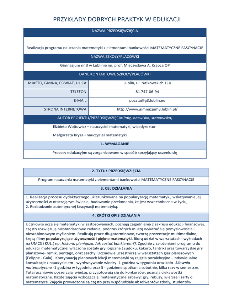 PRZYKŁADY DOBRYCH PRAKTYK W EDUKACJI NAZWA PRZEDSIĘWZIĘCIA Realizacja programu nauczania matematyki z elementami bankowości MATEMATYCZNE FASCYNACJE NAZWA SZKOŁY/PLACÓWKI Gimnazjum nr 3 w Lublinie im. prof. Mieczysława A. Krąpca OP DANE KONTAKTOWE SZKOŁY/PLACÓWKI MIASTO, GMINA, POWIAT, ULICA Lublin, ul. Nałkowskich 110 TELEFON 81 747-06-94 E-MAIL STRONA INTERNETOWA [email protected] http://www.gimnazjum3.lublin.pl/ AUTOR PROJEKTU/PRZEDSIĘWZIĘCIA(imię, nazwisko, stanowisko) Elżbieta Wojtowicz – nauczyciel matematyki, wicedyrektor Małgorzata Krysa - nauczyciel matematyki 1. WYMAGANIE Procesy edukacyjne są zorganizowane w sposób sprzyjający uczeniu się 2. TYTUŁ PRZEDSIĘWZIĘCIA Program nauczania matematyki z elementami bankowości MATEMATYCZNE FASCYNACJE 3. CEL DZIAŁANIA 1. Realizacja procesu dydaktycznego ukierunkowana na popularyzację matematyki, wskazywanie jej użyteczności w otaczającym świecie, budowanie przekonania, że jest wszechobecna w życiu, 2. Rozbudzanie autentycznej fascynacji matematyką. 4. KRÓTKI OPIS DZIAŁANIA Uczniowie uczą się matematyki w zastosowaniach, poznają zagadnienia z zakresu edukacji finansowej, często rozwiązują niestandardowe zadania, podczas których muszą wykazać się pomysłowością i nieszablonowym myśleniem. Realizują prace długoterminowe, tworzą prezentacje multimedialne, kręcą filmy popularyzujące użyteczność i piękno matematyki. Biorą udział w warsztatach i wykładach na UMCS i KUL.( np. Historia pieniądza, Jak zostać bankierem?). Zgodnie z założeniami programu do edukacji matematycznej włączone zostały gry logiczne ( sudoku, kakuro, tantrix) oraz towarzyskie gry planszowe- remik, pentago, oraz szachy. Uczniowie uczestniczą w warsztatach gier planszowych (Felippe - Gala). Kontynuacją planowych lekcji matematyki są zajęcia pozalekcyjne - indywidualne konsultacje z nauczycielem - wyrównywanie wiedzy -1 godzina w tygodniu oraz koło- Siłownia matematyczna -1 godzina w tygodniu oraz 5 - godzinne spotkania sobotnie, kilka razy w semestrze. Tutaj uczniowie poszerzają wiedzę, przygotowują się do konkursów, poznają ciekawostki matematyczne. Każde zajęcia wzbogacają matematyczne zabawy: gry, rebusy, wiersze i żarty o matematyce. Zajęcia prowadzone są często przy współudziale absolwentów szkoły, studentów matematyki, młodych pasjonatów matematyki. 5. EFEKTY 1. Bardzo dobre i dobre opanowanie podstawy programowej przez większość uczniów (na podstawie przeprowadzonych standaryzowanych testów). 2.Widoczny zapał do pogłębiania matematycznych umiejętności większości uczniów. 3. Dobra frekwencja na zajęciach pozalekcyjnych - szczególnie w czasie wolnym - soboty, ferie. 4. Zorganizowanie przez uczniów, według własnego pomysłu, szkolnej imprezy Dzień Matematykiurodziny liczby PI, na której bawiła się cała społeczność szkolna. 5. Liczny udział uczniów w konkursach o zasięgu miejskim, wojewódzkim, ogólnopolskim, zakończony sukcesami: - laureaci Ogólnopolskiej Olimpiady Matematycznej Pionier - laureaci Ogólnopolskiego Konkursu Matematycznego Edi - laureaci Ogólnopolskiego Konkursu Matematycznego Albus - finaliści i laureat Ogólnopolskiego Konkursu Matematycznego Pangea ( finał odbył się w Warszawie) - laureat Międzyszkolnego Konkursu Matematycznego dla uczniów klas pierwszych gimnazjów miasta Lublin. 6. RADY I PRZESTROGI - w ustalaniu składu takiej klasy nie sugerować się wyłącznie wysokimi ocenami z matematyki, - wskazana duża otwartość nauczyciela na sugestie uczniów odnośnie zajęć pozalekcyjnych, - realizować minimum 2 projekty edukacyjne w każdym roku nauki, oferując uczniom szeroką gamę tematów do wyboru oraz zachęcając do wymyślania własnych, uczniów najzdolniejszym motywować do podejmowania projektów badawczych, - realizację treści z zakresu edukacji finansowej wspomagać wycieczkami dydaktycznymi – banki, Giełda Papierów Wartościowych, Mennica Polska, udział w Lubelskim Festiwalu Nauki, - możliwie często rozmawiać z uczniami o zastosowaniach współczesnej matematyki w różnych dziedzinach życia, organizować spotkania z ludźmi zawodowo stosujących matematykę np. w biznesie, przekazywać uczniom aktualne dane na temat najlepiej opłacanych i najbardziej poszukiwanych zawodów, - zachować „zdrowe” proporcje miedzy nauką i zabawą. SPOSOBY UPOWSZECHNIANIA - strona internetowa szkoły, - spotkania nauczycieli matematyki z różnych szkół, w tym z doradcą metodycznym, - lekcje otwarte.