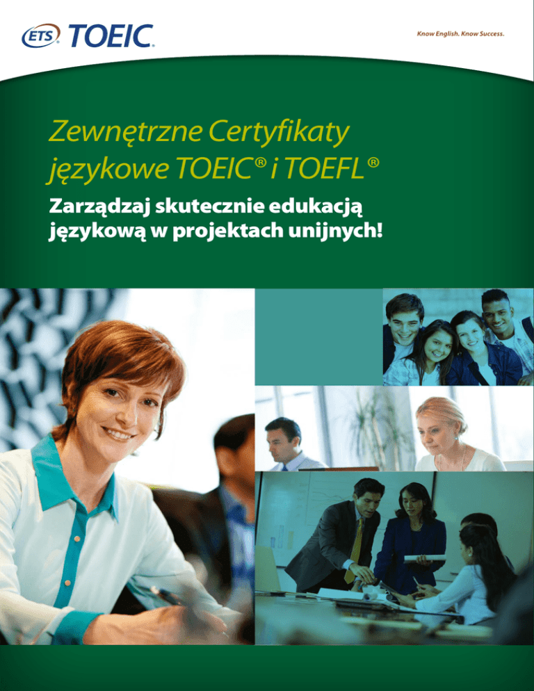 Know English. Know Success. Zewnętrzne Certyfikaty językowe TOEIC® i TOEFL® Zarządzaj skutecznie edukacją językową w projektach unijnych! Certyfikat TOEIC® Test of English for International Communication™ Światowy standard pomiaru kompetencji językowych Międzynarodowy egzamin TOEIC® jest najczęściej stosowanym w Polsce testem zewnętrznym w projektach finansowanych z Funduszy Unijnych. ~7 MILIONÓW TESTÓW ROCZNIE Jako obowiązkowy element szkoleń TOEIC® jest idealnym wskaźnikiem sukcesu projektów. Przyjazny format testu, jego rzetelność i obiektywizm, łatwość organizacji sesji egzaminacyjnych, wyniki znane w ciągu kilku dni i certyfikaty dla wszystkich zdających to czynniki, które decydują o sukcesie szkoleń zwieńczonych egzaminem TOEIC®. ŚWIATOWY LIDER OD PONAD 150 STOSOWANY W UZNAWANY PRZEZ ~14,000 KRAJACH 1979 35 lat ORGANIZACJI DLACZEGO TOEIC®? • sprawdza praktyczne umiejętności językowe • odzwierciedla naturalny sposób komunikowania się osób dorosłych w biznesie i życiu codziennym • najczęściej zdawany egzamin w środowisku pracy, cenny dodatek do CV • najbardziej przyjazny z dostępnych na rynku egzaminów • zgodny z Europejskim Systemem Opisu Kształcenia Językowego (skalą CEFR, tj. ocenami A, B, C) • każdy zdający otrzymuje Certyfikat potwierdzający posiadane umiejętności • organizowany na żądanie w dowolnych lokalizacjach i terminach • wyniki znane w 10 dni (nawet w 24 godziny) Zaufali nam: Obiektywizm. Rzetelność. Dostępność. Educational Testing Service (ETS) – największa, niezależna organizacja zajmująca się testowaniem i badaniami w obszarze języków obcych, lider w tworzeniu standardów oceny kompetencji ze szczególnym przywiązaniem do jakości i przy użyciu najnowszych osiągnięć statystyki i psychometrii. ETS odpowiada na potrzeby osób indywidualnych, uniwersytetów, korporacji, ministerstw i agencji rządowych, dostarczając swe rozwiązania do Klientów w ponad 180 krajach na całym świecie. Uczelnie: • Wyższa Szkoła Bankowa w Toruniu • Vistula University • Uniwersytet Gdański • Akademia Marynarki Wojennej • Politechnika Lubelska • Uniwersytet Przyrodniczy we Wrocławiu • Uniwersytet Rzeszowski • Politechnika Białostocka Firmy: • • • • Accenture Airbus BZ WBK Renault • • • • Lafarge LGE Lilly Elly Air France • • • • NEC FedEx Unilever TP S.A. i wiele innych… • • • • WARBUD S.A. Leroy Merlin Lafarge Polska Schenker Polska TOEIC® to lider w testowaniu już od podstawowych poziomów znajomości języka angielskiego Sesje egzaminacyjne: Wyniki: • organizowane na żądanie w dowolnych terminach i lokalizacjach • łatwość administracji - egzamin pisemny i/lub ustny • wykwalifikowani egzaminatorzy ETS (bez dodatkowych opłat) • brak podziału na grupy językowe według poziomów zaawansowania - łatwość planowania sesji i oszczędność czasu koordynatorów projektów • szczegółowe raporty wyników • Certyfikaty dla wszystkich zdających, różne kolory zależnie od poziomu Przygotowanie do egzaminów: • • • • bezpłatne testy przykładowe i materiały przygotowujące pełny, próbny test TOEIC® za darmo: www.testujangielski.pl bezpłatne materiały pomocnicze dla nauczycieli bezpłatne szkolenia dla nauczycieli w projekcie (stacjonarne i online) Uznanie egzaminu TOEIC®: • Służba Cywilna - potwierdzenie poziomu B2 w postępowaniu kwalifikacyjnym • Ponad 14 000 firm i organizacji na całym świecie • Kluczowi pracodawcy w Polsce i na świecie, m.in. BZ WBK, LG, Novartis, Warbud SA, Lafarge Polska, Schenker Polska Sp. z o.o., Elektrobudowa S.A. i wielu innych • Piloci wycieczek i przewodnicy - potwierdzenie kompetencji językowych • Zaliczenie lektoratów na uczelniach Egzaminy najczęściej stosowane w projektach EFS: Nazwa egzaminu Język Kontekst Poziomy CEFR Skala ocen Czas trwania Dostępność TOEIC® L&R angielski środowisko pracy i życie codzienne od A1 do C1 10 - 990 120 min Na żądanie i w sesjach otwartych TOEIC® Bridge™ angielski ogólny od A1 do B1 20 -180 punktów 60 min Na żądanie i w sesjach otwartych WiDaF® niemiecki biznes od A2 do C2 0 - 990 150 min Na żądanie WiDaF® Basic niemiecki środowisko pracy i życie codzienne od A1 do B1 punktów 0 - 180 60 min Na żądanie TFI™ francuski środowisko pracy i życie codzienne od A2 do C1 10 - 990 110 min Na żądanie i w sesjach otwartych punktów punktów punktów Inne dostępne egzaminy ETS: TOEIC® Speaking & Writing, TOEFL iBT®, TOEFL Junior® Produkty wspomagające nauczanie: podręczniki i materiały online, platforma e-learningowa Chętnie pomożemy w wyborze właściwych narzędzi dla wybranej grupy docelowej w projekcie! Projekty finansowane z EFS to nasza specjalność! Ponad egzaminów TOEIC® w ponad 300 zrealizowanych projektach, m.in.: Nazwa projektu Yes, you can! Ty też możesz ukończyć certyfikowany kurs języka angielskiego dla pracujących kobiet i mężczyzn Egzamin TOEIC® Bridge™ TOEIC® L&R Szkolenia językowe dla małopolskich przedsiębiorców i ich pracowników TOEIC® L&R WiDaF® Kobiety i mężczyźni pracujący na współczesnym rynku pracy TOEIC® L&R WiDaF® Wsparcie językowe na potrzeby EURO 2012 - współpraca międzynarodowa policji TOEIC® L&R Nowoczesne umiejętności dla pracowników Małopolski z terenów wiejskich TOEIC® L&R Szkolenia z języka angielskiego dla Kół Gospodyń Wiejskich realizowane na terenie województwa dolnośląskiego TOEIC® Bridge™ Język angielski Twoją szansą na sukces TOEIC® Bridge™ Kompetentny znaczy otwarty na zmiany TOEIC® Bridge™ TOEIC® L&R WiDaF® Zdobycie kwalifikacji szansą na zmianę zawodu WiDaF® Basic Wyrównanie szans uczniów gimnazjów wiejskich Opolszczyzny Podniesienie kompetencji językowych drogą do wzmocnienia bezpieczeństwa na EURO 2012 TOEIC® L&R Profesjonalista na rynku gastronomicznym TOEIC® Bridge™ WiDaF® Basic