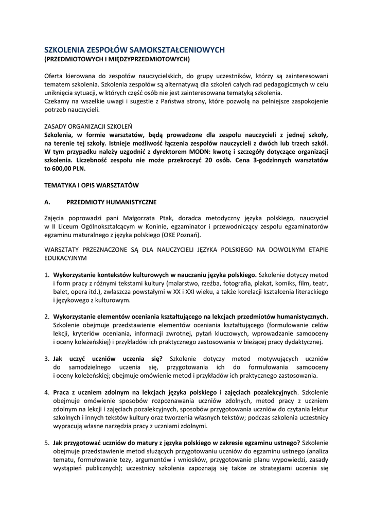 SZKOLENIA ZESPOŁÓW SAMOKSZTAŁCENIOWYCH (PRZEDMIOTOWYCH I MIĘDZYPRZEDMIOTOWYCH) Oferta kierowana do zespołów nauczycielskich, do grupy uczestników, którzy są zainteresowani tematem szkolenia. Szkolenia zespołów są alternatywą dla szkoleń całych rad pedagogicznych w celu uniknięcia sytuacji, w których część osób nie jest zainteresowana tematyką szkolenia. Czekamy na wszelkie uwagi i sugestie z Państwa strony, które pozwolą na pełniejsze zaspokojenie potrzeb nauczycieli. ZASADY ORGANIZACJI SZKOLEŃ Szkolenia, w formie warsztatów, będą prowadzone dla zespołu nauczycieli z jednej szkoły, na terenie tej szkoły. Istnieje możliwość łączenia zespołów nauczycieli z dwóch lub trzech szkół. W tym przypadku należy uzgodnić z dyrektorem MODN: kwotę i szczegóły dotyczące organizacji szkolenia. Liczebność zespołu nie może przekroczyć 20 osób. Cena 3-godzinnych warsztatów to 600,00 PLN. TEMATYKA I OPIS WARSZTATÓW A. PRZEDMIOTY HUMANISTYCZNE Zajęcia poprowadzi pani Małgorzata Ptak, doradca metodyczny języka polskiego, nauczyciel w II Liceum Ogólnokształcącym w Koninie, egzaminator i przewodniczący zespołu egzaminatorów egzaminu maturalnego z języka polskiego (OKE Poznań). WARSZTATY PRZEZNACZONE SĄ DLA NAUCZYCIELI JĘZYKA POLSKIEGO NA DOWOLNYM ETAPIE EDUKACYJNYM 1. Wykorzystanie kontekstów kulturowych w nauczaniu języka polskiego. Szkolenie dotyczy metod i form pracy z różnymi tekstami kultury (malarstwo, rzeźba, fotografia, plakat, komiks, film, teatr, balet, opera itd.), zwłaszcza powstałymi w XX i XXI wieku, a także korelacji kształcenia literackiego i językowego z kulturowym. 2. Wykorzystanie elementów oceniania kształtującego na lekcjach przedmiotów humanistycznych. Szkolenie obejmuje przedstawienie elementów oceniania kształtującego (formułowanie celów lekcji, kryteriów oceniania, informacji zwrotnej, pytań kluczowych, wprowadzanie samooceny i oceny koleżeńskiej) i przykładów ich praktycznego zastosowania w bieżącej pracy dydaktycznej. 3. Jak uczyć uczniów uczenia się? Szkolenie dotyczy metod motywujących uczniów do samodzielnego uczenia się, przygotowania ich do formułowania samooceny i oceny koleżeńskiej; obejmuje omówienie metod i przykładów ich praktycznego zastosowania. 4. Praca z uczniem zdolnym na lekcjach języka polskiego i zajęciach pozalekcyjnych. Szkolenie obejmuje omówienie sposobów rozpoznawania uczniów zdolnych, metod pracy z uczniem zdolnym na lekcji i zajęciach pozalekcyjnych, sposobów przygotowania uczniów do czytania lektur szkolnych i innych tekstów kultury oraz tworzenia własnych tekstów; podczas szkolenia uczestnicy wypracują własne narzędzia pracy z uczniami zdolnymi. 5. Jak przygotować uczniów do matury z języka polskiego w zakresie egzaminu ustnego? Szkolenie obejmuje przedstawienie metod służących przygotowaniu uczniów do egzaminu ustnego (analiza tematu, formułowanie tezy, argumentów i wniosków, przygotowanie planu wypowiedzi, zasady wystąpień publicznych); uczestnicy szkolenia zapoznają się także ze strategiami uczenia się i możliwościami ich wykorzystania w pracy dydaktycznej (lekcje powtórzeniowe, zajęcia pozalekcyjne przygotowujące do matury). B. JĘZYK OBCY Zajęcia poprowadzi pan Marek Derenowski, dr filologii angielskiej, wykładowca w Państwowej Wyższej Szkole Zawodowej w Koninie, ekspert MODN w Koninie. WSZYSTKIE WARSZTATY SĄ PRZEZNACZONE DLA NAUCZYCIELI JĘZYKÓW OBCYCH NA DOWOLNYM ETAPIE EDUKACYJNYM 1. Zmieniająca się rola nauczyciela w klasie/klasie językowej. Szkolenie przedstawia szeroki wachlarz ról odgrywanych przez nauczycieli, a także ukazuje oczekiwania uczniowskie w odniesieniu do nauczyciela w klasie. Analizie poddane zostaną zarówno role tradycyjne, jak i bardziej alternatywne. 2. Różnice indywidualne uczniów i ich wpływ na przyswajanie języka obcego. Nie ulega wątpliwości, że różnice indywidualne uczniów mają bezpośrednie przełożenie na to, w jaki sposób przyswajają oni języki obce. Lęk językowy, strategie, motywacja, style uczenia się to tylko kilka różnic, które zostaną omówione podczas warsztatów. 3. Wykorzystanie kontekstu kulturowego w nauczaniu języków obcych. W dzisiejszym wielokulturowym świecie nie można efektywnie funkcjonować bez znajomości innych kultur. W klasie językowej kultura stanowi naturalne tło dla przyswajania języka. Dodatkowo wykorzystanie elementów kulturowych pozwala na lepsze poznanie kultury języka rodzimego. Warsztaty mają na celu przedstawienie sposobów, technik i narzędzi do wykorzystania elementów kulturowych w nauczaniu języków. 4. Najnowsze trendy w nauczaniu języków obcych. Warsztaty mają na celu przedstawienie najnowszych trendów i tendencji w językoznawstwie stosowanym. Nauczyciele mogą zapoznać się z aktualnościami ze świata językoznawstwa stosowanego. 5. Jak radzić sobie z lękiem językowym uczniów? Warsztaty mają na celu omówienie najważniejszych przyczyn występowania lęku językowego u uczniów. Najczęstszą sytuacją, w której uczniowie doświadczają lęku językowego, jest mówienie. Podczas warsztatów przedstawione zostaną efektywne techniki radzenia sobie z lękiem językowym. 6. Uczenie języka obcego w klasach o zróżnicowanym poziomie językowym. Bardzo często nauczyciele języków obcych narzekają na zbyt zróżnicowany poziom swoich uczniów, co ma negatywne przełożenie na prowadzenie zajęć. Warsztat ma na celu pokazanie, jak skutecznie projektować zajęcia tak, żeby podczas tych samych zajęć uczniowie na różnym poziomie mogli efektywnie pracować bez konieczności zakupu różnych podręczników i podziału na grupy zaawansowania. 7. Nauczanie oparte na zadaniach. Warsztaty ukazują efektywne sposoby wprowadzania nauczania opartego na zadaniach (task based teaching). Nauczyciele będą mogli zapoznać się z cyklem nauczania opartego na zadaniach i jego praktycznych zastosow