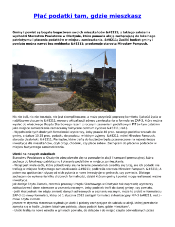 Płać podatki tam, gdzie mieszkasz Gminy i powiat są bogate bogactwem swoich mieszkańców – z takiego założenia wychodzi Starostwo Powiatowe w Olsztynie, które ponawia akcję zachęcającą do lokalnego patriotyzmu i płacenia podatków w miejscu zamieszkania. – Zasilić budżet gminy i powiatu można nawet bez meldunku – przekonuje starosta Mirosław Pampuch. Nic nie boli, nic nie kosztuje, nie jest skomplikowane, a może przynieść poprawę komfortu i jakości życia w najbliższym otoczeniu – mowa o aktualizacji adresu zamieszkania w formularzu ZAP-3, który można wysłać do właściwego Urzędu Skarbowego razem z rocznym zeznaniem podatkowym PIT (w tym ostatnim jako miejsce zamieszkania zaznaczamy faktyczne centrum życiowe – red.). - Wypełnienie tych drobnych formalności wystarczy, żeby prawie 40 proc. naszego podatku wracało do gminy, a dalsze 10,25 proc. podatku do powiatu, w którym żyjemy – mówi Mirosław Pampuch, starosta olsztyński. – Pieniądze, które trafią do budżetów będą przeznaczone na najważniejsze inwestycje dla mieszkańców, czyli drogi, chodniki, czy place zabaw. Zachęcam do płacenia podatków w miejscu faktycznego zamieszkiwania. Ulotki na nowych osiedlach Starostwo Powiatowe w Olsztynie zdecydowało się na ponowienie akcji i kampanii promocyjnej, która zachęca do lokalnego patriotyzmu i płacenia podatków w miejscu zamieszkania. - Wciąż jest wiele osób, które pobudowały się na terenie powiatu lub osiedliły się tutaj, ale ich podatki nie trafiają w miejsce faktycznego zamieszkiwania – podkreśla starosta Mirosław Pampuch. – A potem na spotkaniach słyszę od nich pytania o nowe inwestycje w gminach, czy powiecie. Dlatego zachęcam do wykonania kilku drobnych formalności, dzięki którym gminy i powiat mogą realizować ważne inwestycje. Jak dodaje Edyta Ziomek, rzecznik prasowy Urzędu Skarbowego w Olsztynie tak naprawdę wystarczy zaktualizować dane adresowe w zeznaniu rocznym, żeby podatek trafił do danej gminy, czy powiatu. - Jeśli ktoś jednak nie zdąży zmienić danych adresowych w zeznaniu rocznym, może to zrobić w formularzu ZAP-3 (to nowy formularz, który od 1 stycznia 2012 zastąpił formularz aktualizacyjny NIP-3 – red.) mówi Edyta Ziomek. Jeszcze w styczniu starostwo wydrukuje ulotki i plakaty zachęcające do udziału w akcji, której przesłanie zamyka się w haśle „Jestem lokalnym patriotą, płacę podatki tam, gdzie mieszkam". - Ulotki trafią na nowe osiedla w gminach powiatu, do sklepów i do miejsc często odwiedzanych przez mieszkańców – informuje Mariusz Kwas, dyrektor promocji olsztyńskiego starostwa. Poseł się zameldował Pozytywnym przykładem mieszkańca, który zdecydował się na zameldowanie w gminie Dywity jest poseł Janusz Cichoń. - Przez lata mieszkałem okrakiem trochę w Olsztynie, gdzie miałem mieszkanie, a trochę w Tuławkach – mówi Janusz Cichoń. – Na początku 2011 roku zameldowałem się i zaktualizowałem miejsce zamieszkania w NIP-3 na gminę Dywity. Budowa wspólnoty z miejscem i ludźmi polega właśnie na płaceniu podatków w miejscu zamieszkania. Poseł Cichoń podkreśla, że w ogólnym rozrachunku to dla samorządów poważne kwoty. - Za te pieniądze realizowane są podstawowe i ważne rzeczy, jak odśnieżanie, czy budowa chodników, a także bardziej wyrafinowane potrzeby – mówi Janusz Cichoń. Nad aktualizacją adresu zamieszkania zastanawia się poważnie także Andrzej Kuper, emerytowany dziennikarz z Warszawy, który przez siedem miesięcy w roku przebywa w siedlisku w Kabornie w gminie Purda, a przez pozostałe pięć miesięcy mieszka w stolicy. - Najbardziej sprawiedliwe byłoby uregulowanie prawne umożliwiające przekazywanie części podatku do budżetu gminy Purda i powiatu, a części do stolicy – mówi Andrzej Kuper. Akcja w 2010 roku Starostwo Powiatowe prowadziło też tzw. akcję meldunkową w 2010 roku. Zachętą do przemeldowania się i aktualizacji miejsca zamieszkania był system drobnych ulg w opłatach za wymianę dokumentów komunikacyjnych (prawa jazdy i dowodu rejestracyjnego). - Akcja cieszyła się dużym powodzeniem, a mieszkańcy bardzo chętnie z niej korzystali – informuje Grażyna Wasilewska, sekretarz Powiatu. – Przez cały rok w naszej akcji meldunkowej wzięło udział kilkaset osób. Drukuj