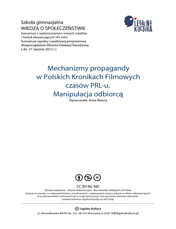 Szkoła gimnazjalna WIEDZA O SPOŁECZEŃSTWIE Scenariusz z wykorzystaniem nowych mediów i metod aktywizujących (45 min) Scenariusz zgodny z podstawą programową (Rozporządzenie Ministra Edukacji Narodowej z dn. 27 sierpnia 2012 r.). Mechanizmy propagandy w Polskich Kronikach Filmowych czasów PRL-u. Manipulacja odbiorcą Opracowała: Anna Równy CC BY-NC-ND Uznanie autorstwa - Użycie niekomercyjne - Bez utworów zależnych 3.0 Polska Licencja ta zezwala na rozpowszechnianie, przedstawianie i wykonywanie utworu jedynie w celach niekomercyjnych oraz pod warunkiem zachowania go w oryginalnej postaci (nie tworzenia utworów zależnych). creativecommons.org/licenses/by-nc-nd/3.0/pl ul. Marszałkowska 84/92 lok. 121, 00-514 Warszawa, e-mail: [email protected] Cele lekcji: Uczeń: - poznaje i utrwala terminy związane z systemem totalitarnym; - analizuje wybrane fragmenty Polskiej Kroniki Filmowej; - rozpoznaje przypadki łamania norm demokratycznych i ocenia ich konsekwencje; - odbiera komunikaty nadawane za pomocą środków audiowizualnych; - ćwiczy i doskonali umiejętność rozumienia tekstu czytanego; - nabywa umiejętności potrzebne do życia w społeczeństwie informacyjnym. Metody: - pogadanka; - miniwykład; - praca w grupach; - dyskusja. Środki dydaktyczne: - dostęp do Internetu; - rzutnik multimedialny/tablica interaktywna. Przygotowanie do lekcji: Uczniowie na lekcji poprzedzającej dostają pracę domową: fragment artykułu na temat Polskiej Kroniki Filmowej i pytania z nim związane. Odpowiedzi na pytania mają zapisać w zeszycie. Powiązanie z podstawą programową z wiedzy o społeczeństwie: 10. Państwo i władza demokratyczna. Uczeń: 1) wymienia podstawowe cechy i funkcje państwa; wyjaśnia, czym jest władza państwowa; 2) wskazuje różnice w sytuacji obywatela w ustroju demokratycznym, autorytarnym i totalitarnym. Przebieg lekcji: FAZA WSTĘPNA Nauczyciel podaje temat lekcji i zaczyna od wyjaśnienia pojęcia kluczowego - propaganda. Prosi uczniów o podanie ich własnych skojarzeń z tym słowem. W przypadku małej orientacji młodzieży w temacie, nauczyciel zapisuje definicję na tablicy: propaganda – działanie mające na celu szerzenie jakichś idei, doktryn (najczęściej politycznych), informacji służących poparciu własnej sprawy, a zaszkodzeniu przeciwnikowi. Propaganda posługuje się często manipulacją. (źródło: S. Kuśmierski, Świadomość społeczna, opinia publiczna, propaganda, 1987) Nauczyciel prosi kilku uczniów o odczytanie pracy domowej. Uzupełnia ich wypowiedzi wiedzą na temat historii i znaczenia Polskiej Kroniki Filmowej (miniwykład). Proponowane źródła: http://pl.wikipedia.org/wiki/Polska_Kronika_Filmowa lub monografia Polskiej Kroniki Filmowej: Marek Cieśliński, Piękniej niż w życiu. Polska Kronika Filmowa 1944 – 1994, Warszawa 2006. FAZA REALIZACYJNA Nauczyciel prezentuje uczniom zasoby strony internetowej Kronika RP (link: www.kronikarp.pl). Celem autorów portalu jest stworzenie na bazie wydań Polskiej Kroniki Filmowej i notacji filmowych Studia Filmowego Kronika z lat 1990–2010 multimedialnego portretu III RP. Nauczyciel zwraca uwagę na fakt, że niezwykła popularność Polskiej Kroniki Filmowej wśród społeczeństwa i jej ogromny zasięg (była emitowana przed każdym seansem filmowym w kinie, potem wprowadzono emisje telewizyjne), zostały wykorzystane przez władze komunistyczne jako skuteczne narzędzie propagandowe. Przykład działania mechanizmu propagandy i manipulowania widzem pokazujemy uczniom na podstawie materiałów audiowizualnych dotyczących wydarzeń na Wybrzeżu w 1970 roku, kiedy to strajkujący robotnicy zostali na rozkaz władz spacyfikowani przez milicję obywatelską. Według oficjalnych danych, podczas tzw. wydarzeń grudniowych, 44 osoby zostały zabite lub zmarły w wyniku obrażeń, liczba rannych wyniosła 1164 osoby, a aresztowanych zostało ponad 3 tysiące osób. Odnotowano również duże straty materialne. W tłumieniu zamieszek wzięło udział 5 tysięcy milicjantów i 27 tysięcy żołnierzy; kilku z nich zginęło a kilkudziesięciu zostało rannych (pogadanka nauczyciela). Nauczyciel włącza uczniom krótki komentarz historyka prof. Wojciecha Roszkowskiego ze strony internetowej Dzieje.pl, który mówi o przyczynach i przebiegu wydarzeń grudniowych (link: http://dzieje.pl/content/prof-roszkowski-grudzie%C5%84-70-by%C5%82-walk%C4%85-ogodne-%C5%BCycie). Po obejrzeniu współczesnego komentarza, uczniowie oglądają fragment Polskiej Kroniki Filmowej z grudnia 1970 roku (PKF 70/50B), tytuł sekwencji: Gdańsk i Gdynia – po wydarzeniach grudniowych (link: http://www.kronikarp.pl/szukaj,11238,tag-691051,strona-1). Nauczyciel dzieli uczniów na 4–5 grup. Każda z grup dostaje ten sam zestaw pytań. Odpowiedzi uczniów pozwolą dojść do wspólnych wniosków na temat mechanizmów działania propagandy w czasach PRL-u, manipulowania widzem, środków wyrazu wykorzystywanych przez twórców kroniki do realizacji celów programowych narzuconych przez komunistyczną władzę. Czas pracy: 5 minut. Przedstawiciele grup prezentują efekty pracy klasie. Wnioski zostają zapisane na tablicy. FAZA PODSUMOWUJĄCA Nauczyciel ustala wspólnie z uczniami za pomocą jakich zabiegów można manipulować odbiorcą tekstu czytanego lub wizualnego? Można wykorzystać opracowanie Marty Tomczyk – Maryon z książki Trener. Jak czytać gazety, 2008, s. 14. „Manipulacja może być stosowana przez następujące zabiegi: - schlebianie odbiorcy, chęć przypodobania mu się za wszelką cenę; - uzurpacyjne identyfikowanie się z czytelnikiem; - przemycenie informacji; - tendencyjne zmienianie nazw; - zniekształcone lub fałszywe przedstawianie zdarzeń; - przemilczanie lub zatajanie źródeł; - fałszowanie zdjęć, filmów/dokumentów...”. Podsumowanie rozważań i ustalenie listy środków wyrazu, z których korzystali twórcy PKF, aby realizować cele programowe: 1. Używanie